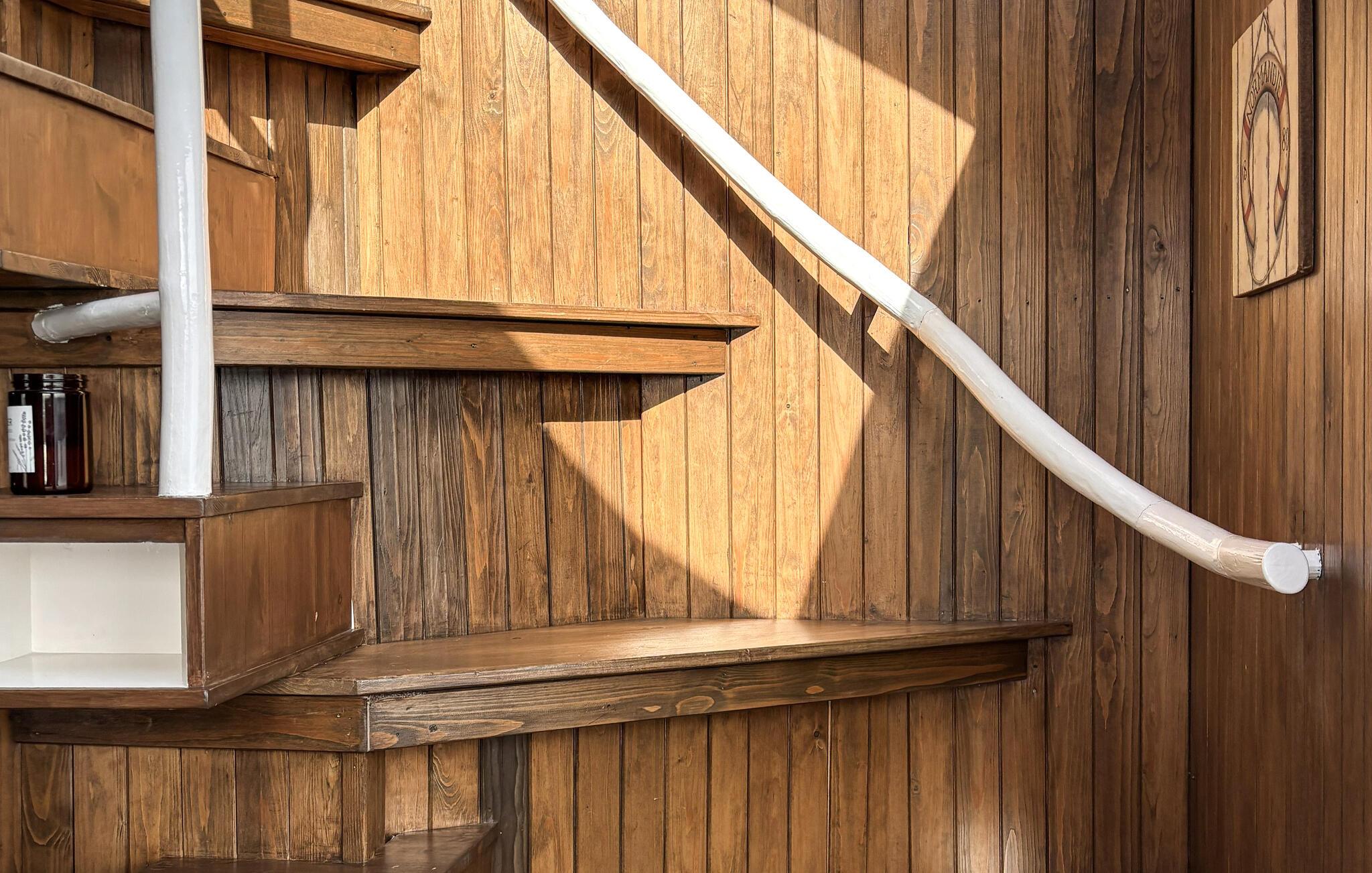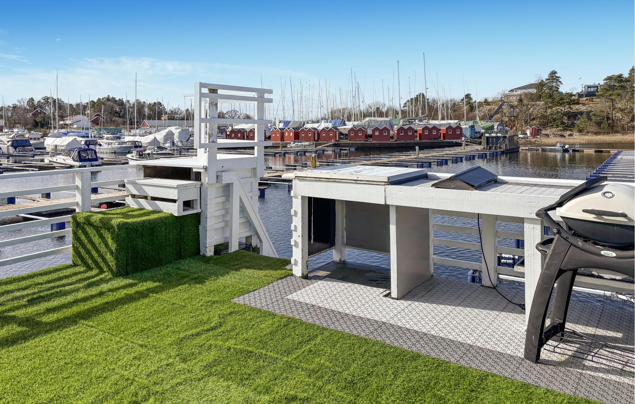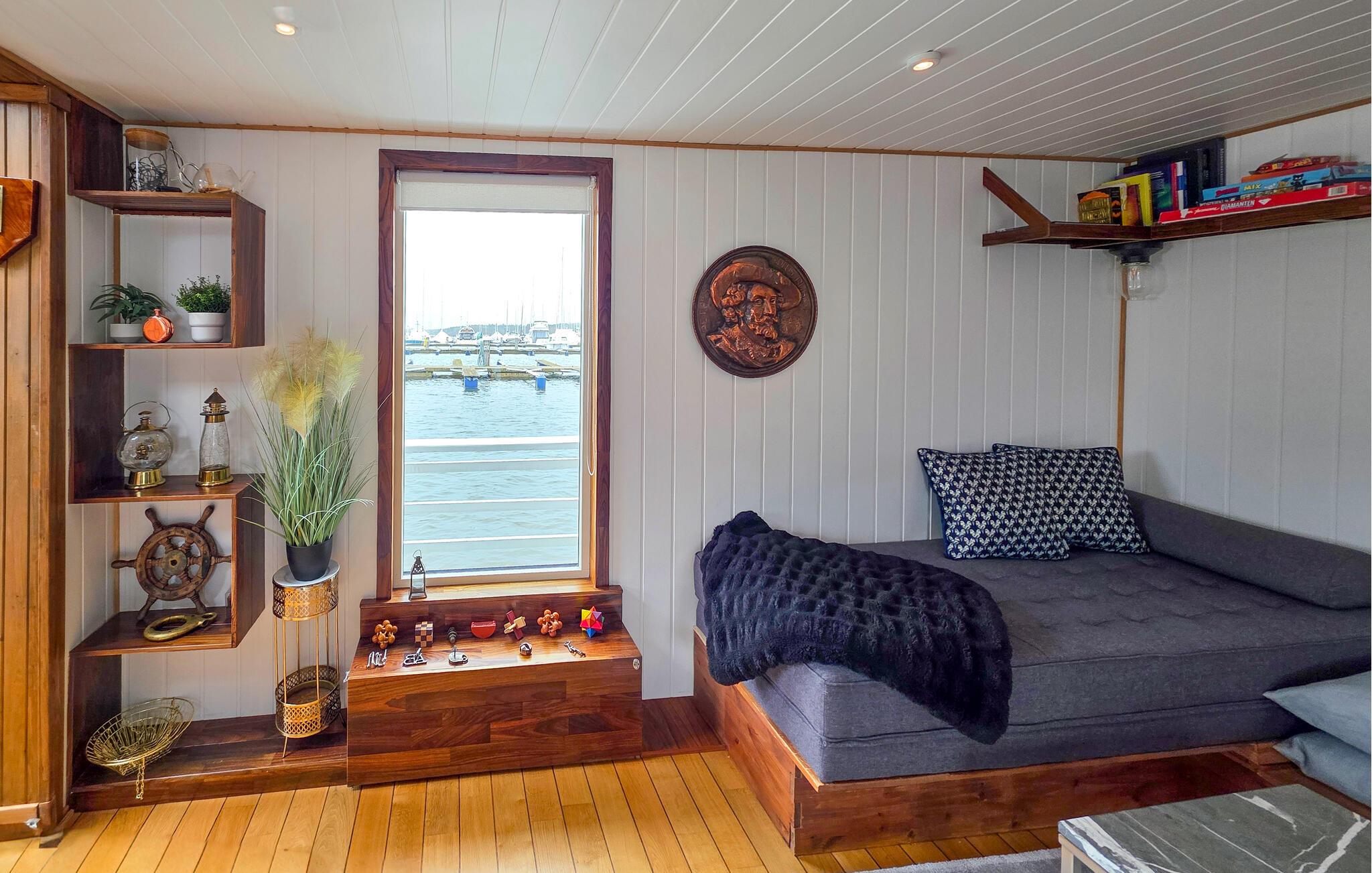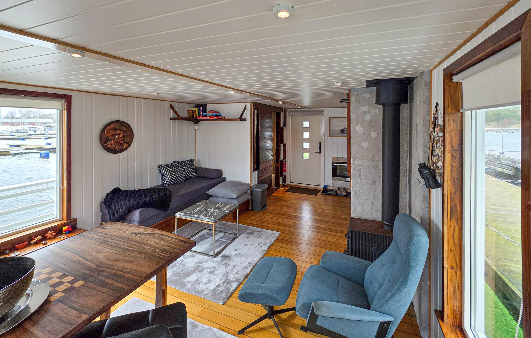 Træd udenfor, og oplev den unikke charme ved denne husbåd. Fra soveværelset kan I gå direkte ud på tagterrassen, og starte dagen i den friske luft. Slap af på liggestolene, saml jer omkring bordet eller tilbered et måltid på grillen. Nyd den rolige beliggenhed ved vandet, og se aktiviteten i havnen. Eller tag en forfriskende morgendukkert i fjorden.