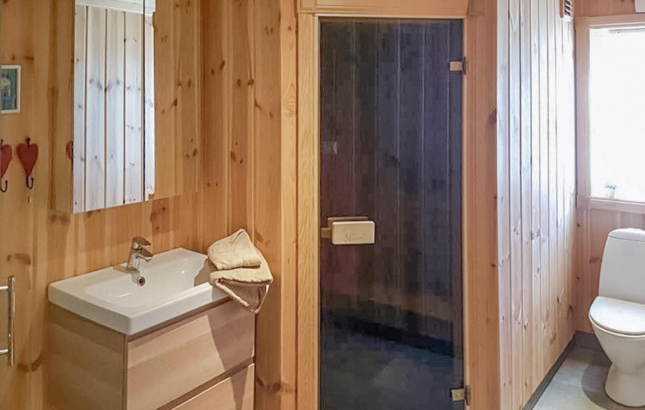Dette stilfuldt og komfortable feriehus forkæler jer med ekstraudstyr og talrige fritidsaktiviteter i umiddelbar nærhed. Arranger sjove madlavningsarrangementer i det rummelige køkken og glæd jer til omgængelige måltider i den hyggelige spiseplads. Forkæl jer selv med hyggelige stunder i saunaen, tænd brændeovnen, gør jer godt tilpas til en spilleaften i den indbydende stue eller læg fødderne op, mens I sidder tilbagelænet i læsestolen.