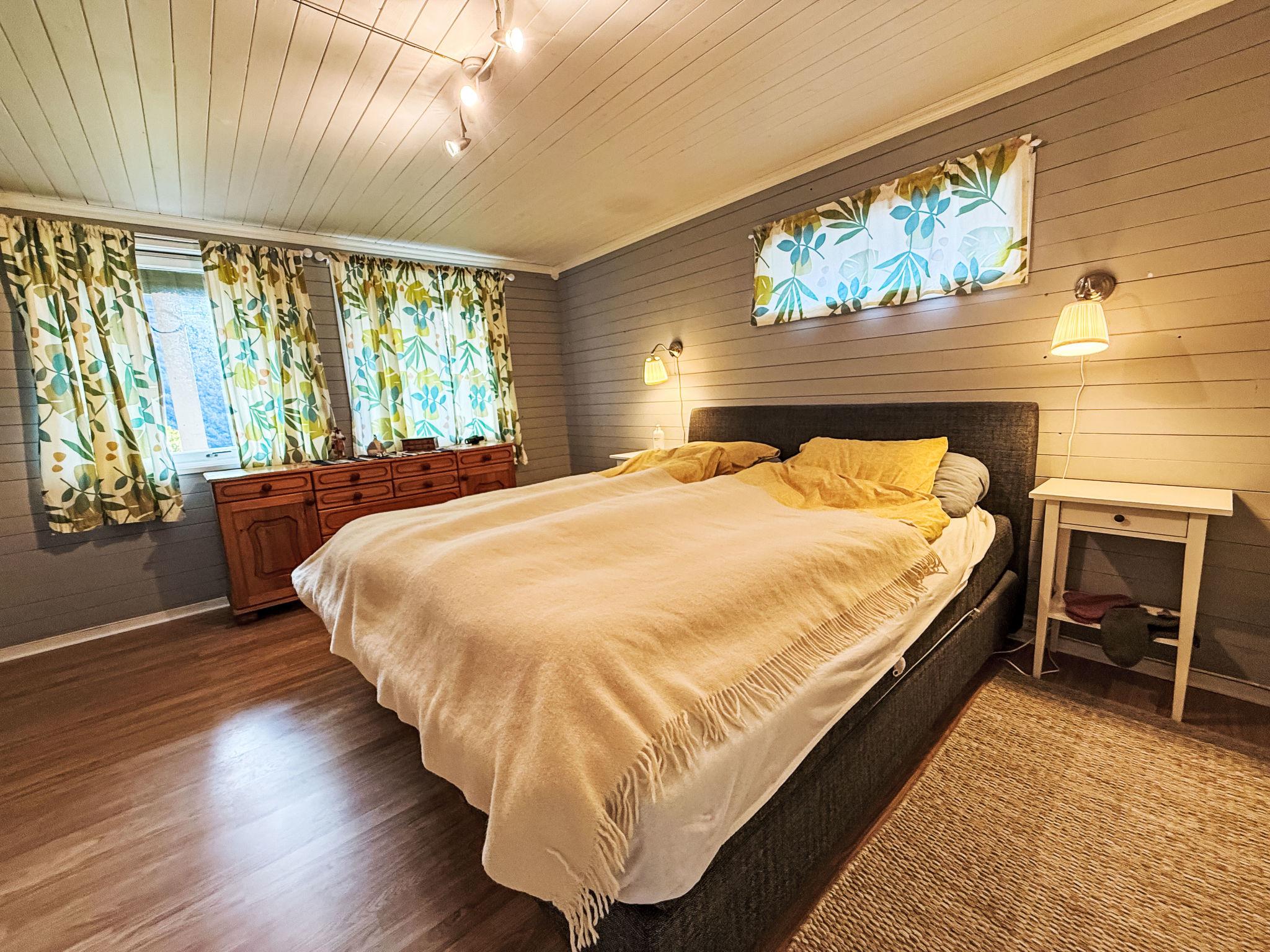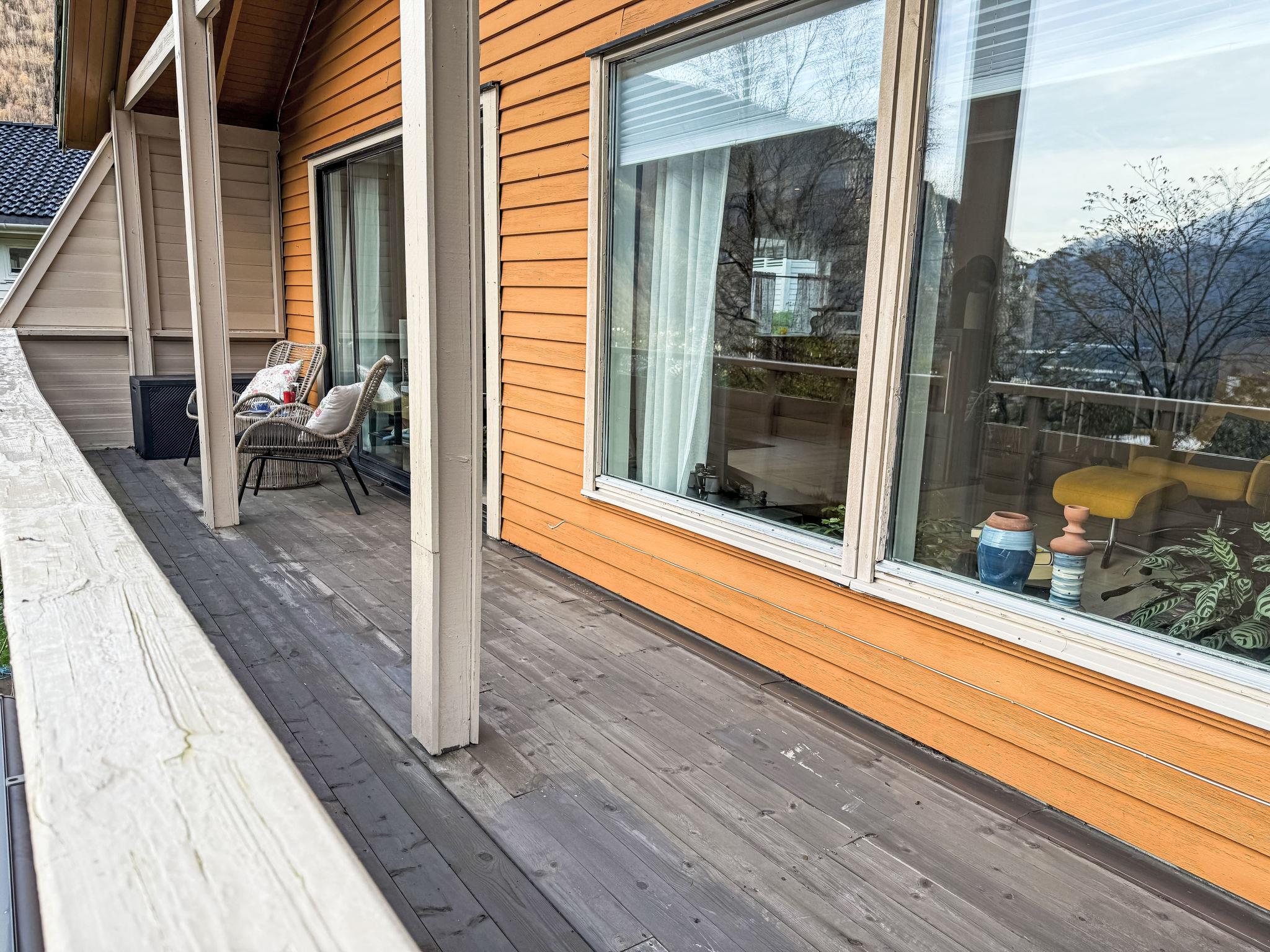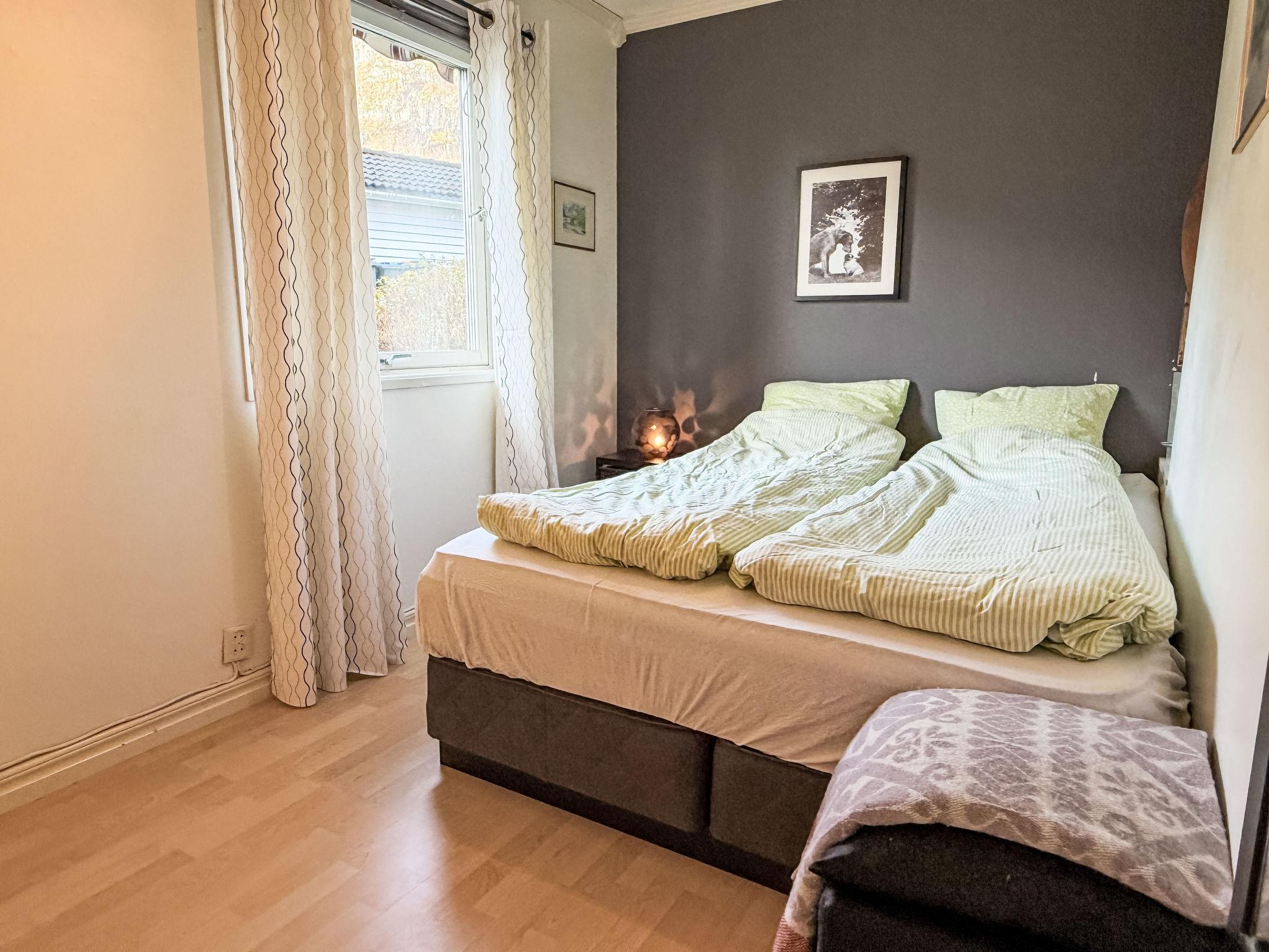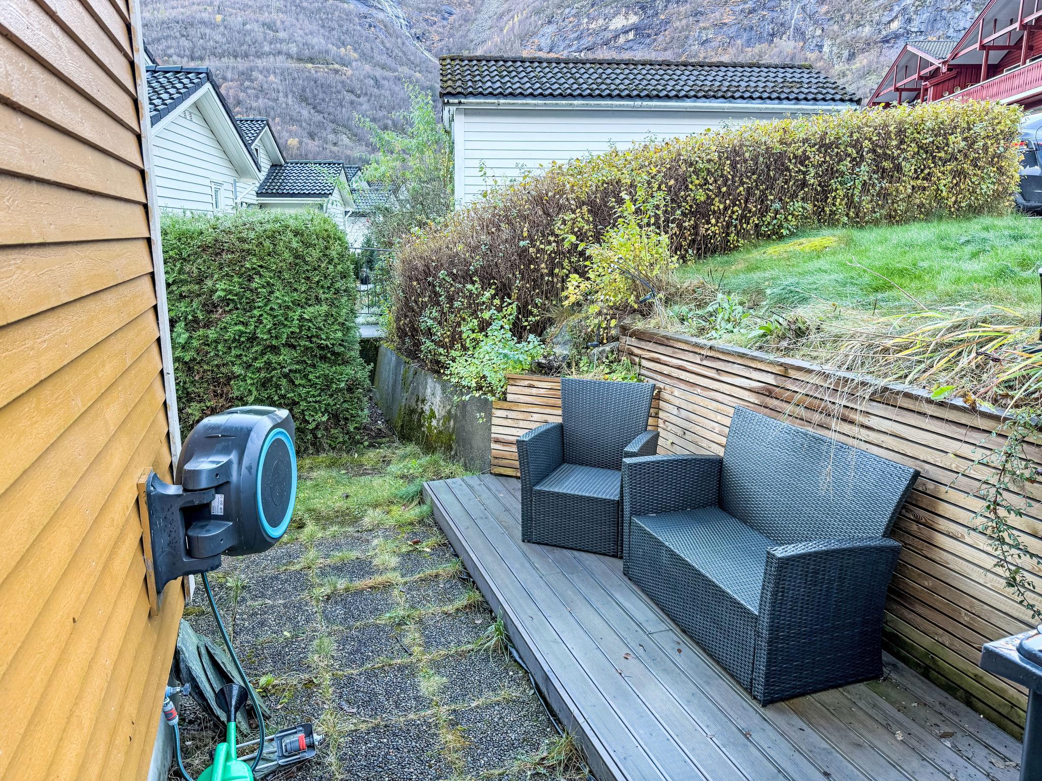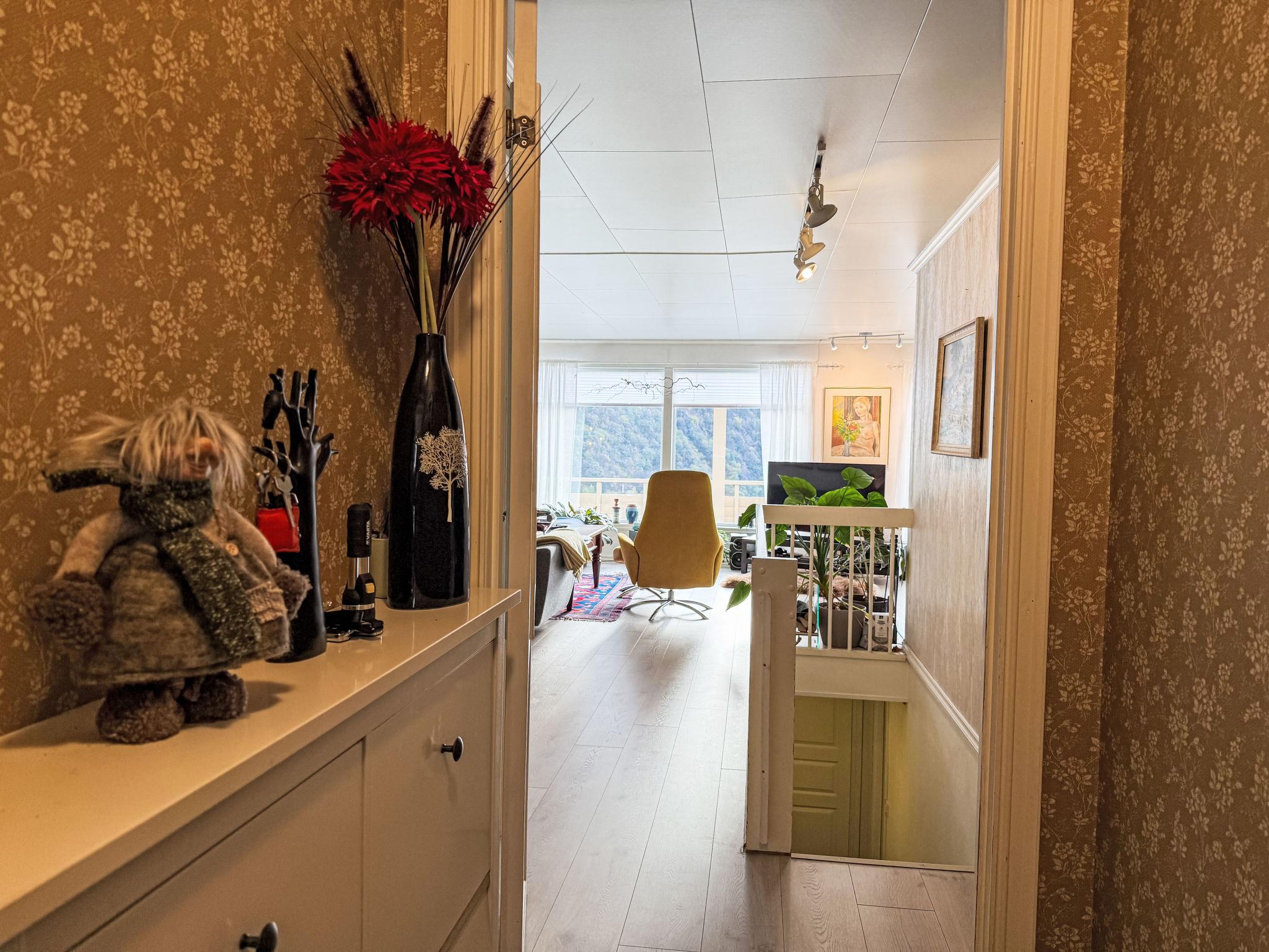 Beautiful, cosy semi-detached house "Høyanger Panorama", 2 storeys, built in 1980, renovated in 2021, surrounded by trees. 2 km from the centre of Høyanger, 35 km from the centre of Balestrand, 165 km from the centre of Bergen, in a quiet position on top of a hill, residential area (villas), traffic calmed area, 2 km from the sea, 2 km from the fijord. Private: small garden 40 m2, parking (for 2 cars) at the house, single garage. E-charging station. Grocery 2 km, supermarket 2 km, bus stop 2 km, sandy beach "Kvamsøy" 30 km, indoor swimming pool 1 km. Fishing possibilities 2 km. Please note: car recommended. Suitable for families.