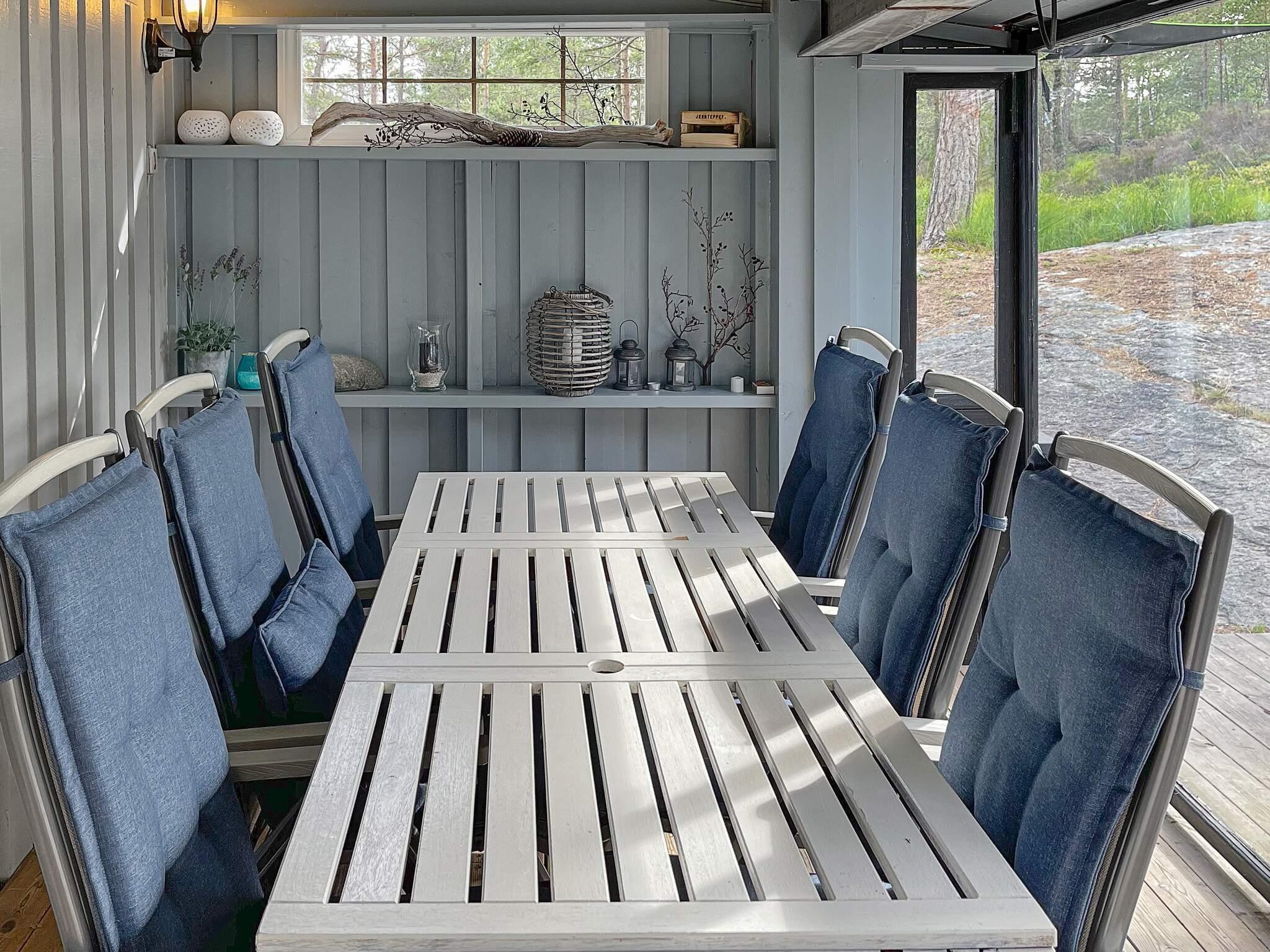 Det er innebygd veranda foran hytta, ved hovedinngangen. Her er det tre store skyvbare dører i plexiglass man kan tette igjen hele fronten med, og om våren og sommeren nyte utendørsmorgener og -kvelder uavhengig av vær. Det er også på denne siden sola går ned og gir flott lys. Her er det bord og stoler til seks personer, flere stoler ved bordet ved annekset. Varmeelement under taket.