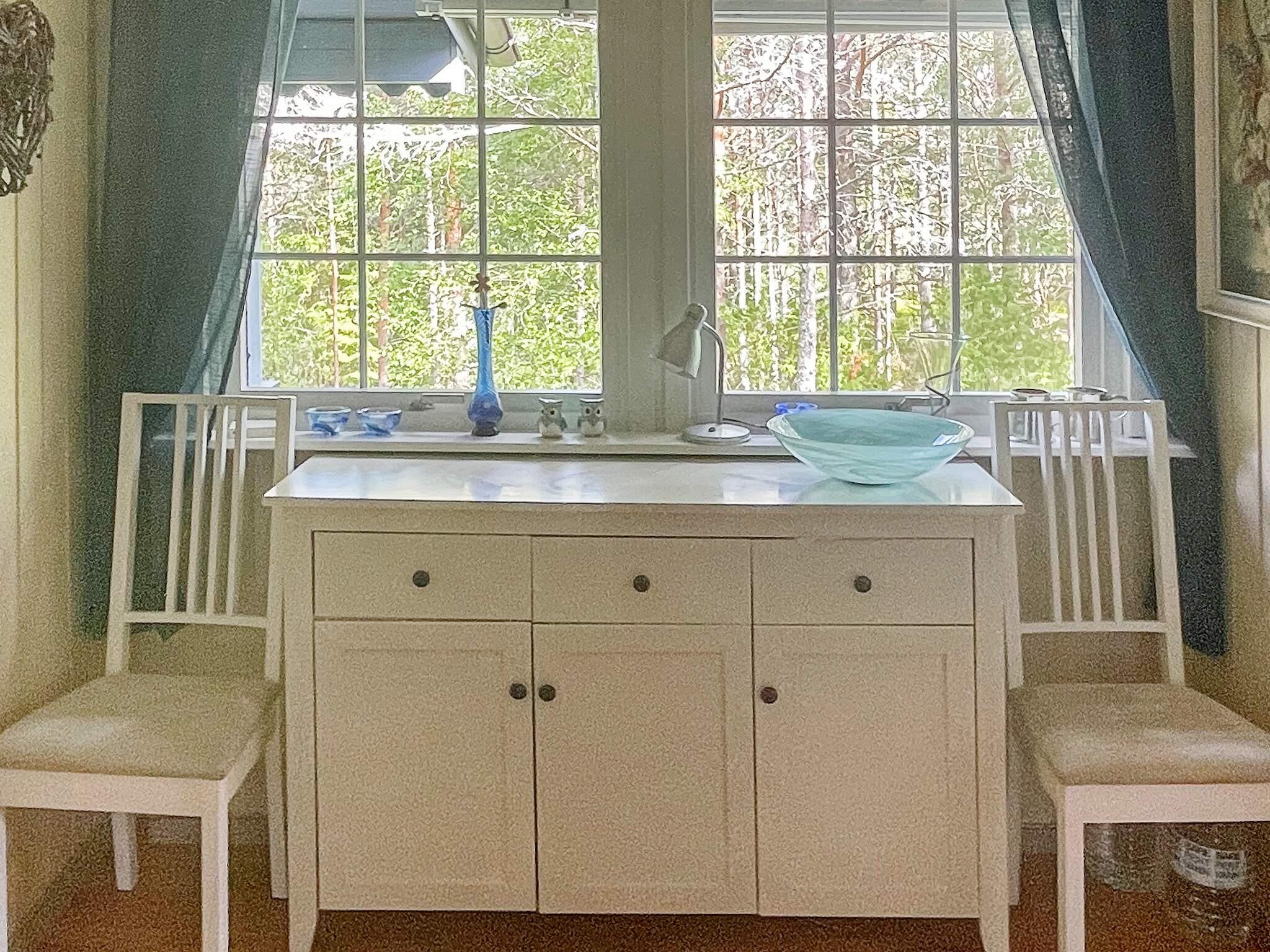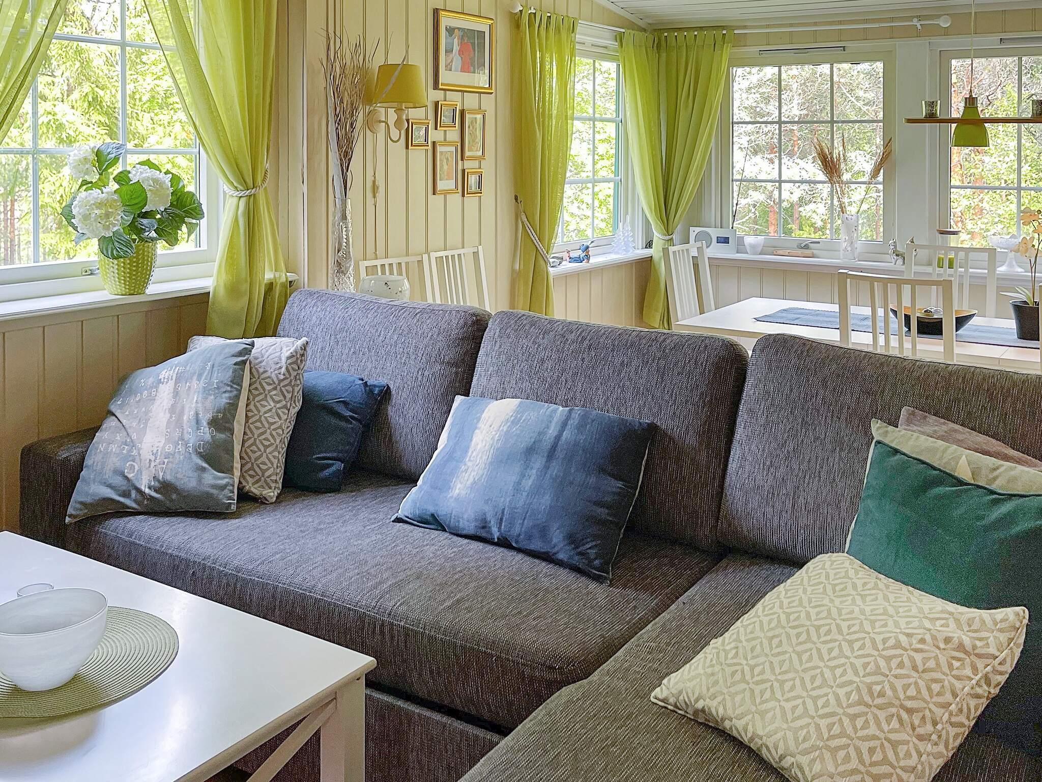 Et soverom med to køyesenger og et med dobbeltseng. I forlengelse av spisestua er det veranda med morgensol og markise. Det er masse ved i vedskjul bak hytta til bruk til peis eller bål. Det er også varmevifte i hytta som kan benyttes til varme om vinteren og kjøling om sommeren.