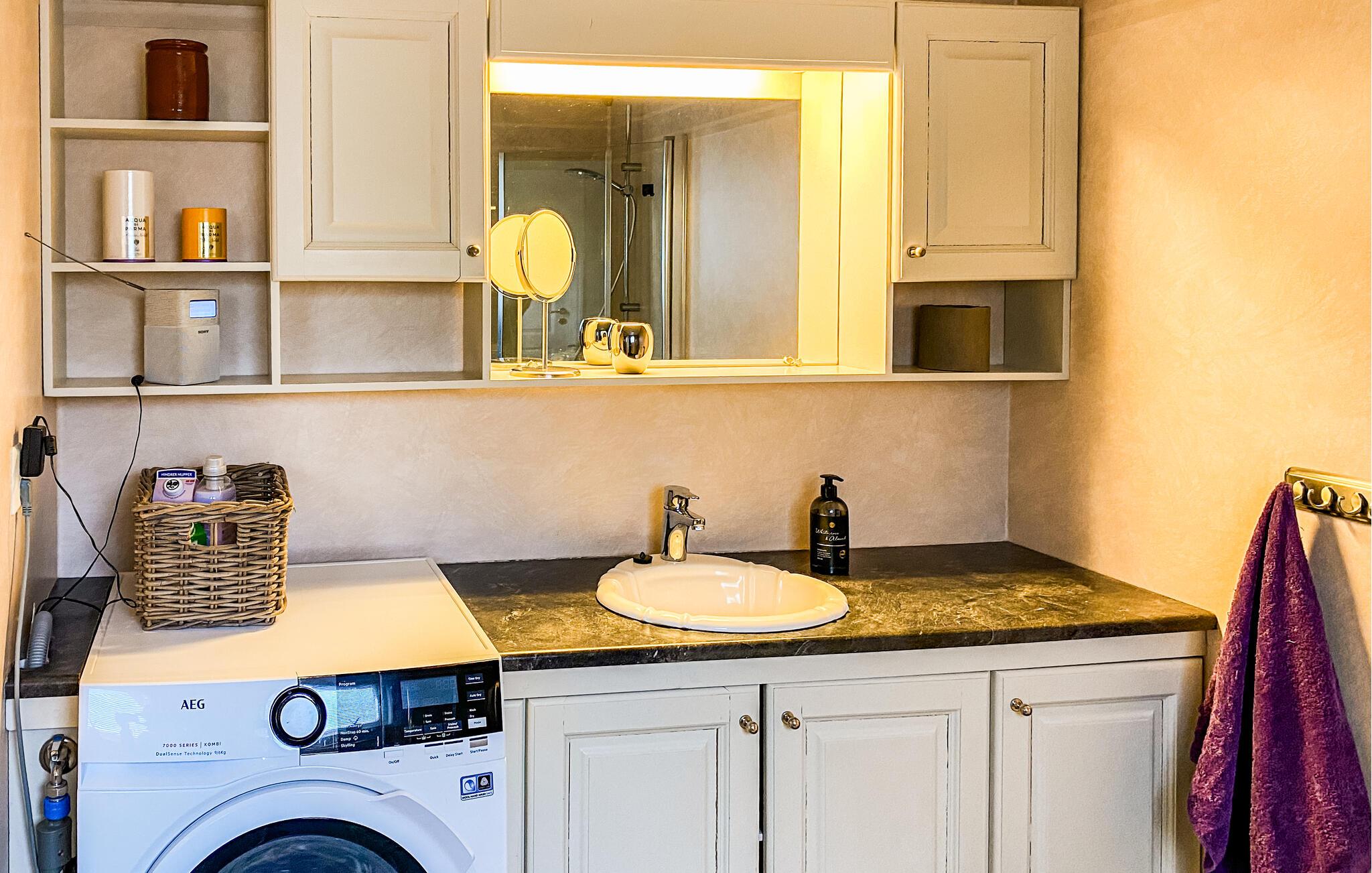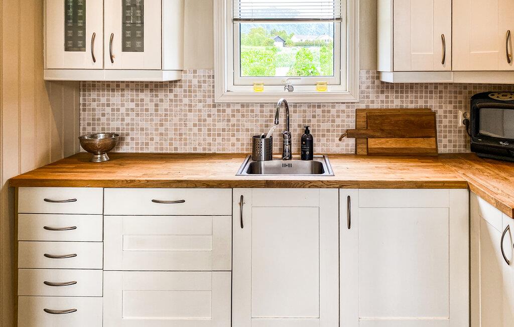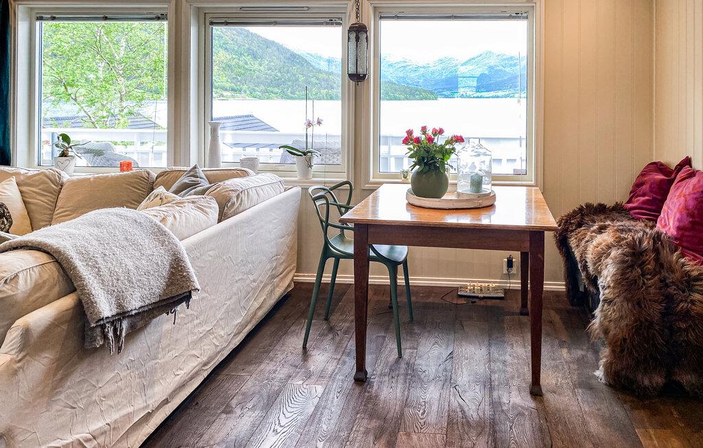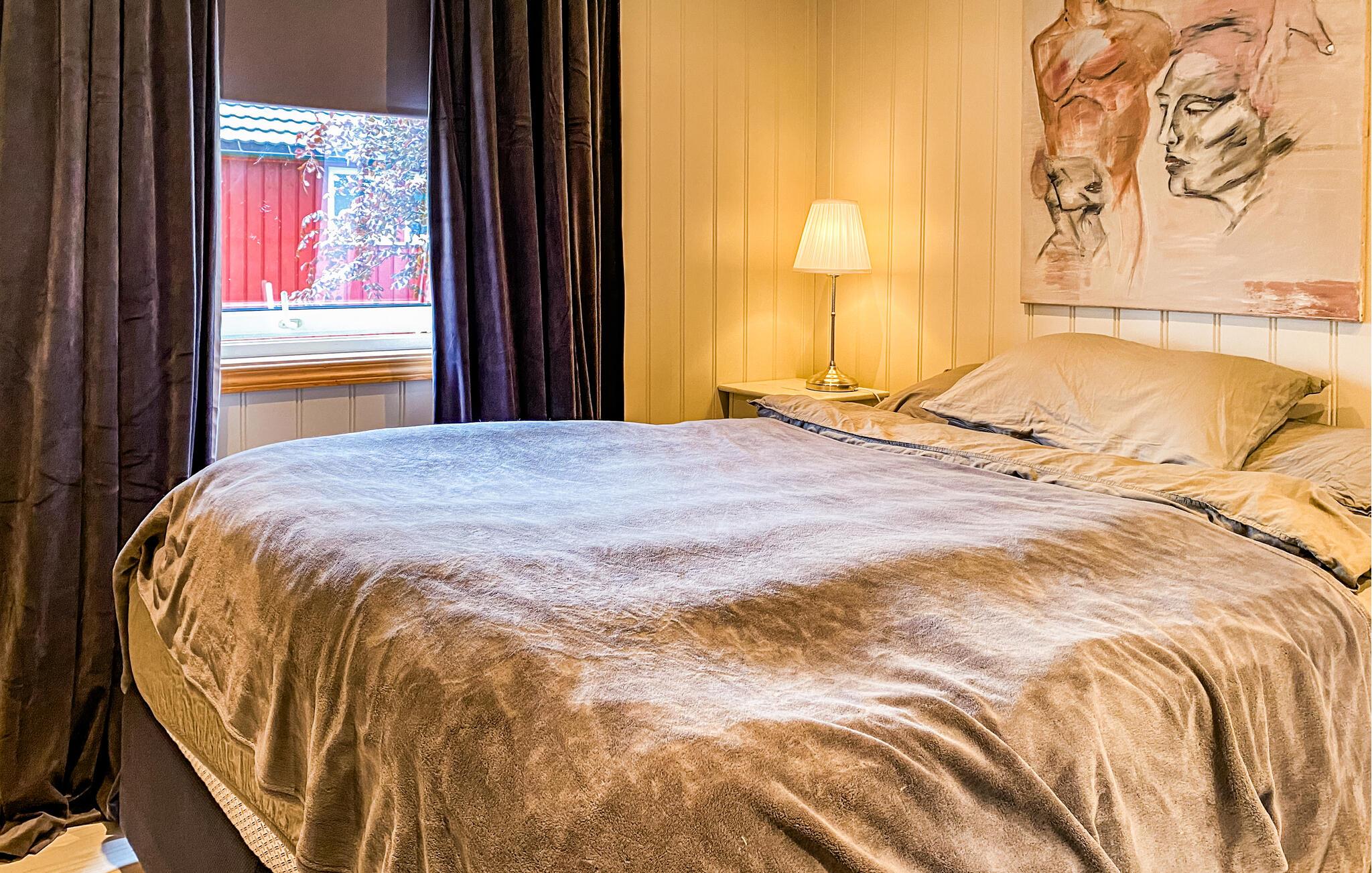 Dette smukt møblerede hus byder jer velkommen med et lyst interiør, der kombinerer hygge og elegance. Husets hjerte er den rummelige stue med komfortable sofaer, en norsk brændeovn og store vinduer med udsigt over den omkringliggende natur. Genoplad batterierne, mens I læser eller lytter til musik, eller tilbered jeres yndlingsmåltider i det moderne landkøkken, inden I samles til en filmaften.