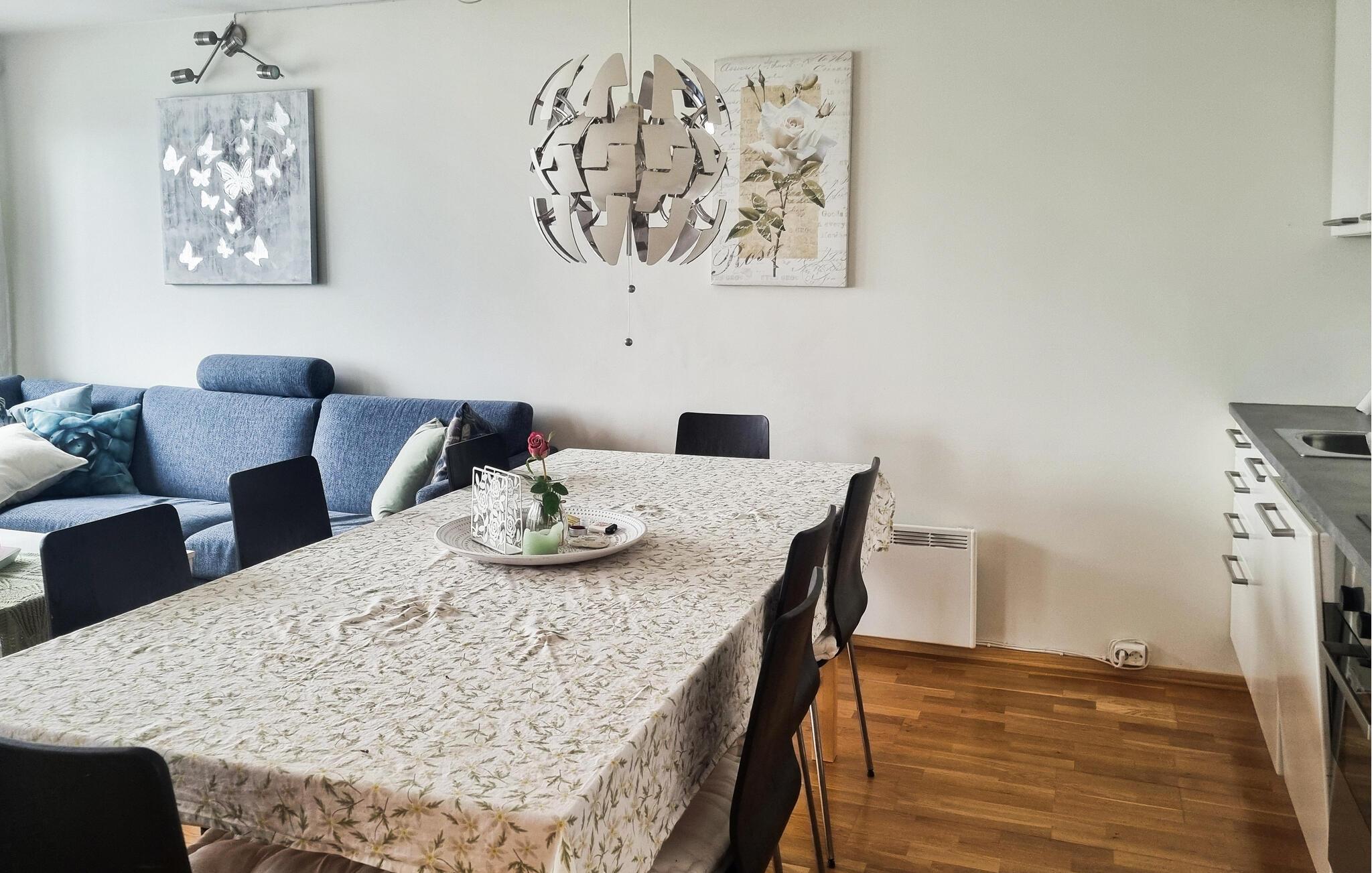 Oplev afslappende dage i denne ferielejlighed, der kombinerer nordisk hygge med en unik beliggenhed ved vandet. Stuen er fyldt med lys og har store vinduer med direkte udsigt over havet. Slap af i den komfortable hjørnesofa eller den hyggelige lænestol og nyd måltider sammen ved det smukke spisebord ved siden af ??det åbne køkken. Endnu et siddeområde med sofaer lægger op til at læse eller snakke.
