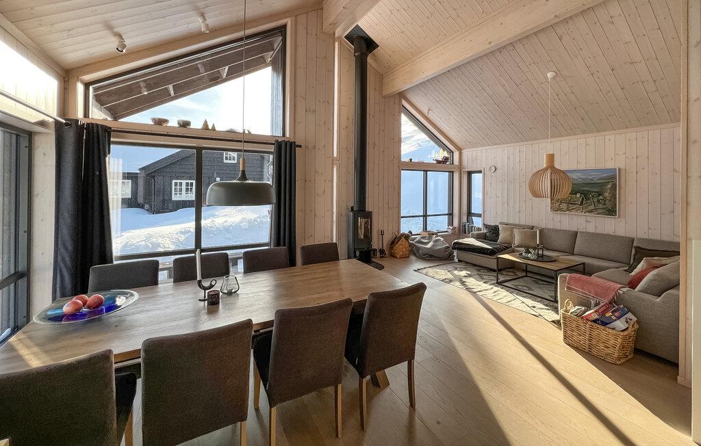 Nyd freden og skønheden i den norske natur i jeres stilfulde hytte nær adskillige maleriske søer, om sommeren eller vinteren. Træd ind og bliv fortryllet af den åbne opholdsstue med højt til loftet og store vinduespartier, som giver en rummelig fornemmelse og en fantastisk udsigt over det omkringliggende bjerglandskab. Find jer godt til rette i det hyggelige sofaområde, læs en bog i den varme eftermiddagssol eller nyd den hyggelige varme fra brændeovnen på kolde dage. Den tilstødende spiseplads med et stort træbord lægger op til at nyde hyggelige måltider, mens det moderne køkken er ideelt til at tilberede kulinariske delikatesser.