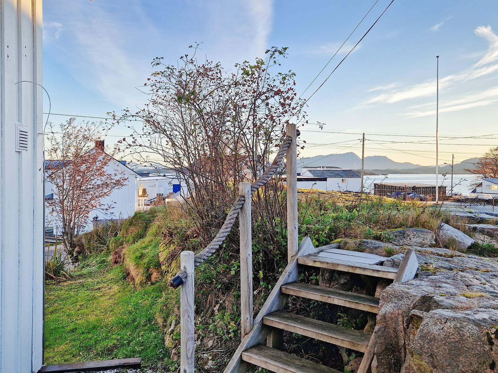 Lun uteplass ved inngangen til feriehuset. Flott sjøutsikt mot Reksundet og solnedgangen fra tomten. Ved huseiers naust, der utleiebåten ligger ved flytebryggen, er det en fin uteplass med utsikt utover sjøen. Kort vei til butikken.