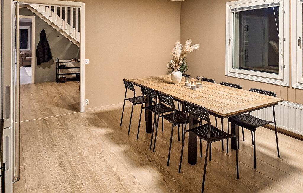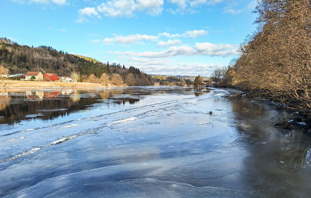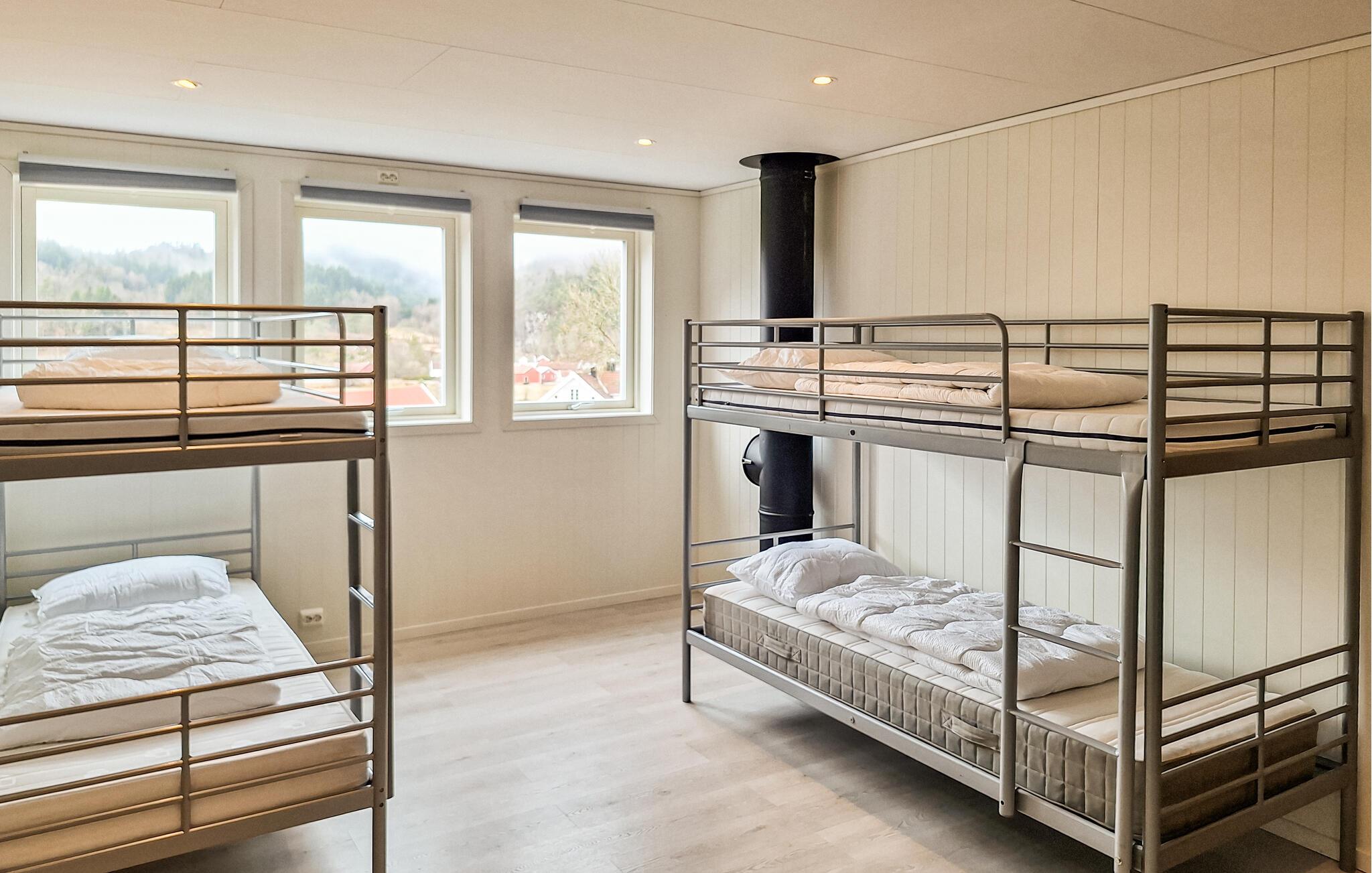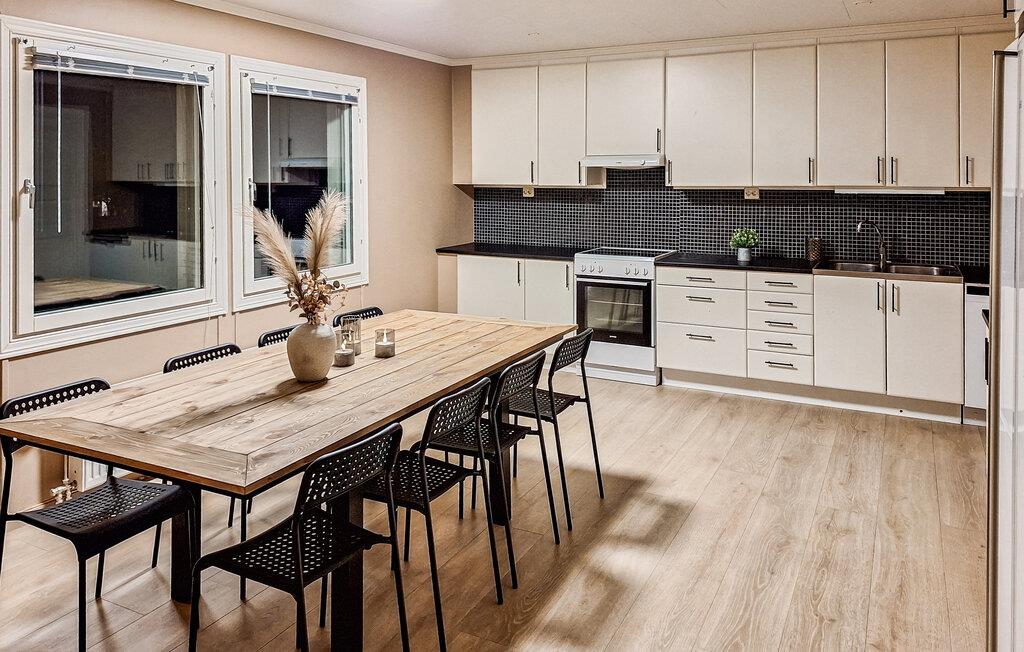 Oplev en afslappende ferie i dette stilfulde feriehus, idyllisk beliggende i et skønt naturområde. Her finder I den ideelle balance mellem komfort og det imponerende norske landskab. Find jer godt til rette i den rummelige opholdsstue. Den smagfulde indretning med varme farver, store sofaer og en brændeovn skaber en indbydende atmosfære. Nyd nogle afslappende aftener med en film eller læs en god bog i det komfortable siddeområde. Det moderne køkken giver jer mulighed for at tilberede lækre måltider. Spis sammen ved det store spisebord i træ og tilbring hyggelige timer sammen.