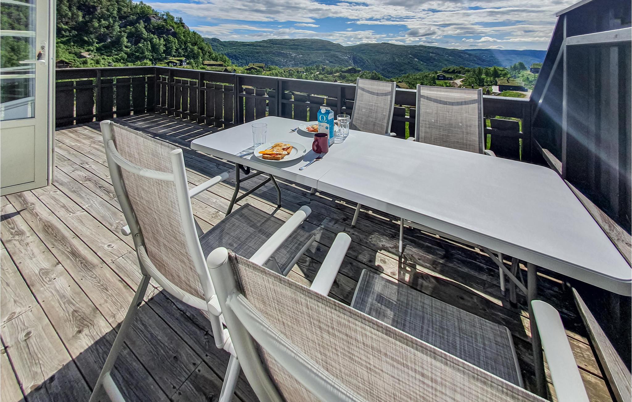 På dejlige dage kan du åbne døren til terrassen, hvor du kan nyde dine måltider udenfor. Fra terrassen får du ikke mindst en fantastisk udsigt over omgivelserne.