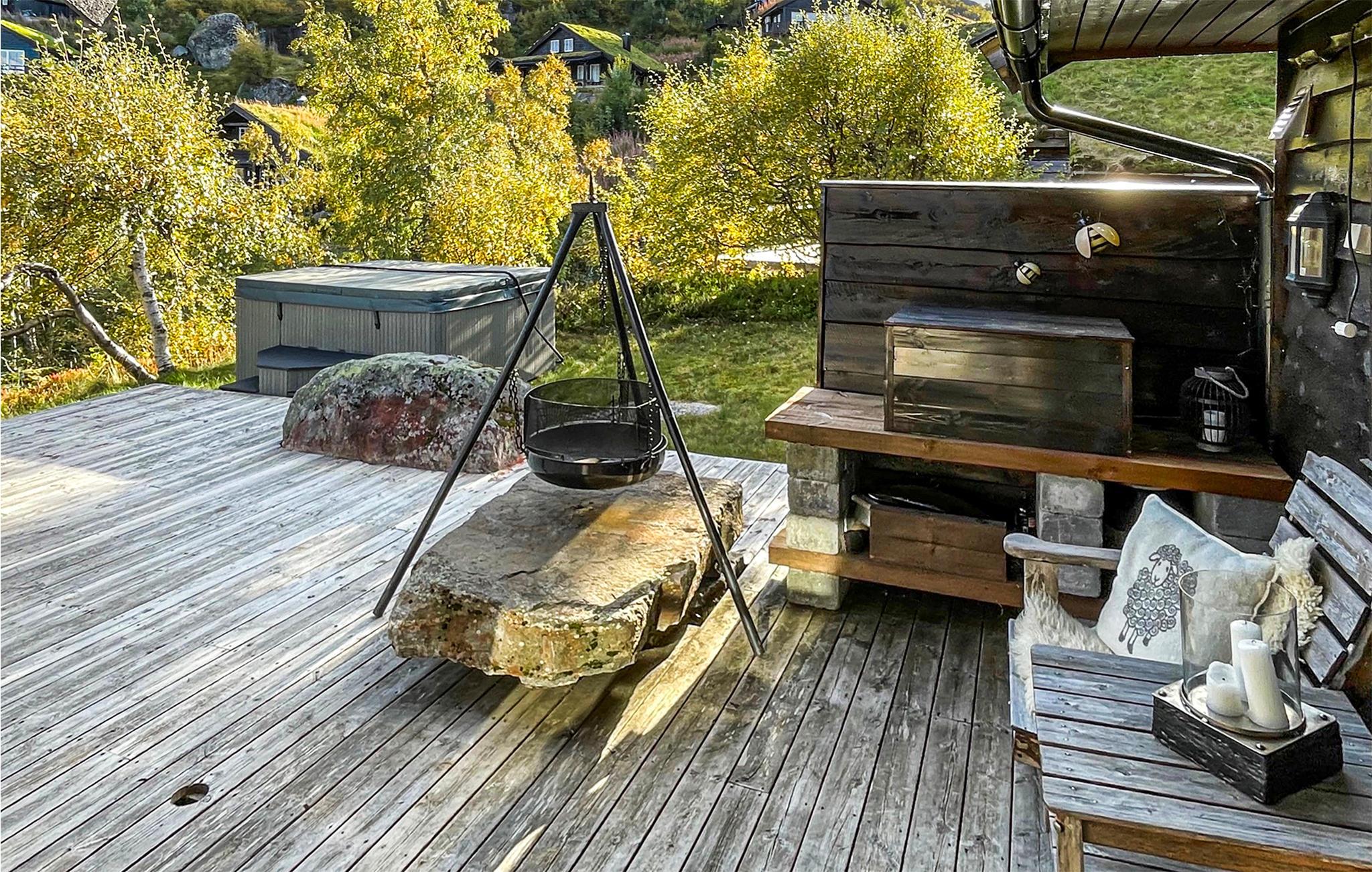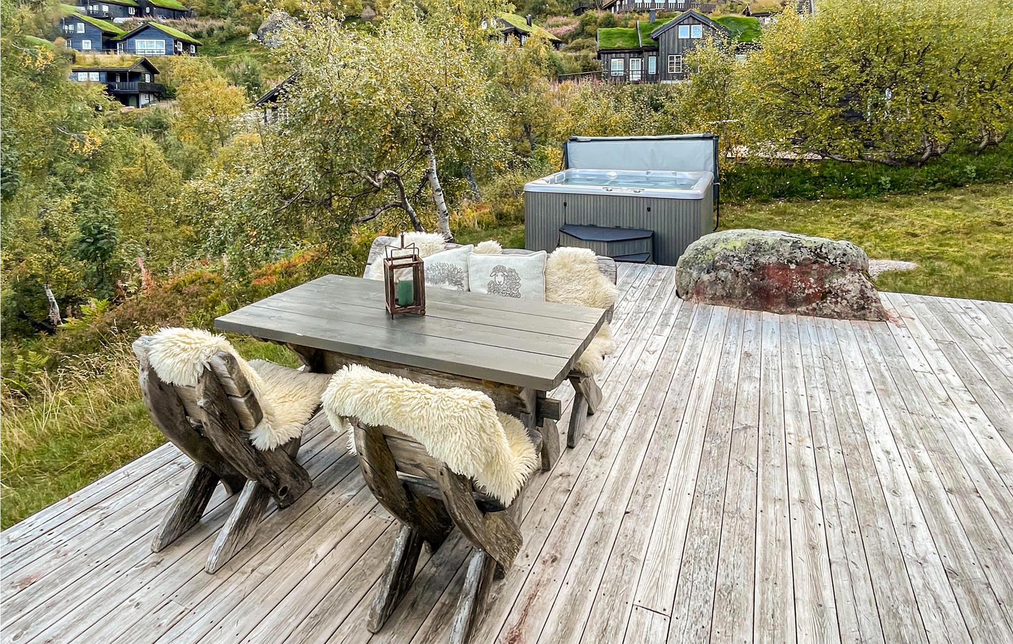 Husets have og udendørsareal er også smukt anlagt, og I kan nyde en fantastisk udsigt til et flot landskabfra terrassen. Prikken over i'et er den udendørs jacuzzi, som kan rumme op til seks personer og saunaen, hvor I kan slappe af efter en lang dag på farten.