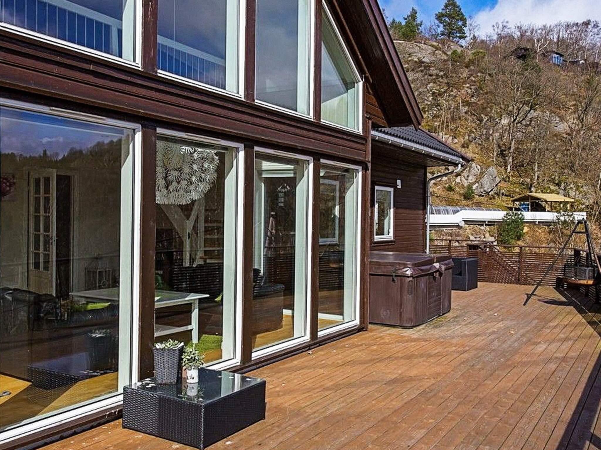 Rundt hytta er det terrasser med hagemøbler og hagegrill. Det er montert grind på terrassen. Kort vei ned til flytebrygge hvor det medfølger båtplass. Ved er ikke inkludert, men kan kjøpes på Spangereid eller hos en av naboene.
