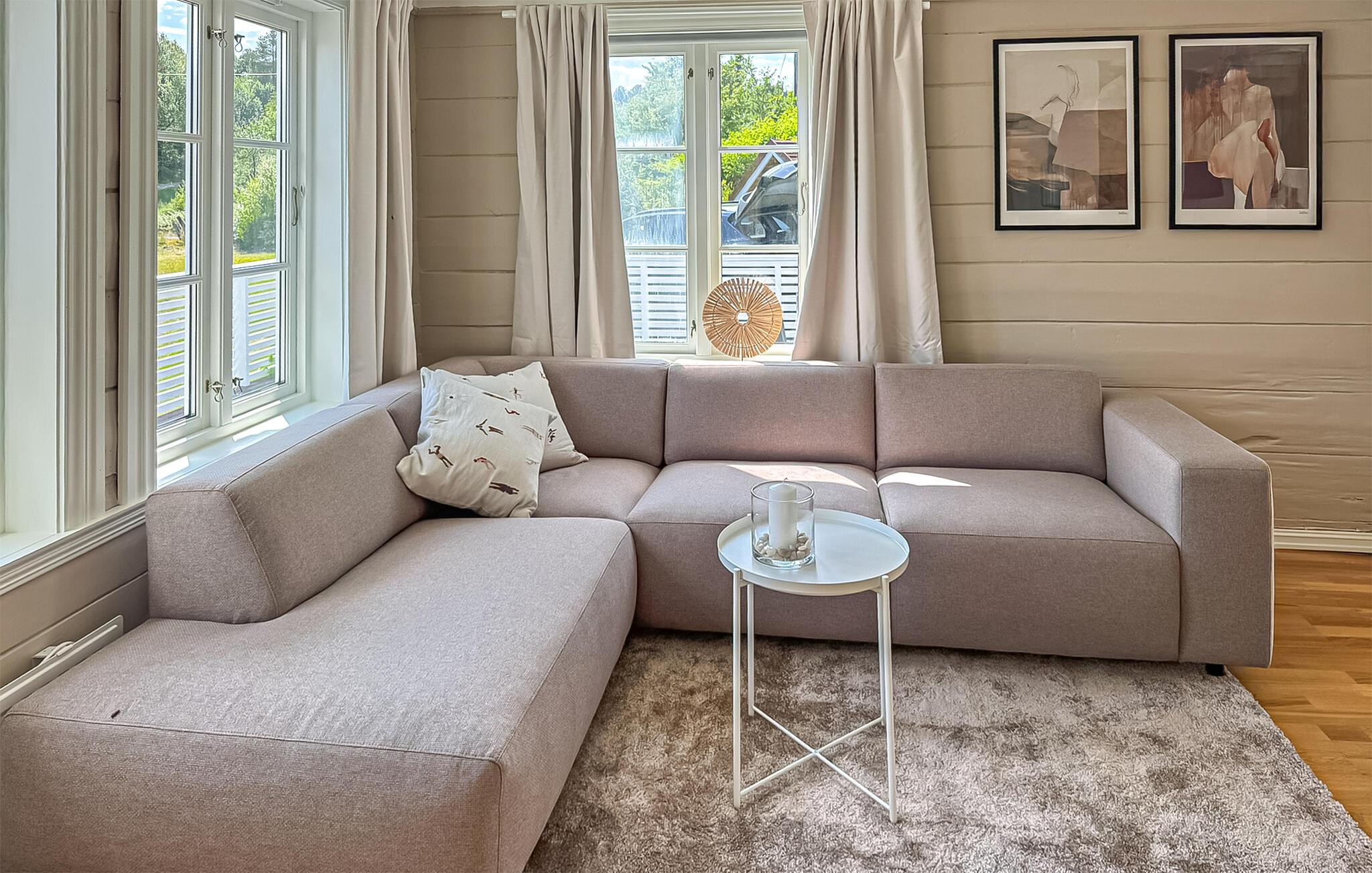 Interiøret i dette charmerende hus byder jer velkommen med en vellykket blanding af moderne landlig stil og naturlig hygge. Store vinduer oversvømmer huset med lys, mens trægulve af høj kvalitet og stilfulde vægpaneler skaber en varm atmosfære. I stuen finder I et komfortabelt sofahjørne, sarte farver og udsigt over det grønne – ideelt til stille læsning eller hyggelige aftener foran fjernsynet.
