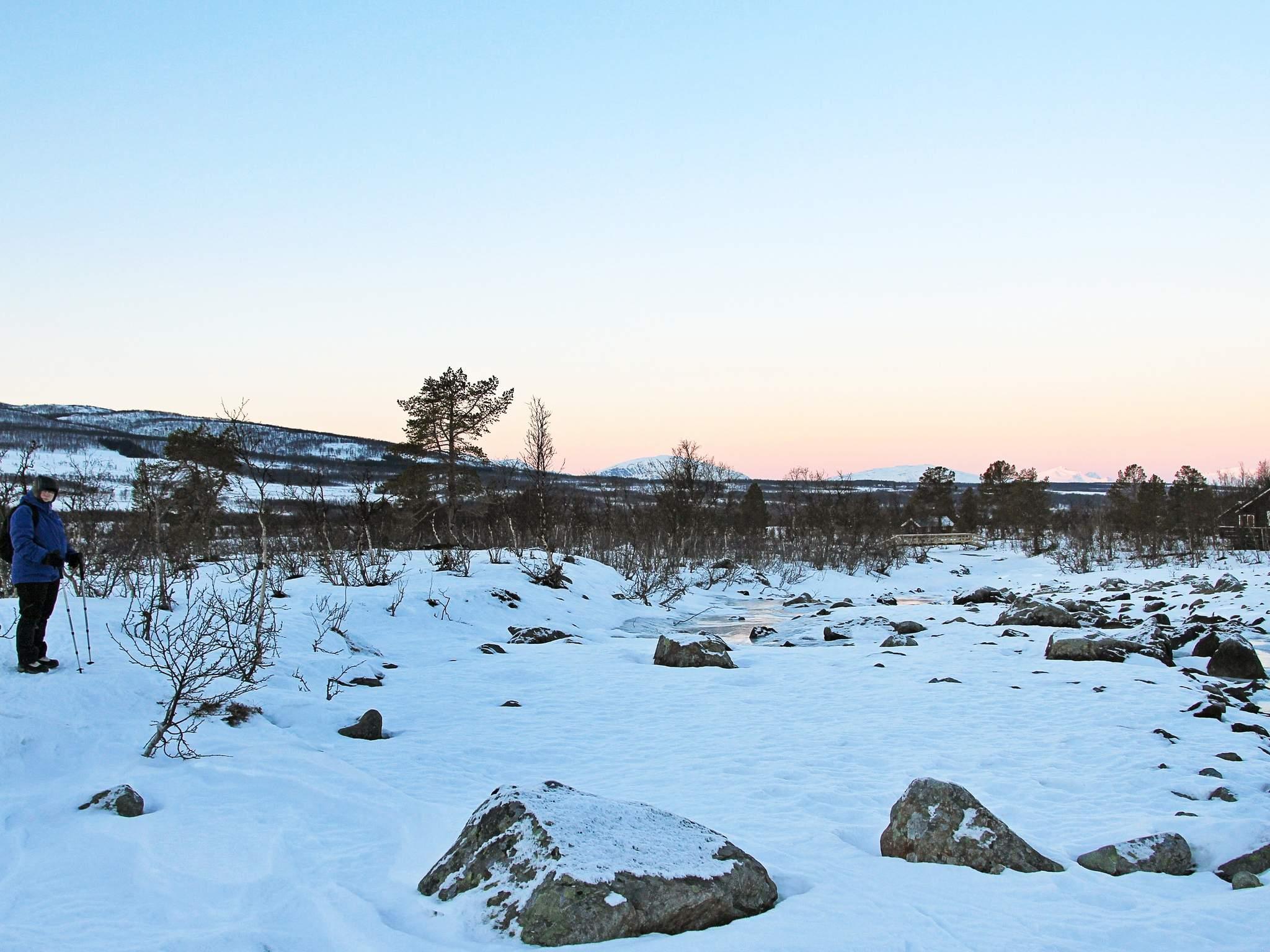 Lyngen er kjent for sin vakre natur og fra hytta og terrassen kan du nyte dette storslagne landskapet til alle årstider. I sør ligger fjellet Jægervasstid og de mektige Lyngsalpene som er Europas nordligste alpeområde. Fjellene rager over 1800 m.o.h og er med sine isbreer på fjelltoppene et imponerende skue.