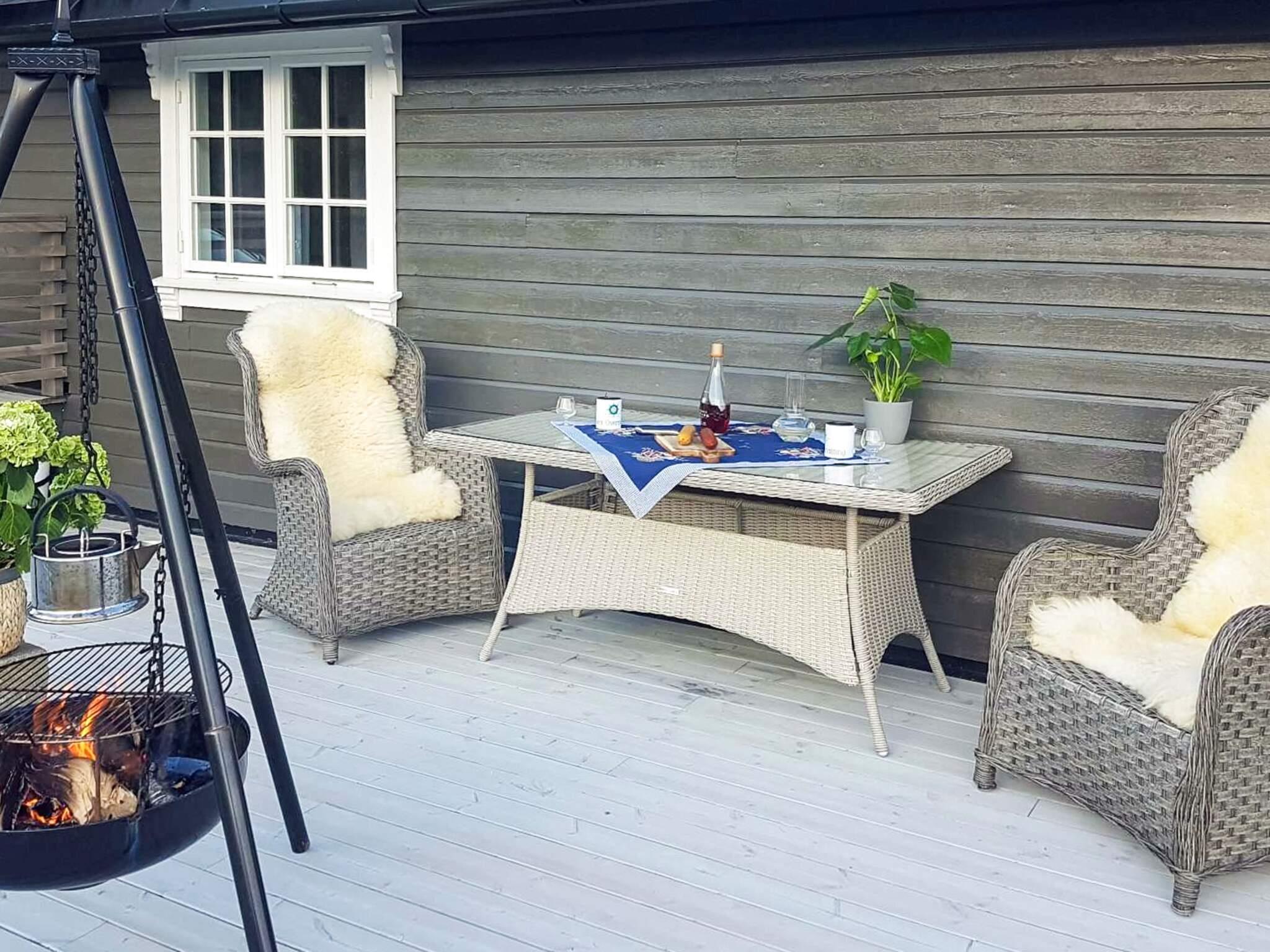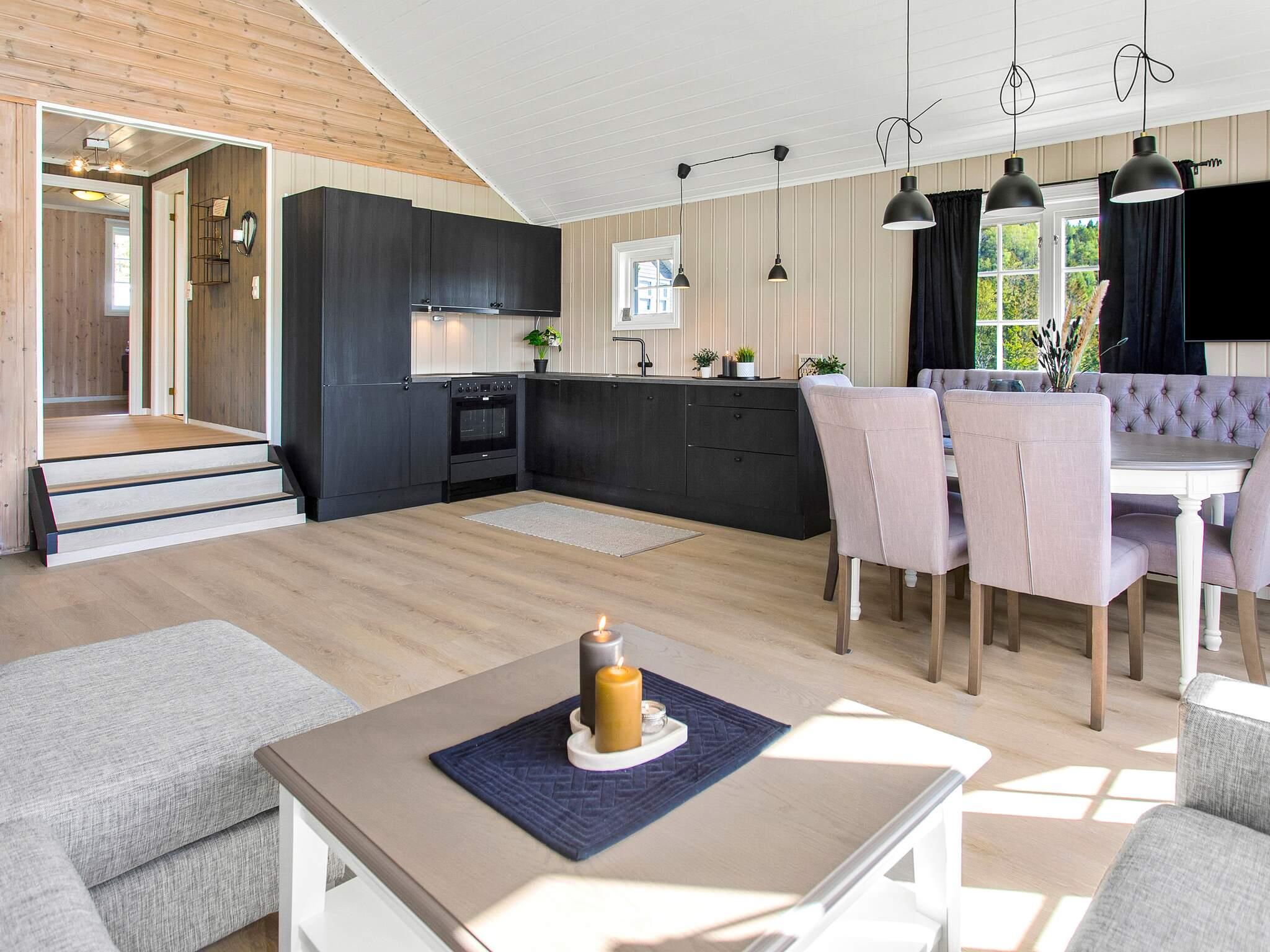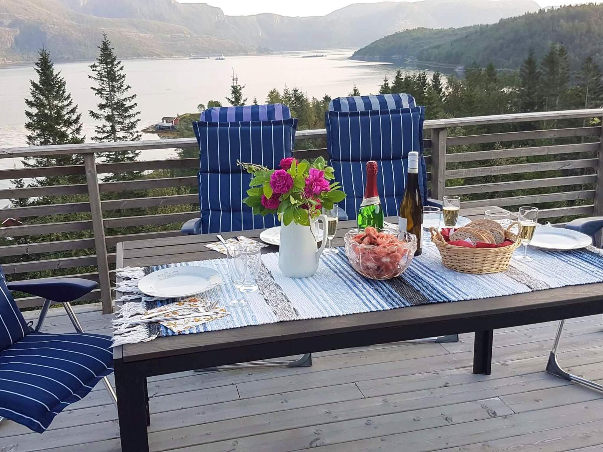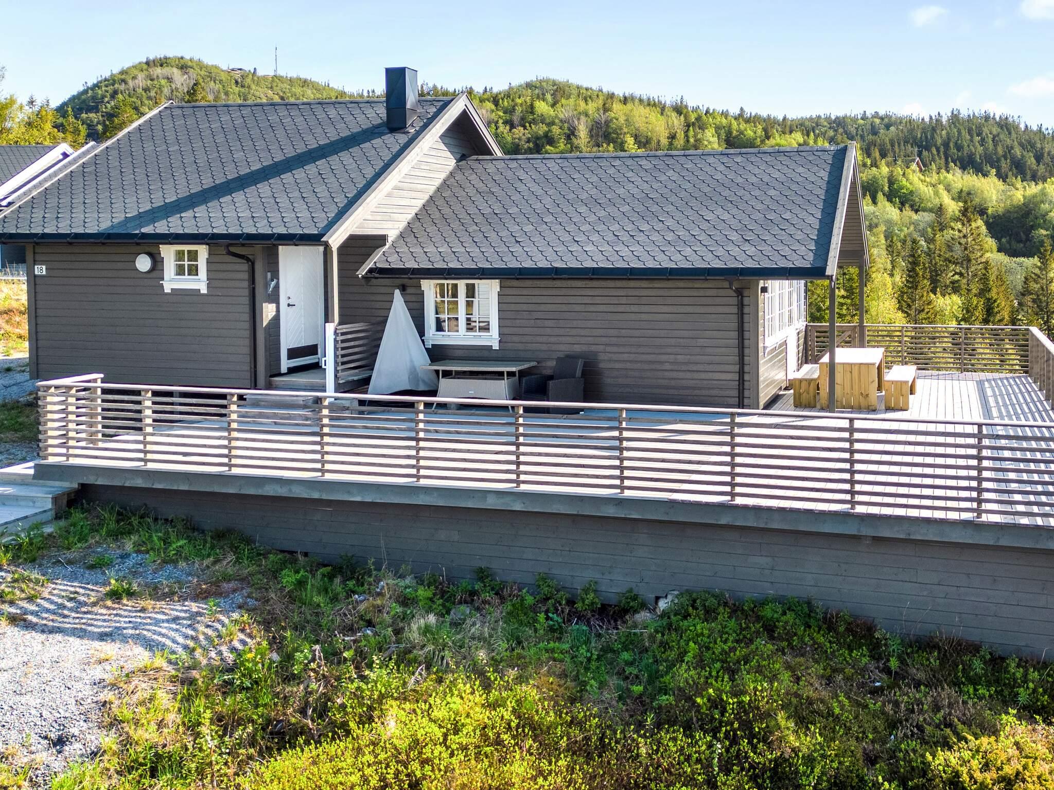 Hytta ligger åpent og fritt i et hytteområde med panoramautsikt mot fjorden og båthavnen nedenfor. Området er solrikt og den store terrassen og uteområdet rundt hytta gir fine muligheter for lek og aktivitet for hele familien. Her kan du nyte morgenkaffen under soloppgangen.