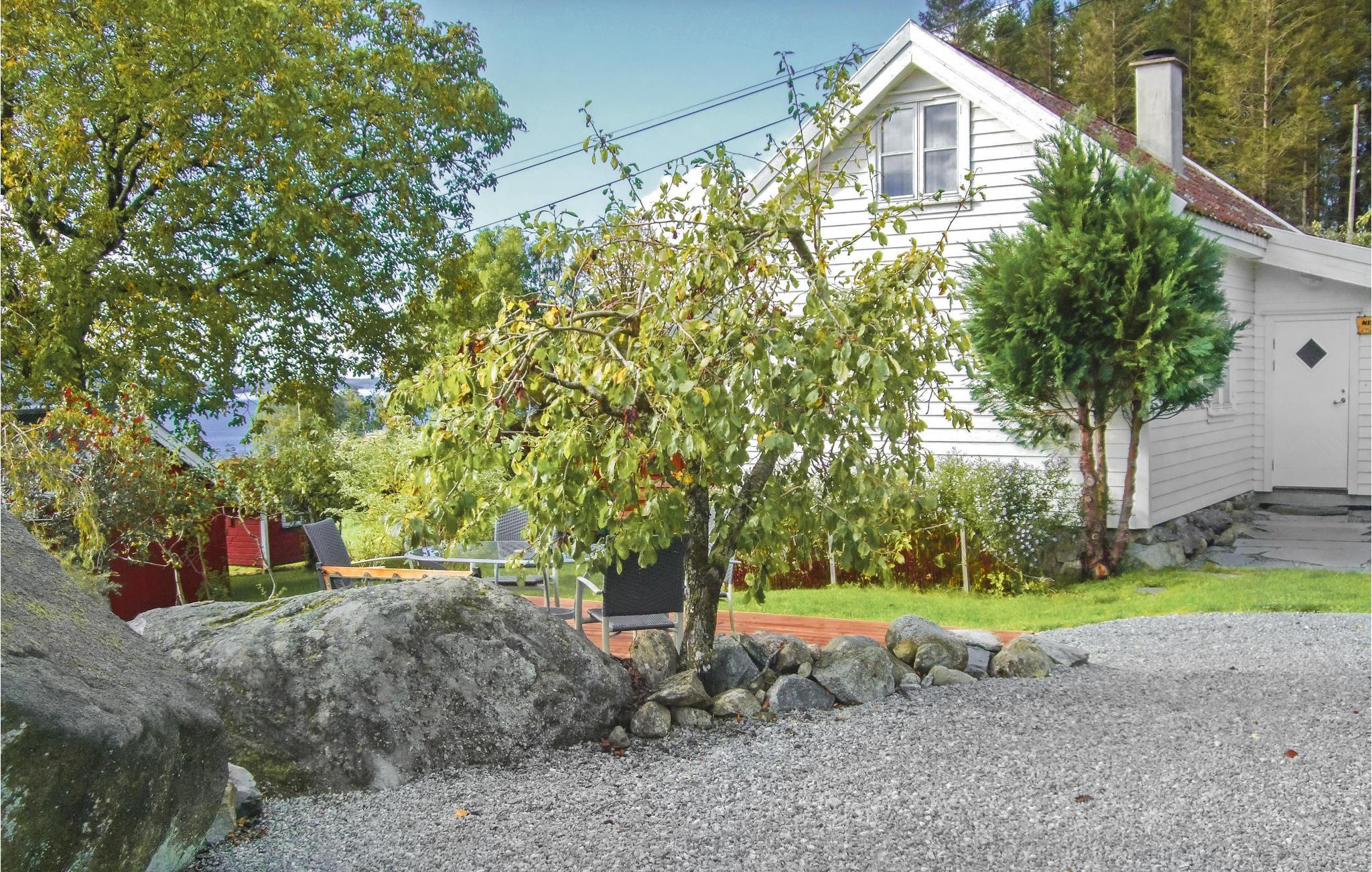 Det omkringliggende område er omgivet af bjerge og fjorde, og huset har en dejlig have, der giver mulighed for afslappende og rolige feriedage med udendørs spil og grill.