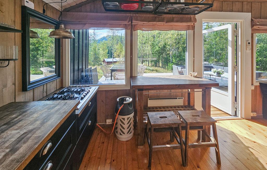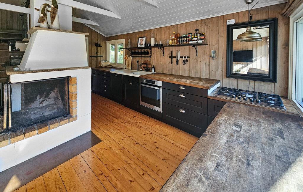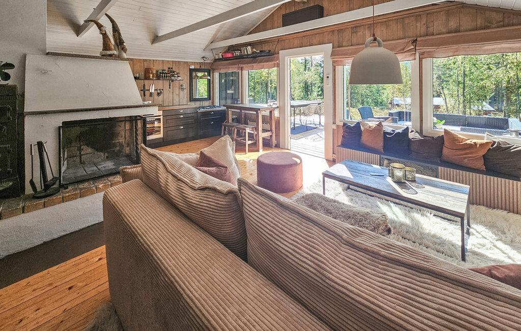Dette træhus er perfekt til en afslappende pause fra hverdagen. Store vinduer og en hyggelig stue møbleret med sofa, masser af hynder og en stor pejs skaber en atmosfære, hvor I hurtigt kan slappe af. Tilbring dagen her, som I ønsker – uanset om det er en hyggelig spilleaften, grin over en sjov film eller tilberedning af friske måltider sammen i det moderne køkken.