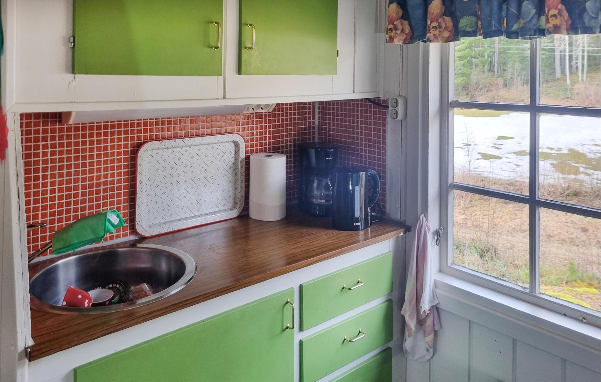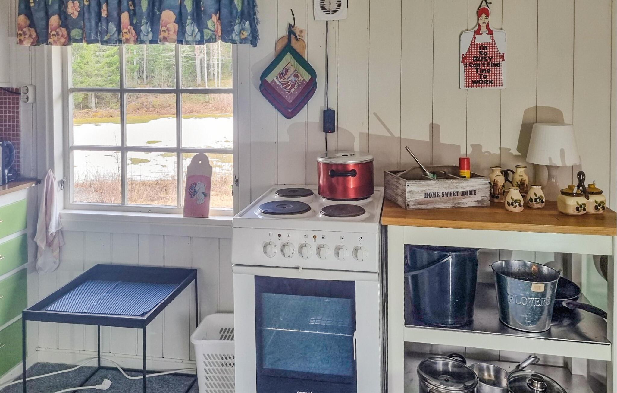 Dette traditionelle feriehus udstråler en varm og hjemlig atmosfære. Lad jer inspirere af de farverige detaljer i det velindrettede køkken, mens I tilbereder jeres måltider. Slap af i den hyggelige stue, hvor rustikke træmøbler og finurlige dekorationer skaber en indbydende stemning. Nyd fællesskabet ved det store spisebord med udsigt til den omgivende natur, og afslut aftenerne med en god bog eller sjove brætspil i det charmerende opholdsrum.