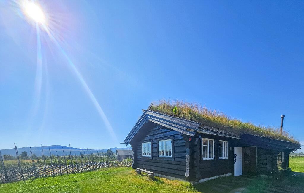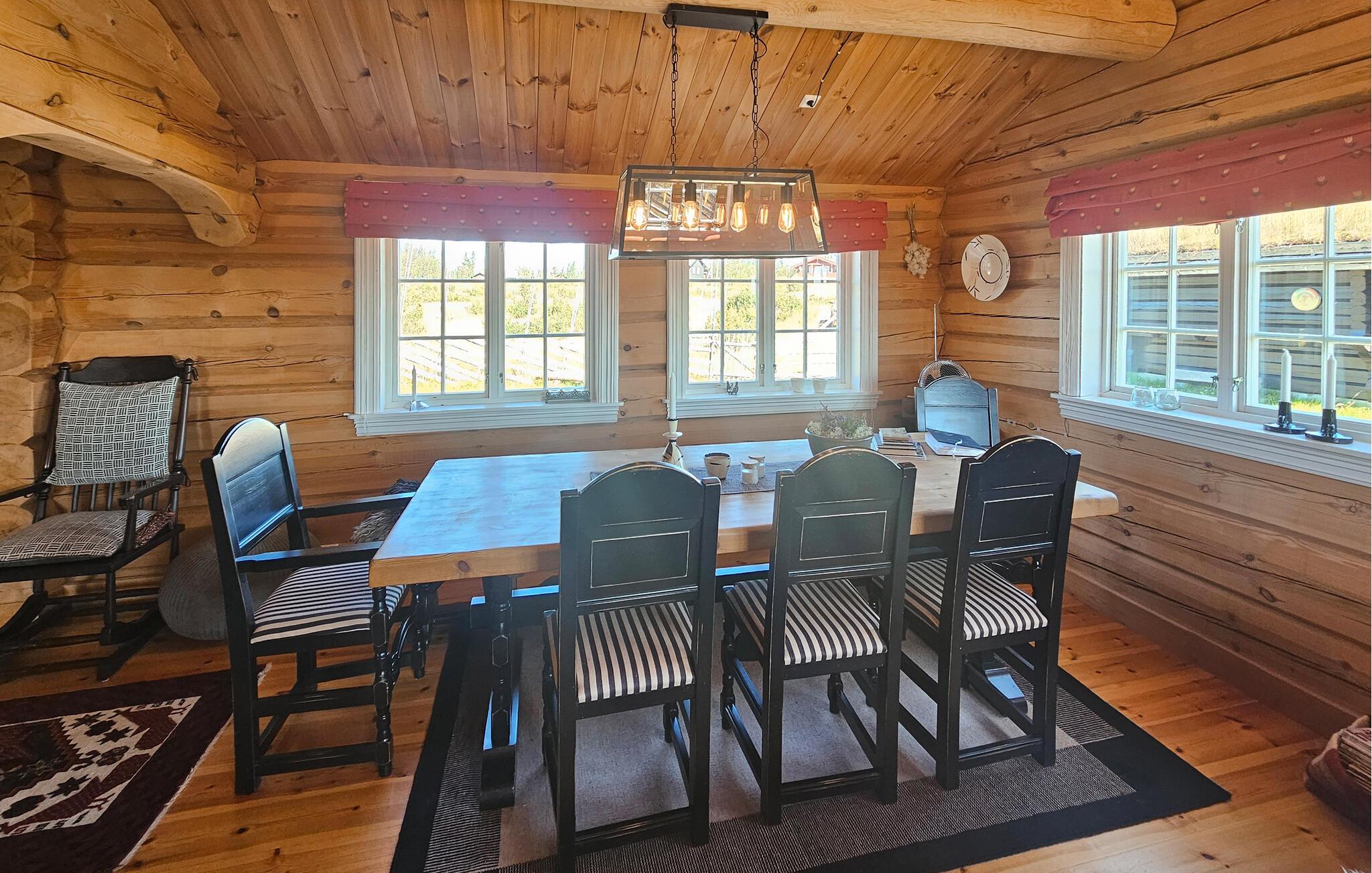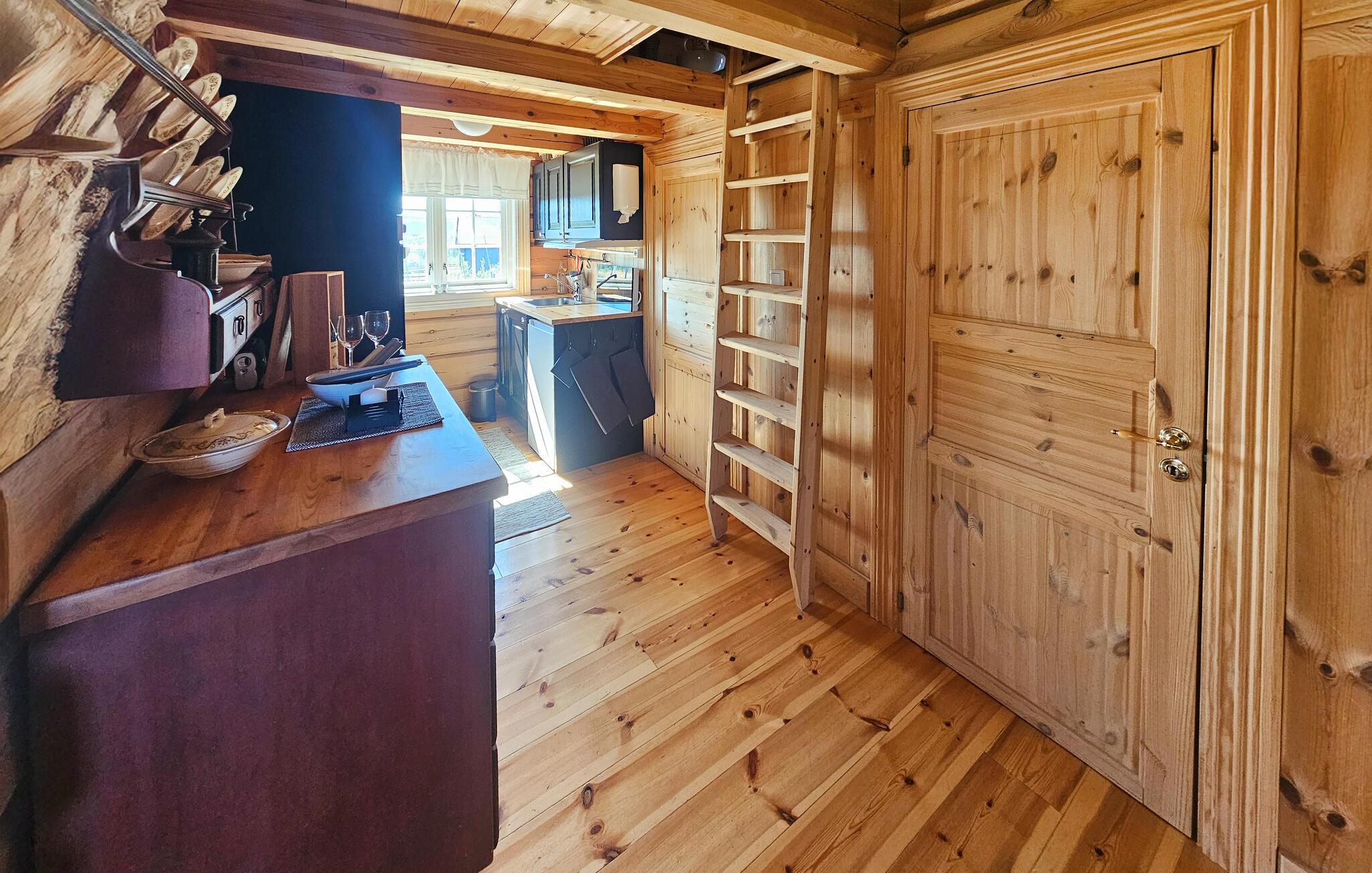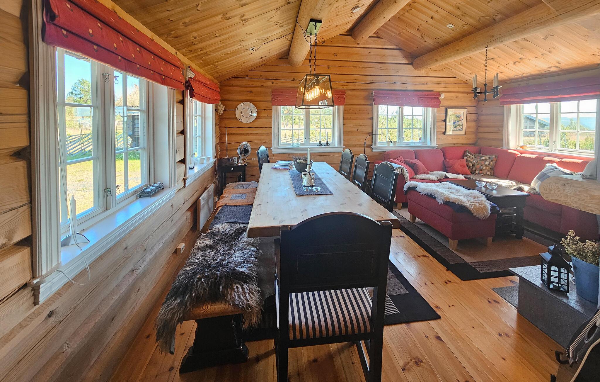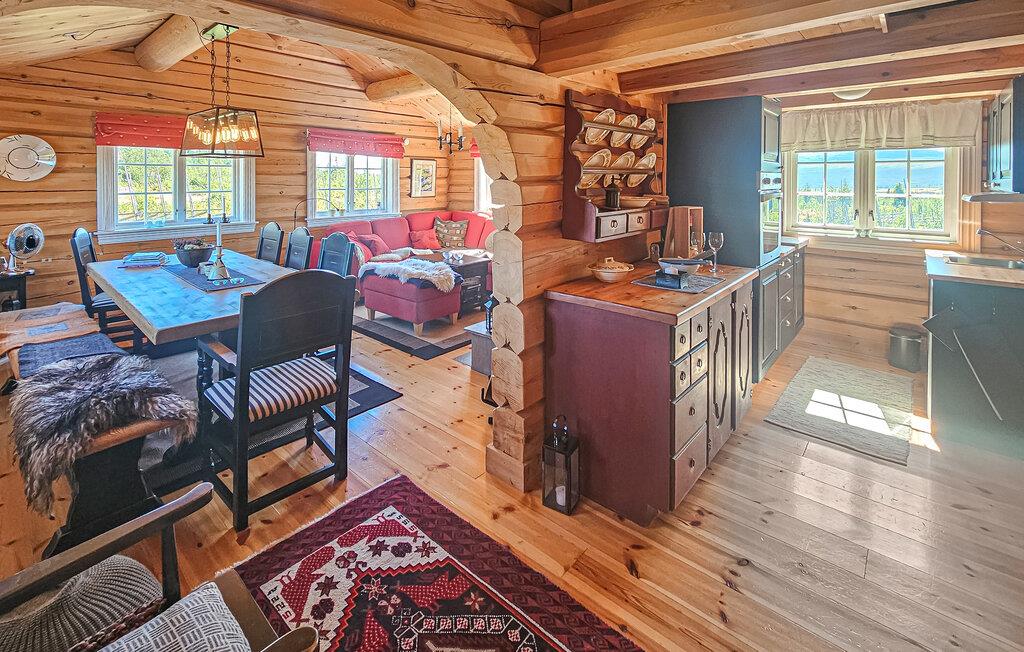 Denne karakterfulde bjælkehytte med mørkt træ og græstag kombinerer komfort og hygge. Det varme træ, de rustikke møbler og de komfortable sofaer skaber en afslappende atmosfære, hvor I hurtigt kan slappe af. Når det er køligere udenfor, kan I tænde pejsen og slappe af i den hyggelige varme. I det moderne køkken kan I lave mad sammen og nyde jeres lækre måltider ved det store spisebord.