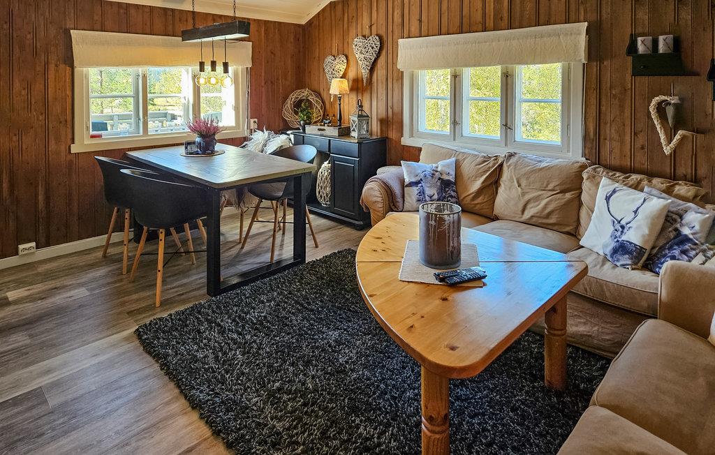 Tilbring en afslappende ferie i dette hyggelige træhus ved søen Breitvatn.