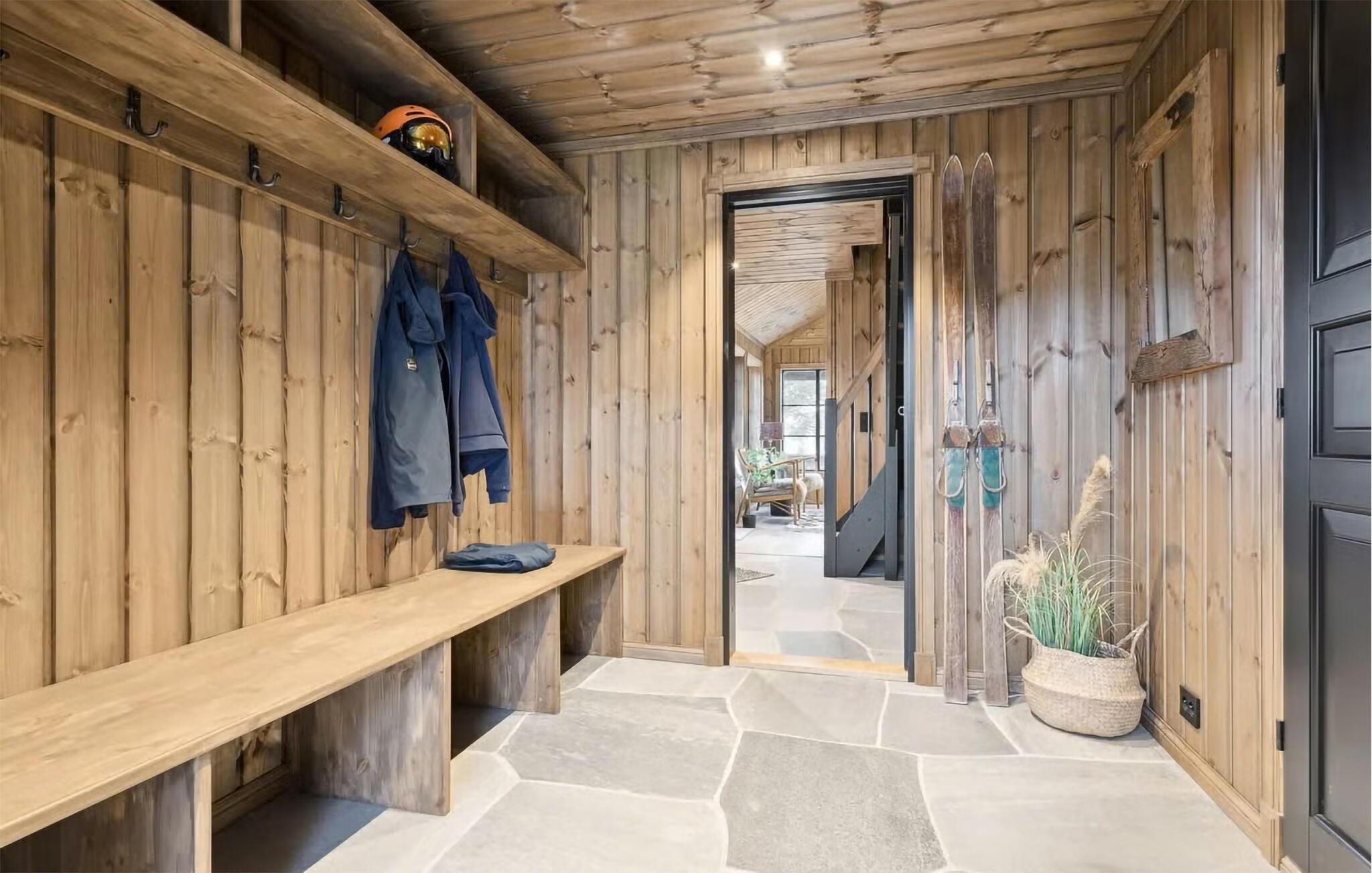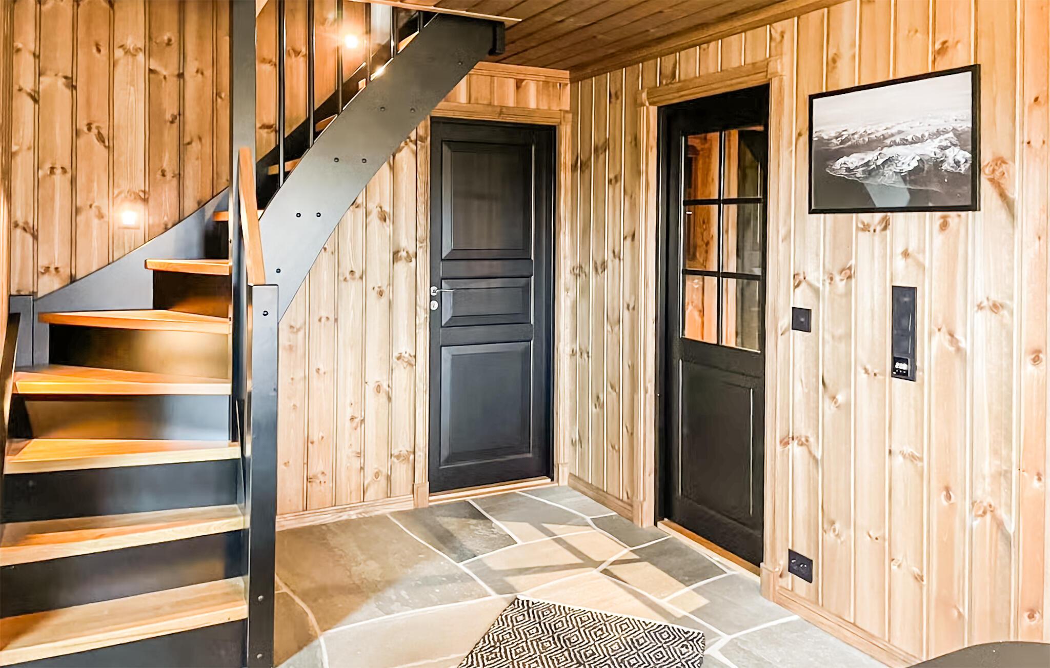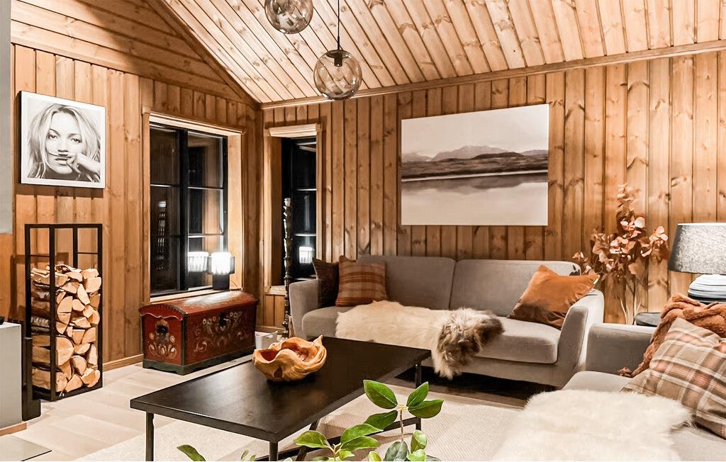 Nyd det varme og indbydende interiør med overflod af træ og harmonisk nordisk indretning. Det lyse, åbne opholdsområde suppleres af en moderne brændeovn, perfekt til hyggelige aftener. Slap af i de komfortable sofaer og brug den rummelige spiseplads til fælles måltider og hyggelige sammenkomster. Tilbered lækre retter i det åbne køkken, og træk jer derefter tilbage til saunaen for en afslappende oplevelse.