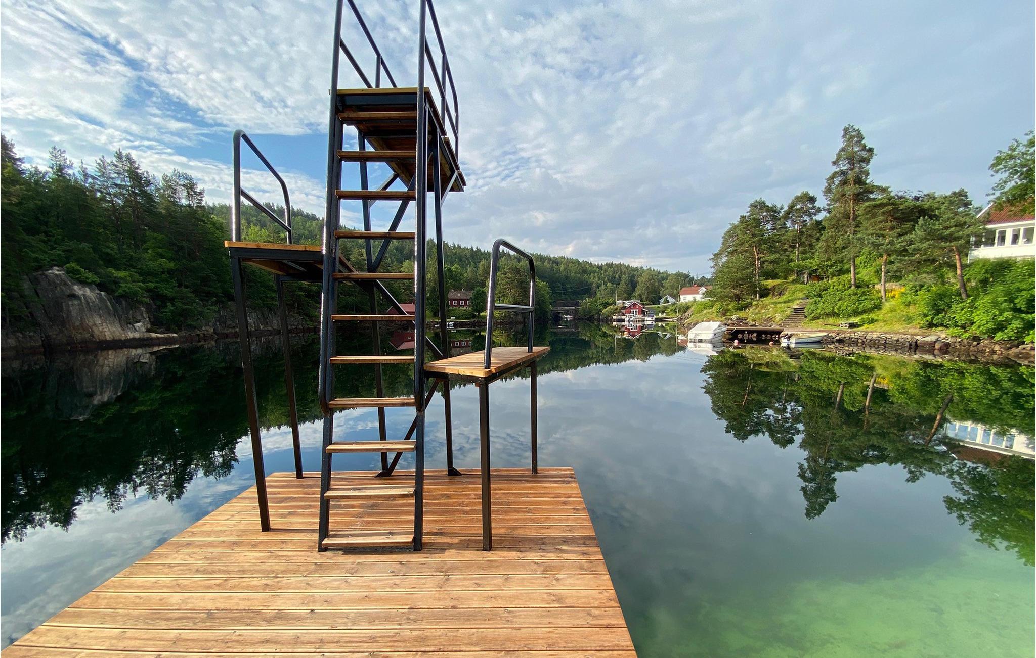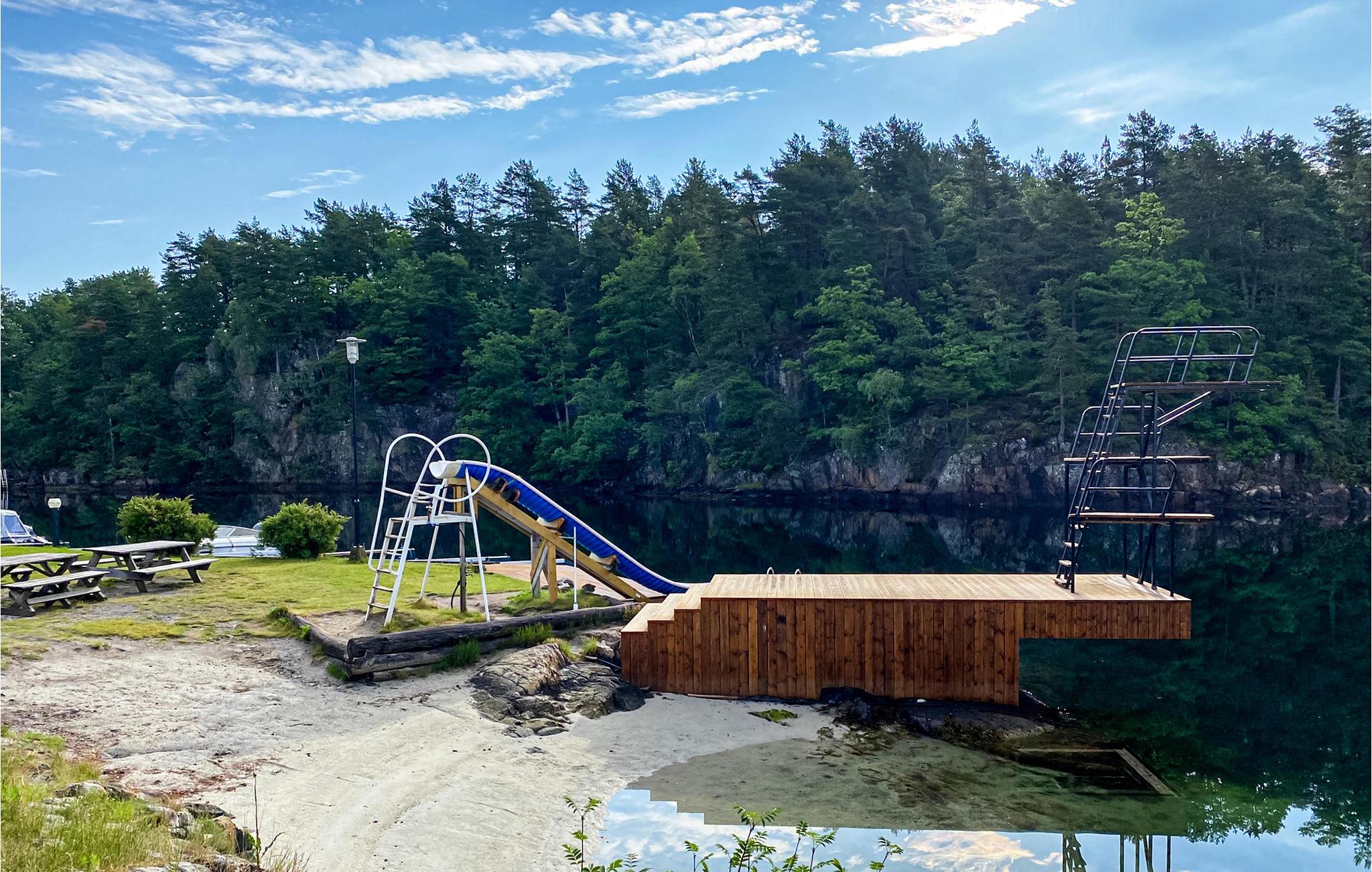 Huset ligger i anden række til vandet. Lige rundt om hjørnet er der et fantastisk badeområde med en dykkerplatform, rutsjebane, fælles grill og pizzaovn, solbadningsområde og bænke. Ligeledes er der en bådplads og et bådudlejningssted. Flere terrasser ved huset inviterer jer til at slappe af i solen.