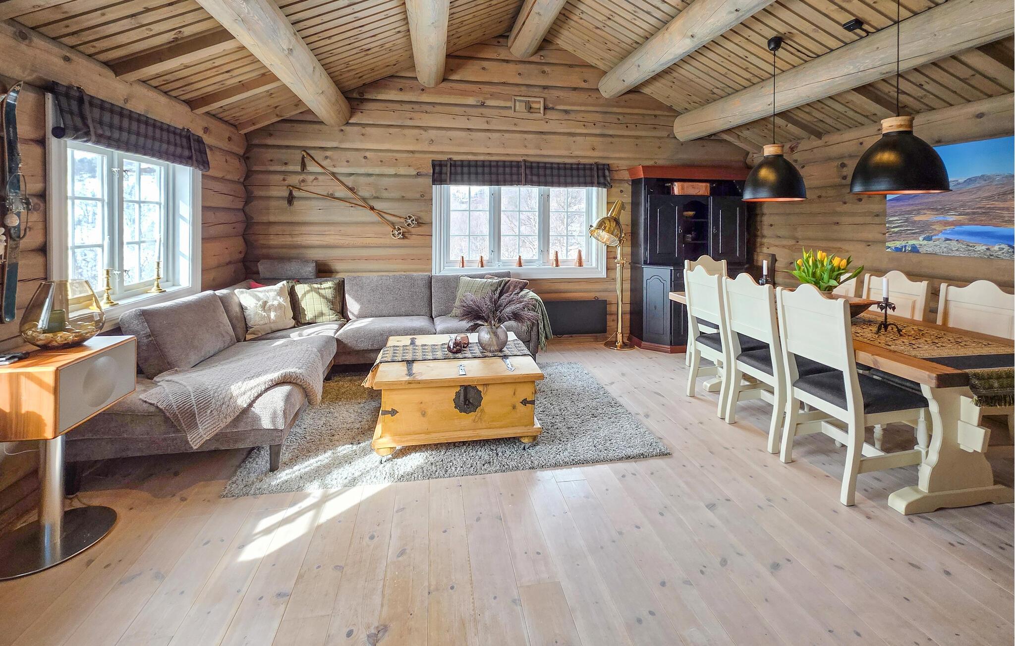 Oplev det imponerende højfjeldslandskab omkring jeres hytte. Nyd varierede vandreture i 1.000 meters højde om sommeren eller store snelandskaber om vinteren. Udforsk de perfekt præparerede skiløjper i nærheden eller start en cykeltur langs den berømte Rallarvegen i Haugastøl. Tag en tur til Geilo, stå på ski på alpine pister eller nyd den livlige atmosfære med butikker og en golfbane.