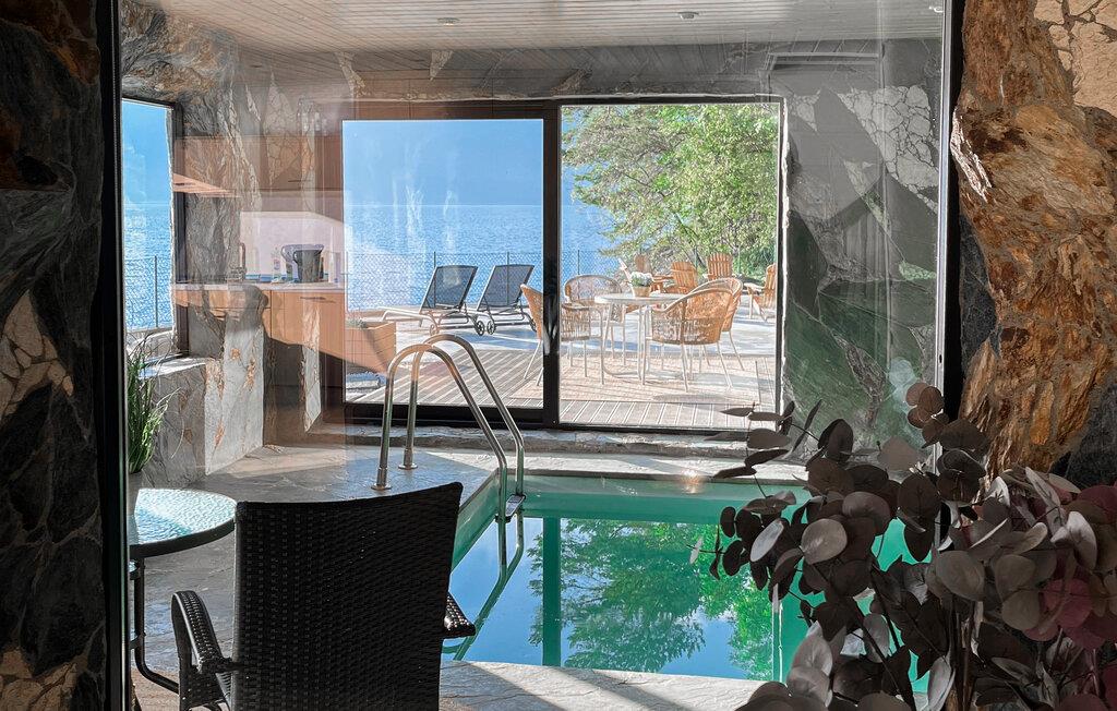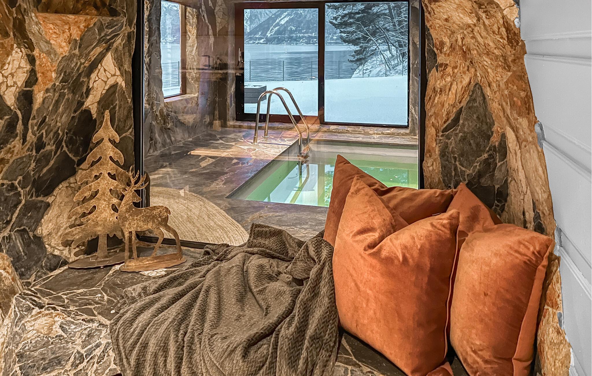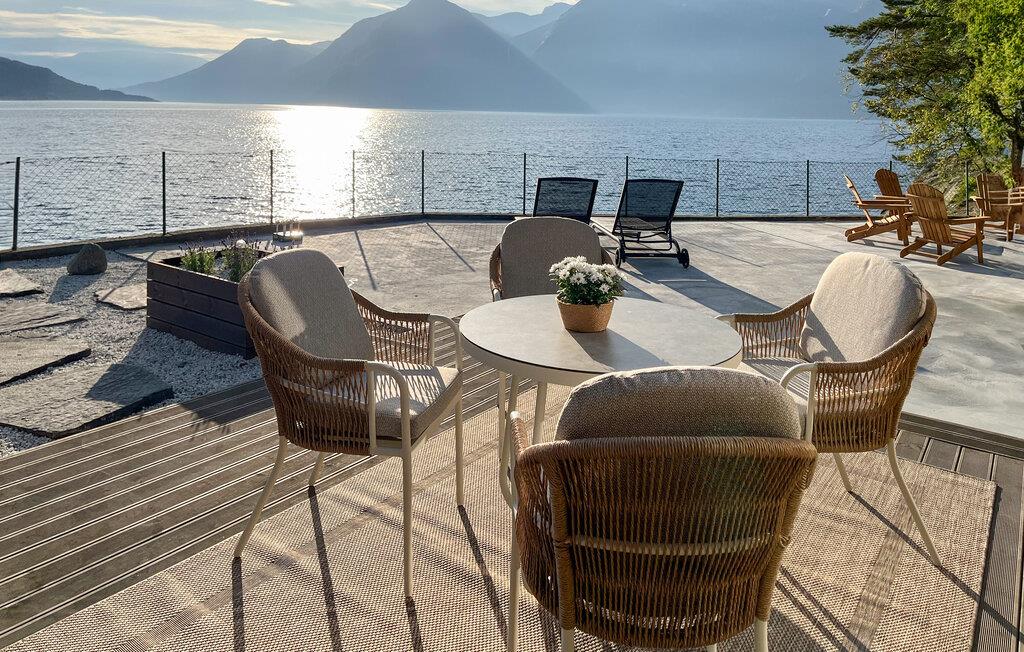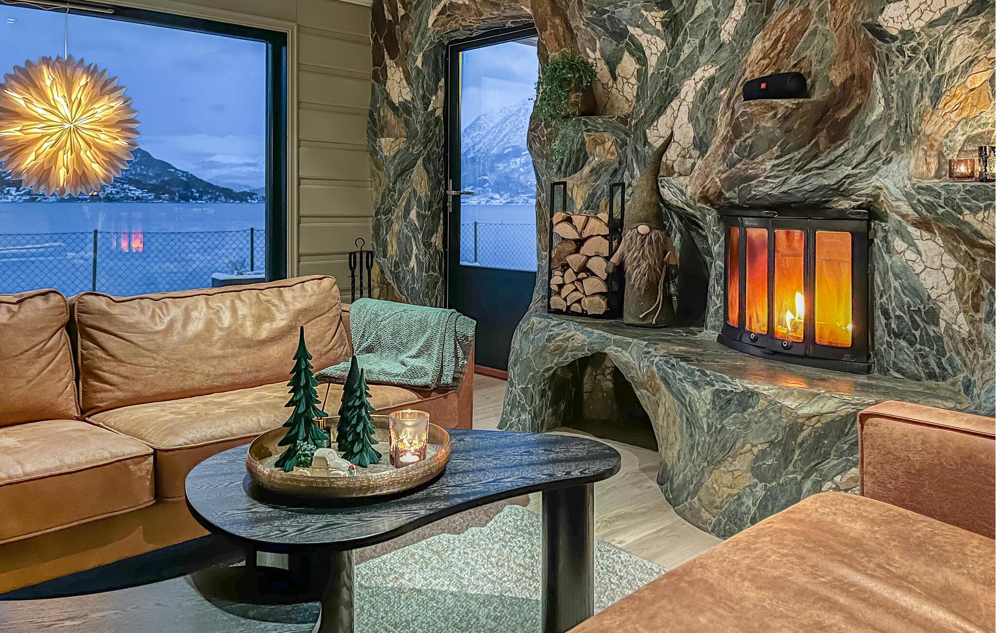 Oplev en vidunderlig luksusferie i dette luksusferiehus, som året rundt giver jer en helt særlig ferieoplevelse. Den stilfulde indretning byder jeg velkommen. Slap af i den rummelige opholdsstue med bløde sofaer, panoramavinduer og direkte udsigt over vandet. Nyd varmen fra pejsen, eller sæt jer sammen ved spisebordet. Lav mad i det moderne køkken med udsigt til det omgivende bjerglandskab. Brug poolen, spabadet og saunaen til ren afslapning, eller vær aktiv i fitnessrummet.