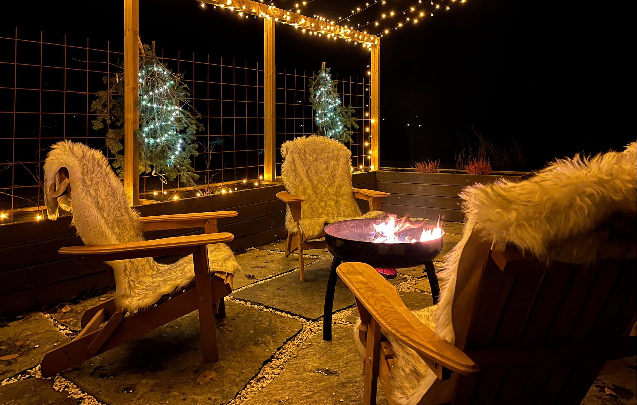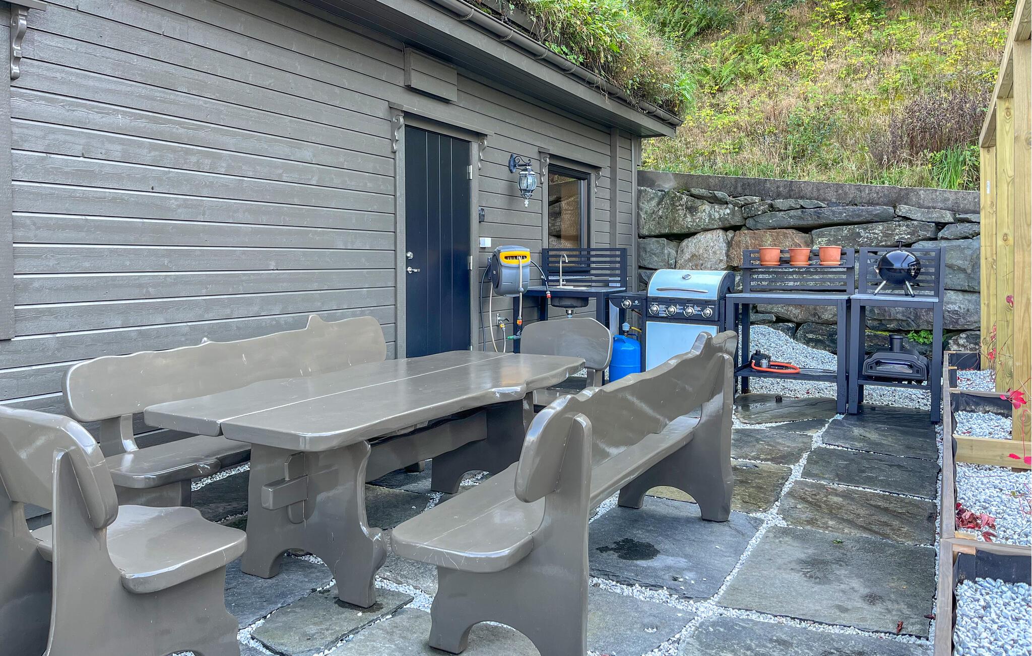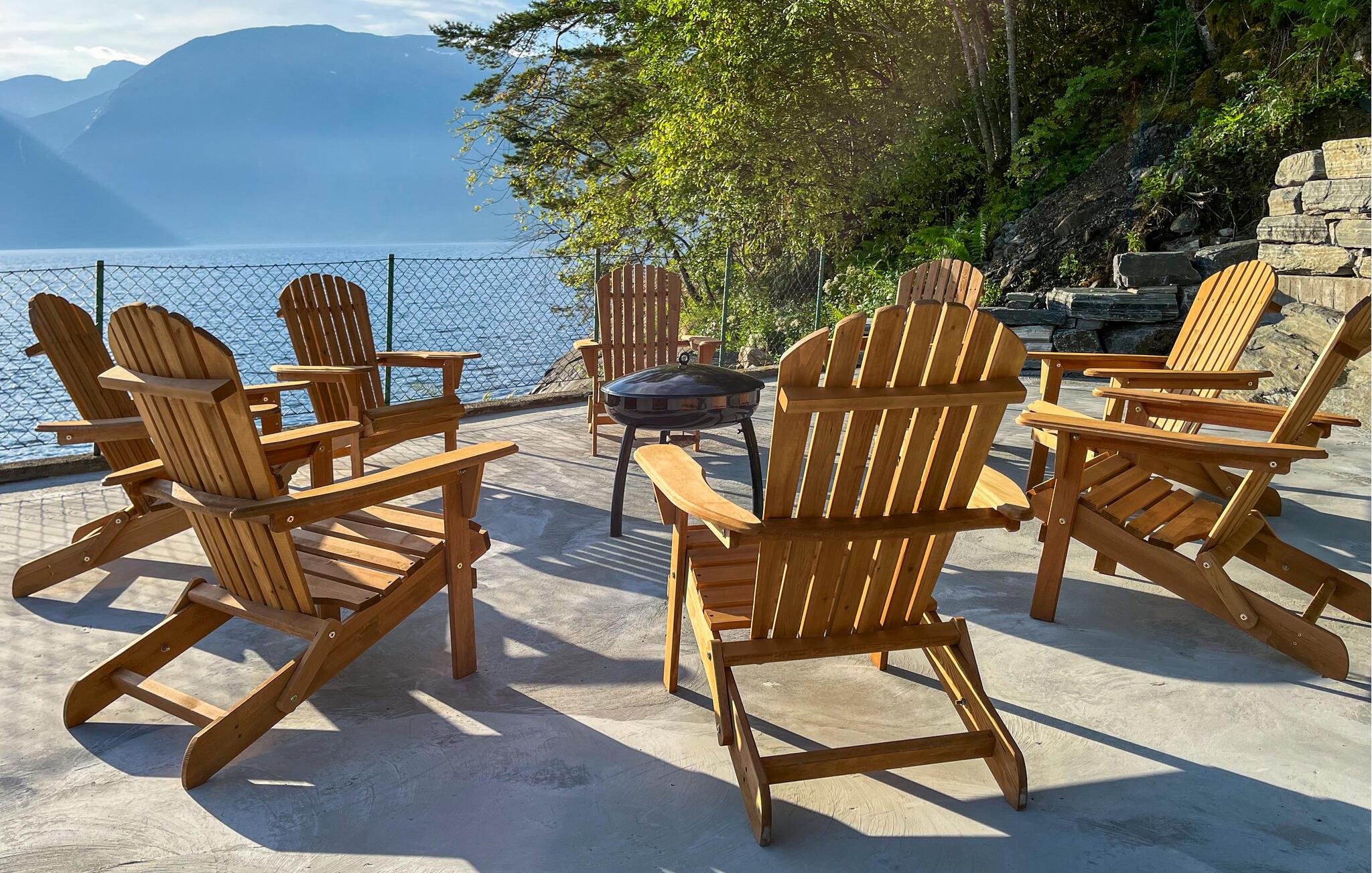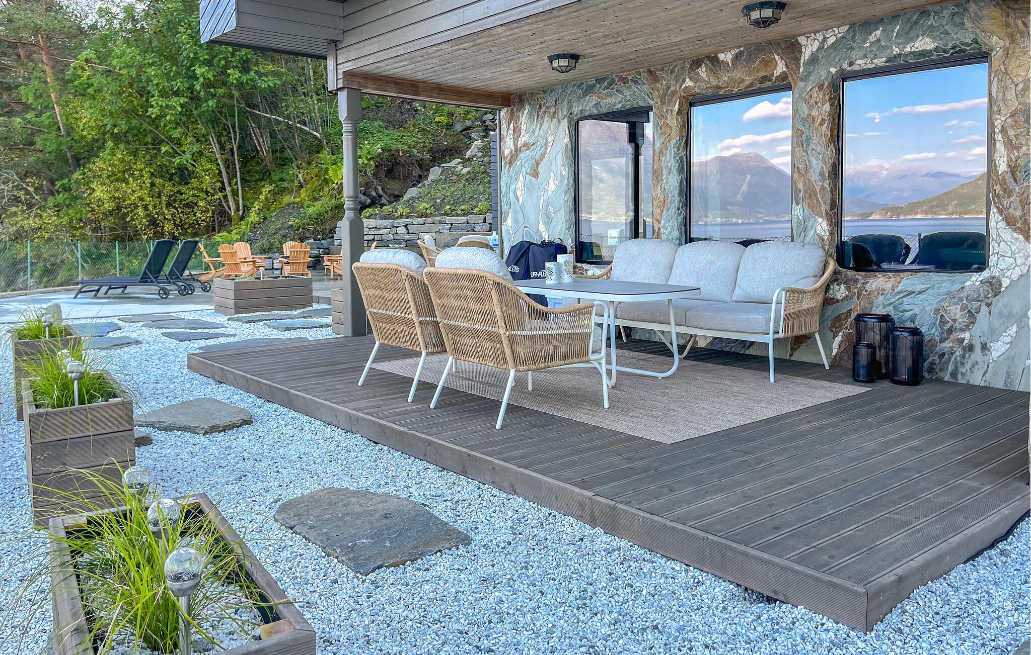 Sæt jer ud på den store terrasse med en drink i aftensolen, eller tilbered et måltid i udekøkkenet. Slap af i liggestolene ved vandet, lyt til bølgerne, og nyd den fredelige stemning. Om aftenen er bålpladsen et hyggeligt samlingspunkt med udsigt over fjorden.