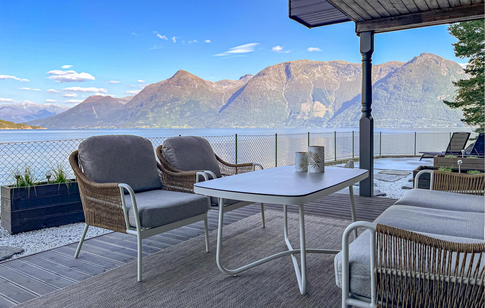 Nyd jeres ferie i dette eksklusive feriehus med panoramaudsigt over fjord og bjerge.
