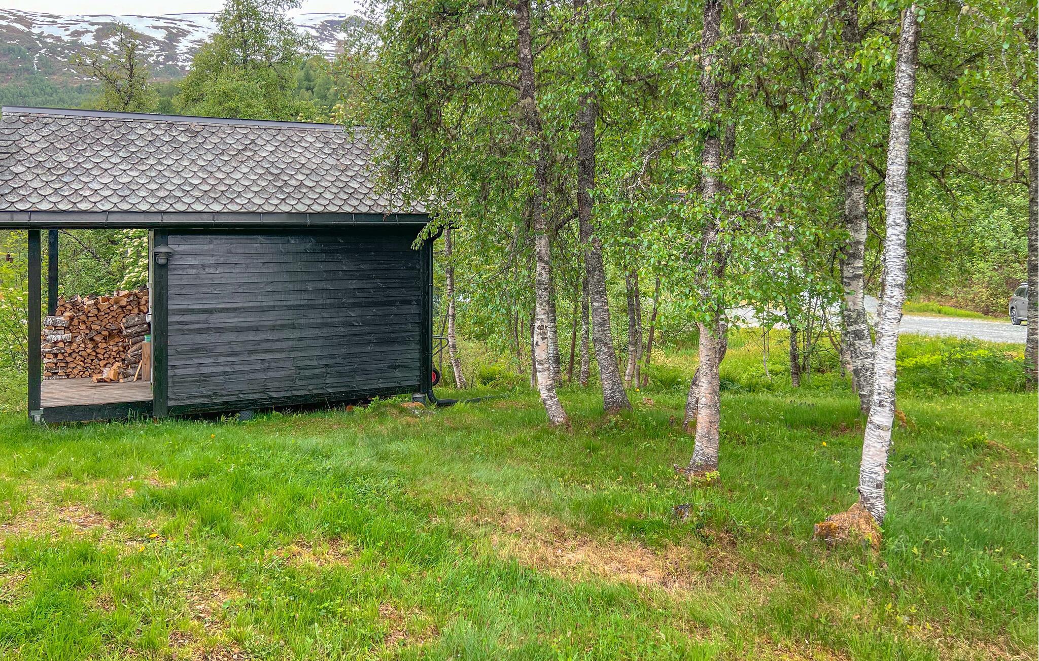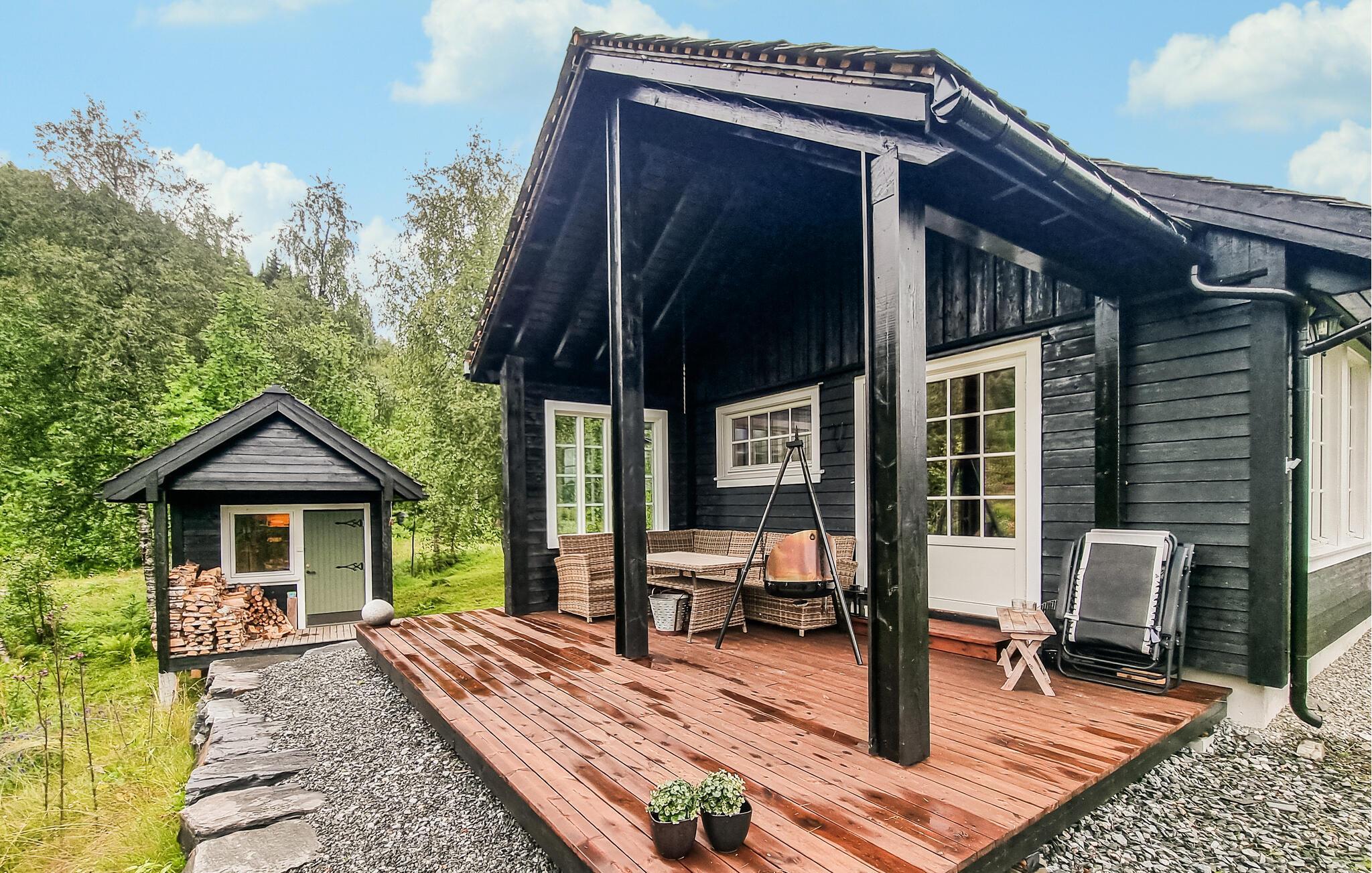 Dette hyggelige træhus er idyllisk beliggende i et malerisk landskab, omgivet af bjerge og det klare vand i Myrkdalsvatnet. Nyd den betagende udsigt fra den rummelige veranda. Inde i huset finder I en varm og indbydende atmosfære. Efter en dag med aktiviteter kan I slappe af i stuen med højt til loftet og stilfuldt træinteriør. Pejsen giver hyggelig varme og bidrager til hygge. Lav mad sammen i det åbne, moderne køkken og nyd måltiderne i godt selskab. Legetøjstoget vil helt sikkert glæde både børn og voksne.