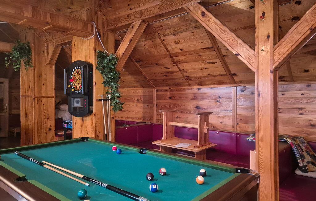 Nyd den varme atmosfære i det smukt designede interiør, og brug rummene til fælles madlavning, samtaler og rolige øjeblikke i en afslappet atmosfære. Glæd jer til masser af træ, synlige bjælker og en behagelig atmosfære under det høje tag. Hyg jer sammen i den rummelige stuesofa, og tilbring rolige aftener omkring det store bord. Udfordr hinanden til et spil billard, dart eller bordfodbold, og tilbered jeres måltider i det funktionelle køkken, som er fuldt udstyret.