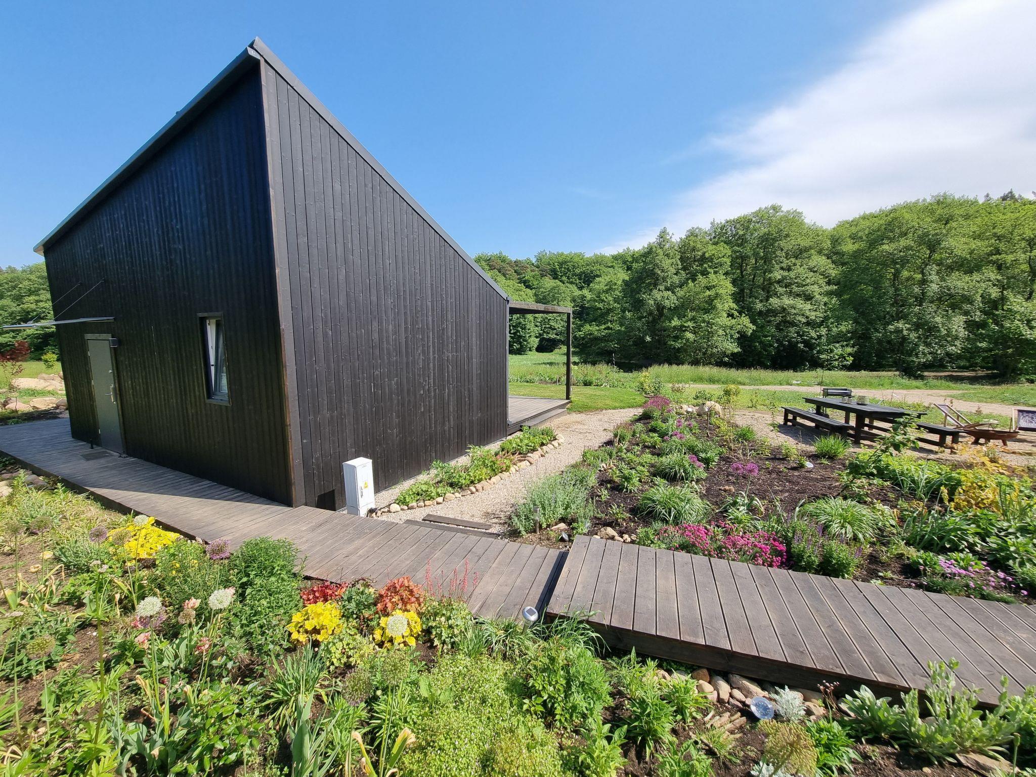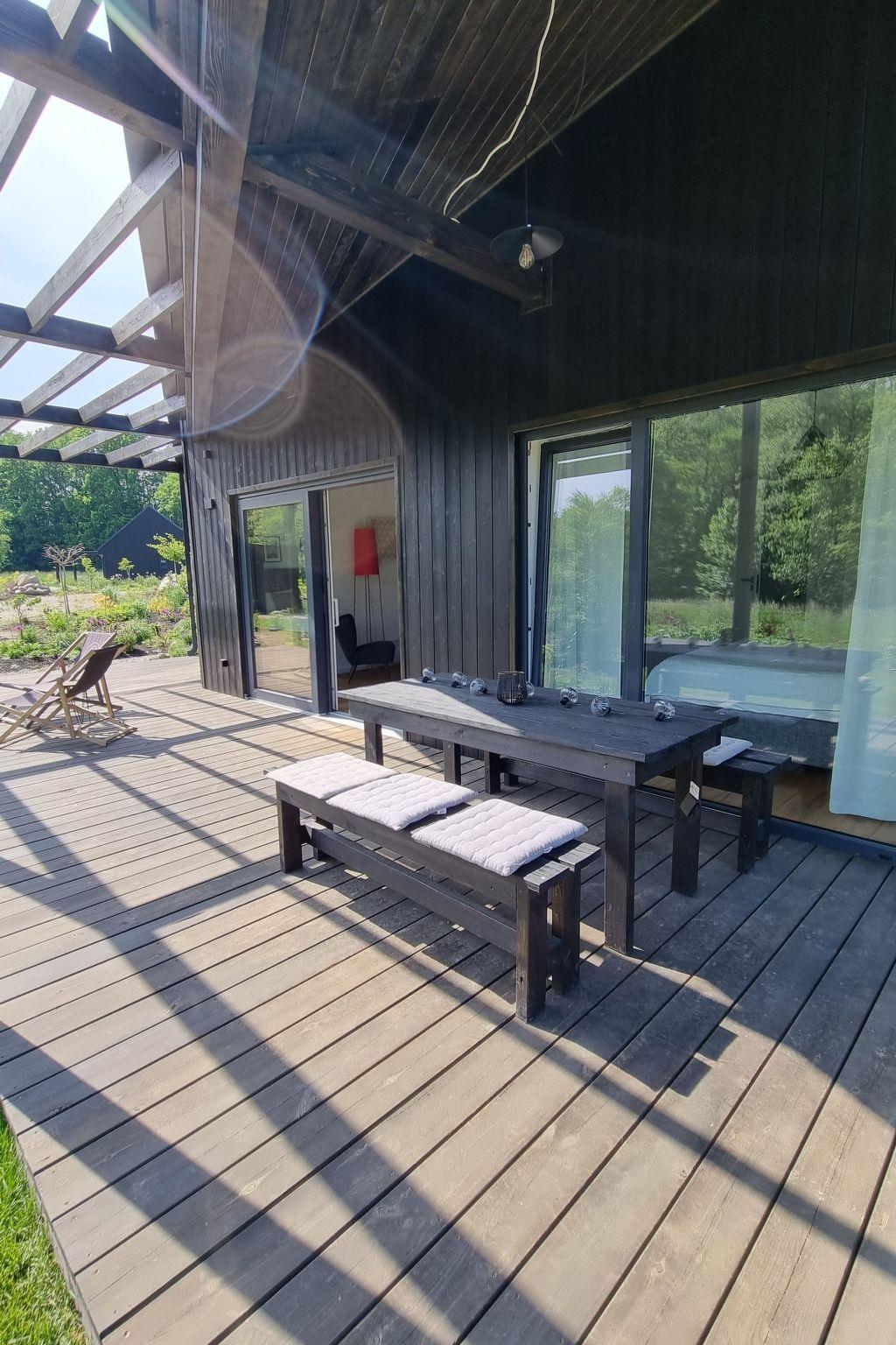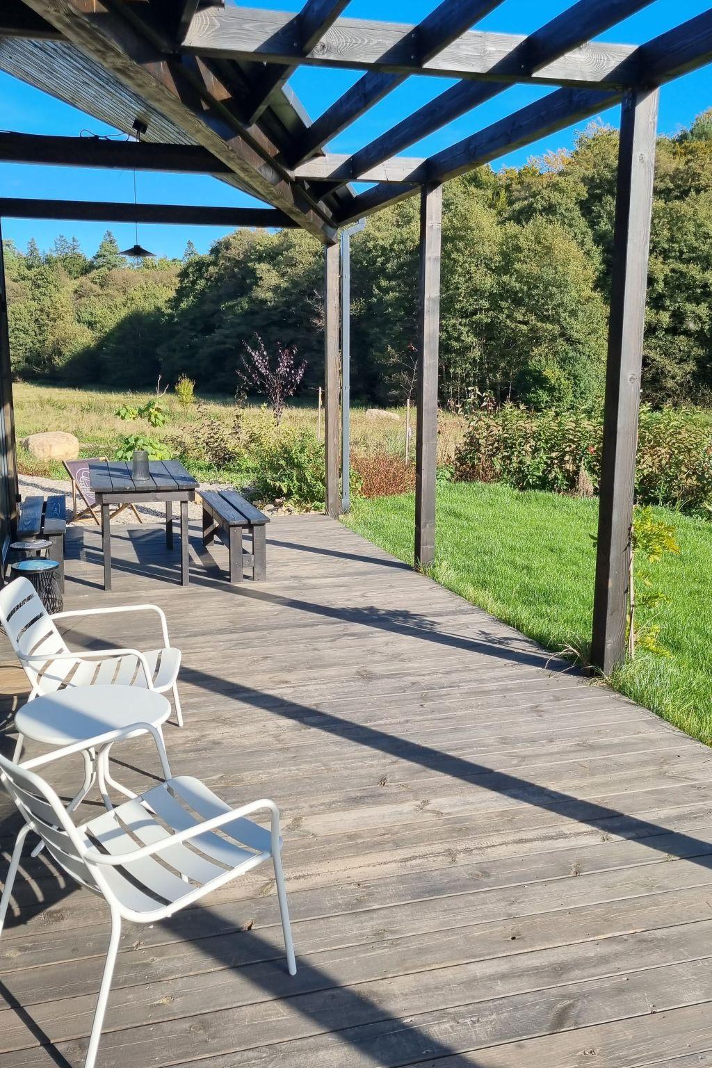 In the cottages for two people you will find a cosy living room with a kitchenette, a comfortable bedroom and a bathroom with a shower. Our cottages are modernly equipped with kitchen utensils, including a fridge, induction hob and complete crockery set. In addition to your comfort, there is a hotel bed measuring 1.6x2 metres in the bedroom, which can be split to 0.80x2 metres to suit individual needs. On the wooden terrace with a comfortable seating area, you can relax and enjoy the fresh air and the surrounding nature.