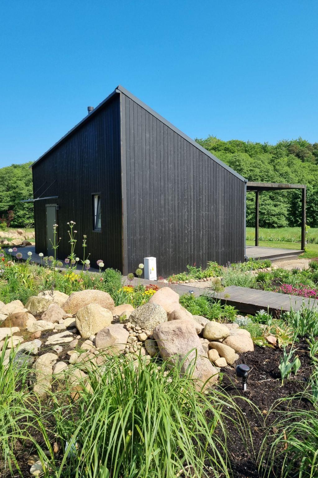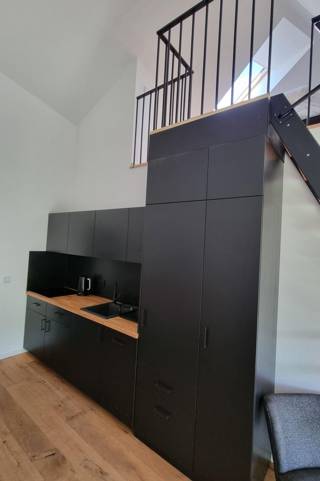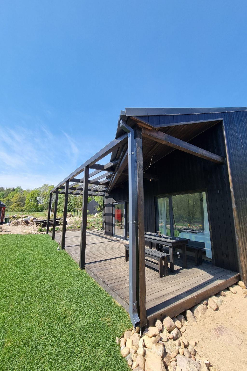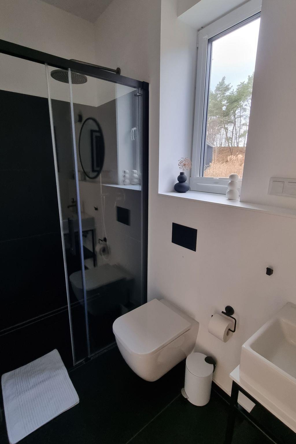 In the cottages for two people you will find a cosy living room with a kitchenette, a comfortable bedroom and a bathroom with a shower. Our cottages are modernly equipped with kitchen utensils, including a fridge, induction hob and complete crockery set. In addition to your comfort, there is a hotel bed measuring 1.6x2 metres in the bedroom, which can be split to 0.80x2 metres to suit individual needs. On the wooden terrace with a comfortable seating area, you can relax and enjoy the fresh air and the surrounding nature.