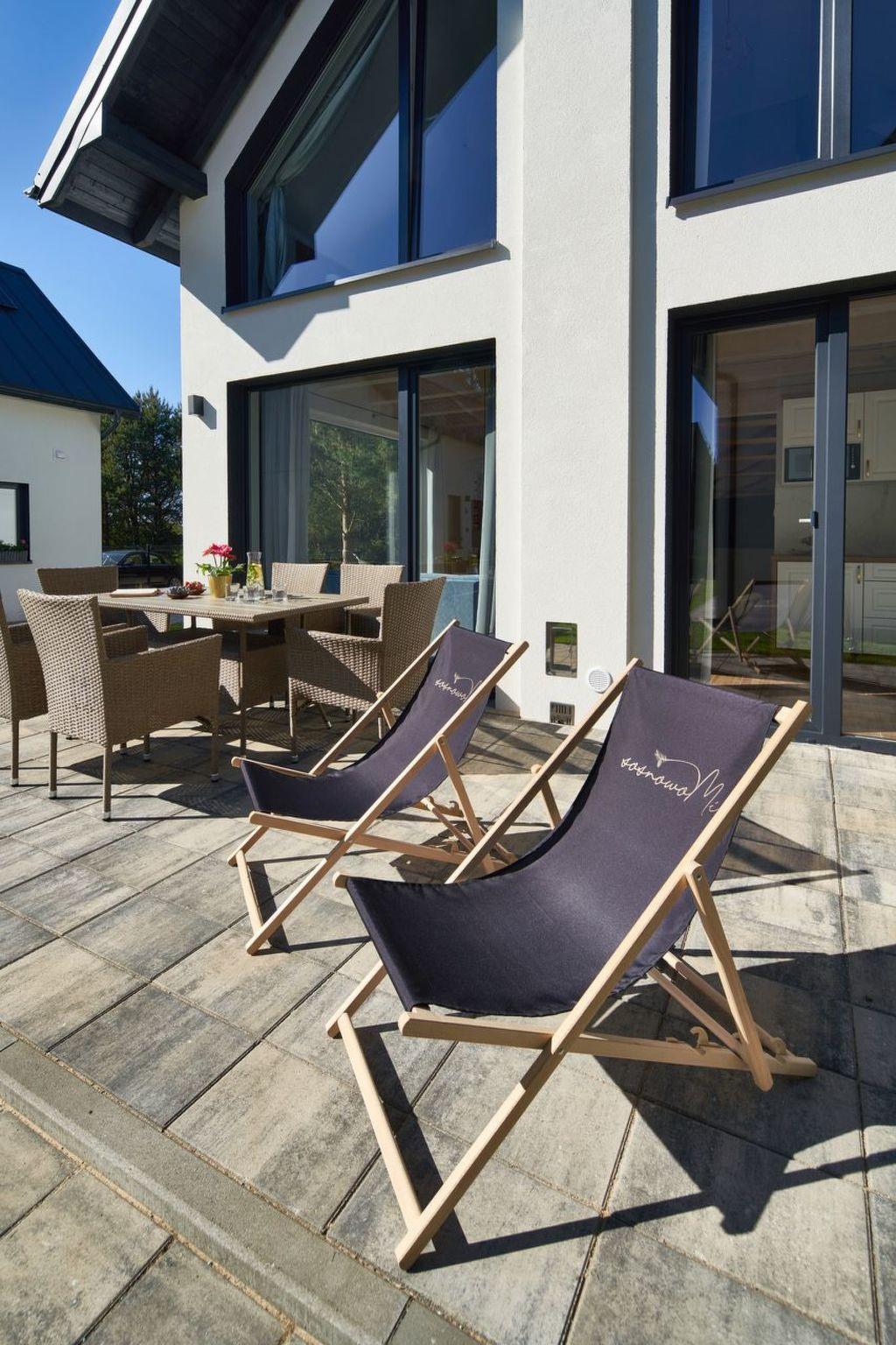 Each house is equipped with a dishwasher, fridge, hob, microwave, kettle, filter coffee maker and crockery. In the bathroom you will find towels, a hairdryer. Each house has a large terrace equipped with a seating area and sun loungers. There is free parking on the premises. Our houses have WiFi with restrictions (not all rooms).