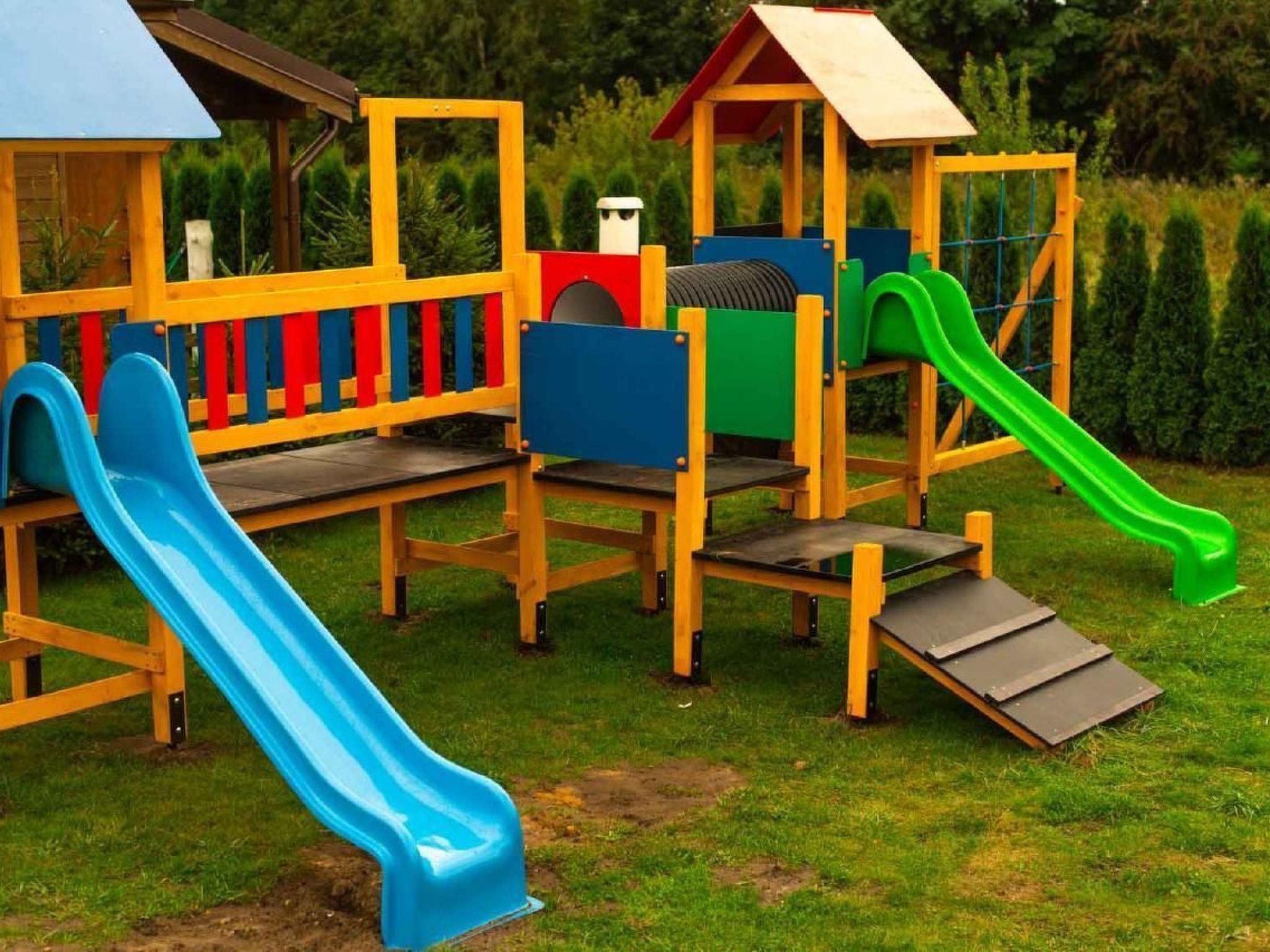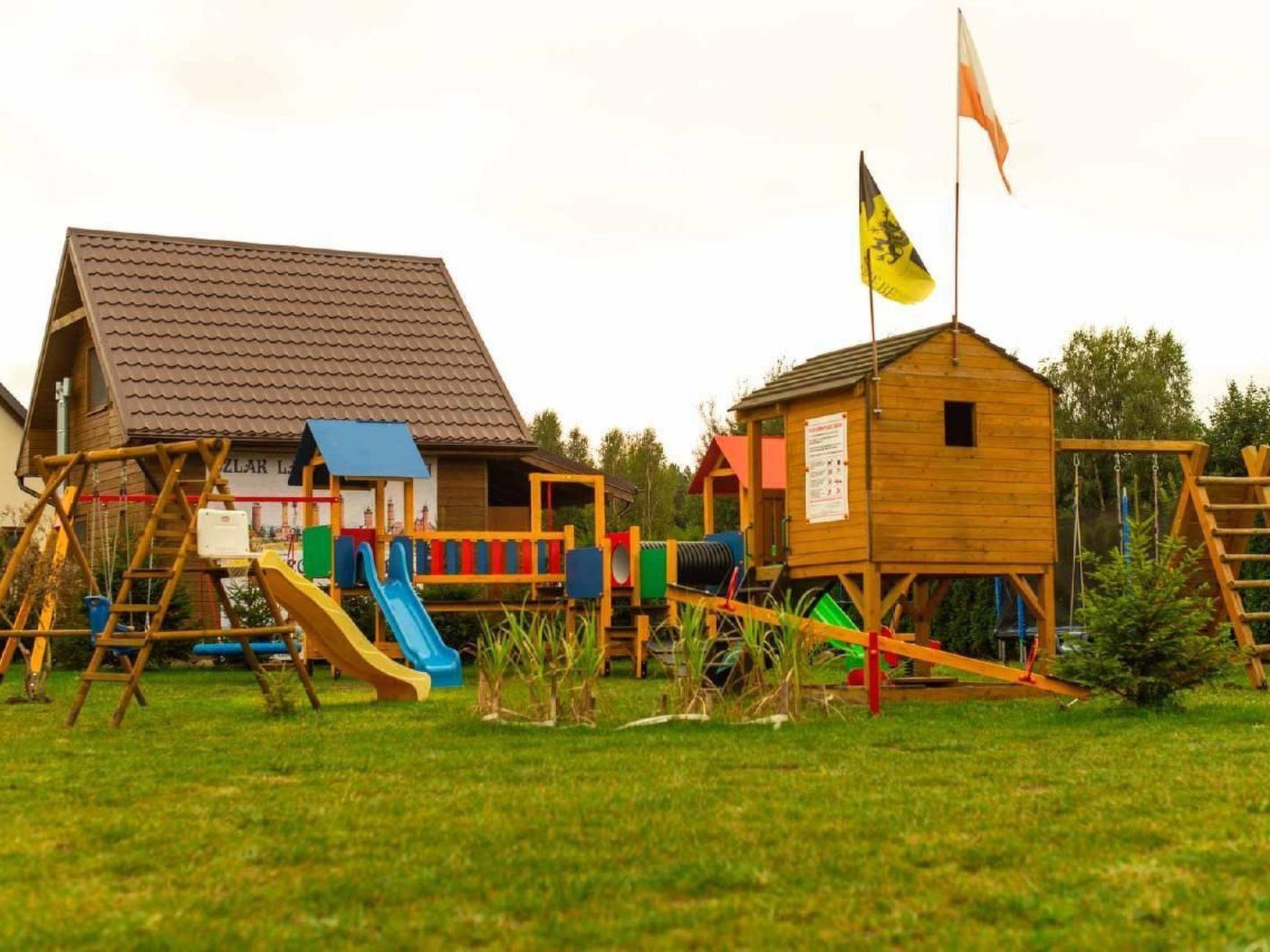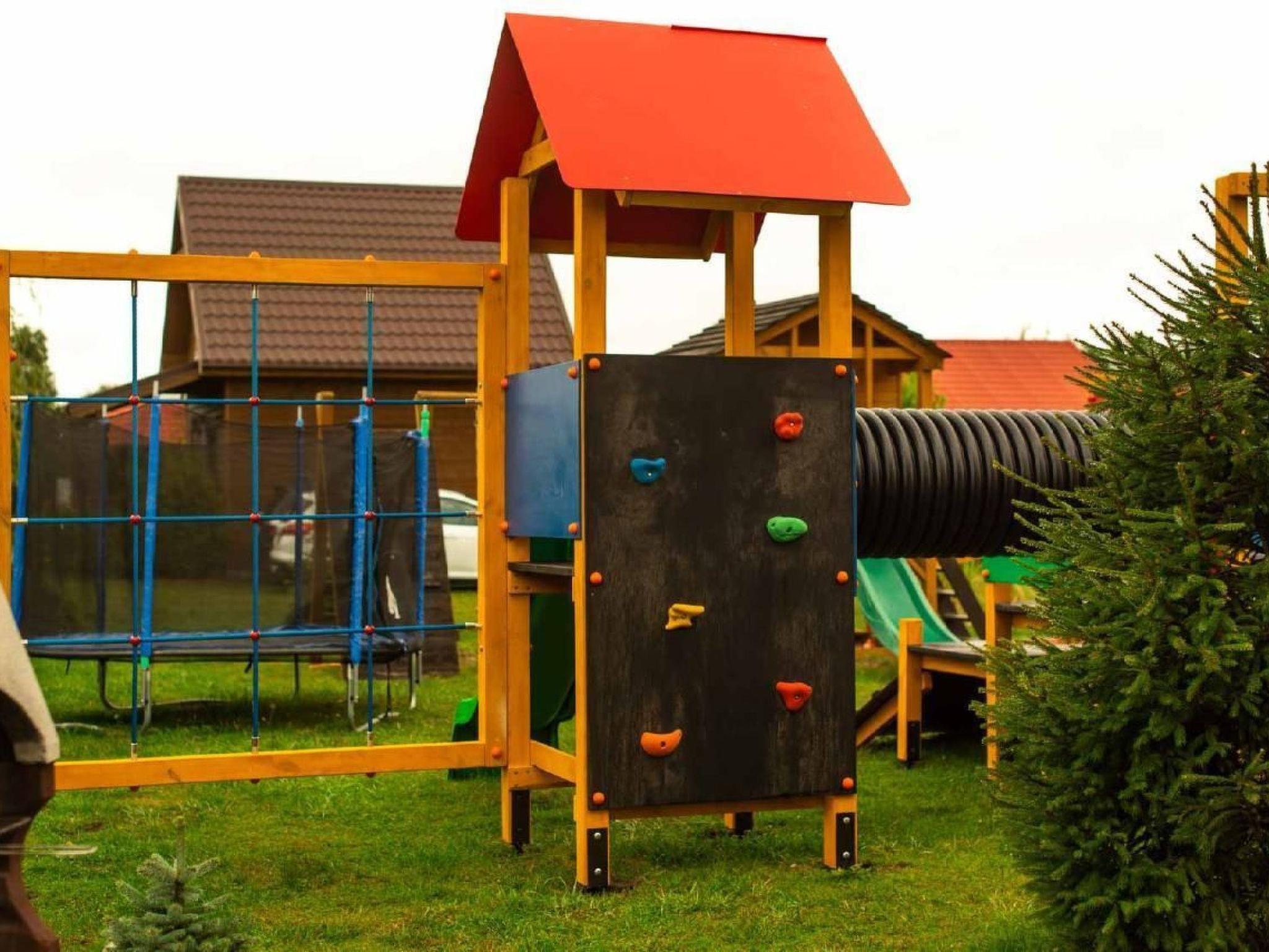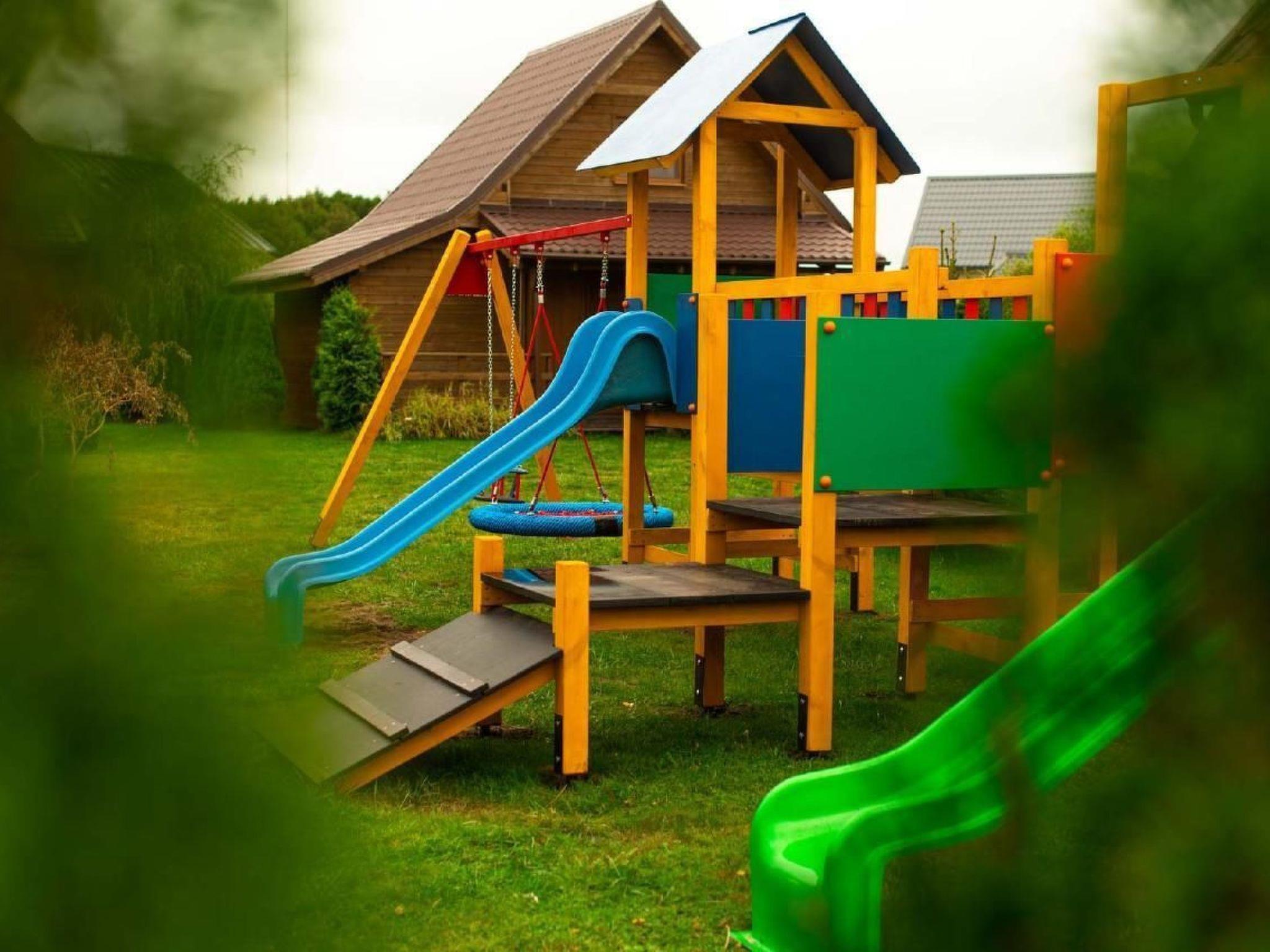 Outside, next to each cottage there is a covered terrace - an ideal place for evening conversations and relaxing moments. And for our youngest guests we have prepared a safe playground, equipped with a slide, sandpit, swing and trampoline. The plot is fully fenced, which guarantees privacy and a peaceful holiday.