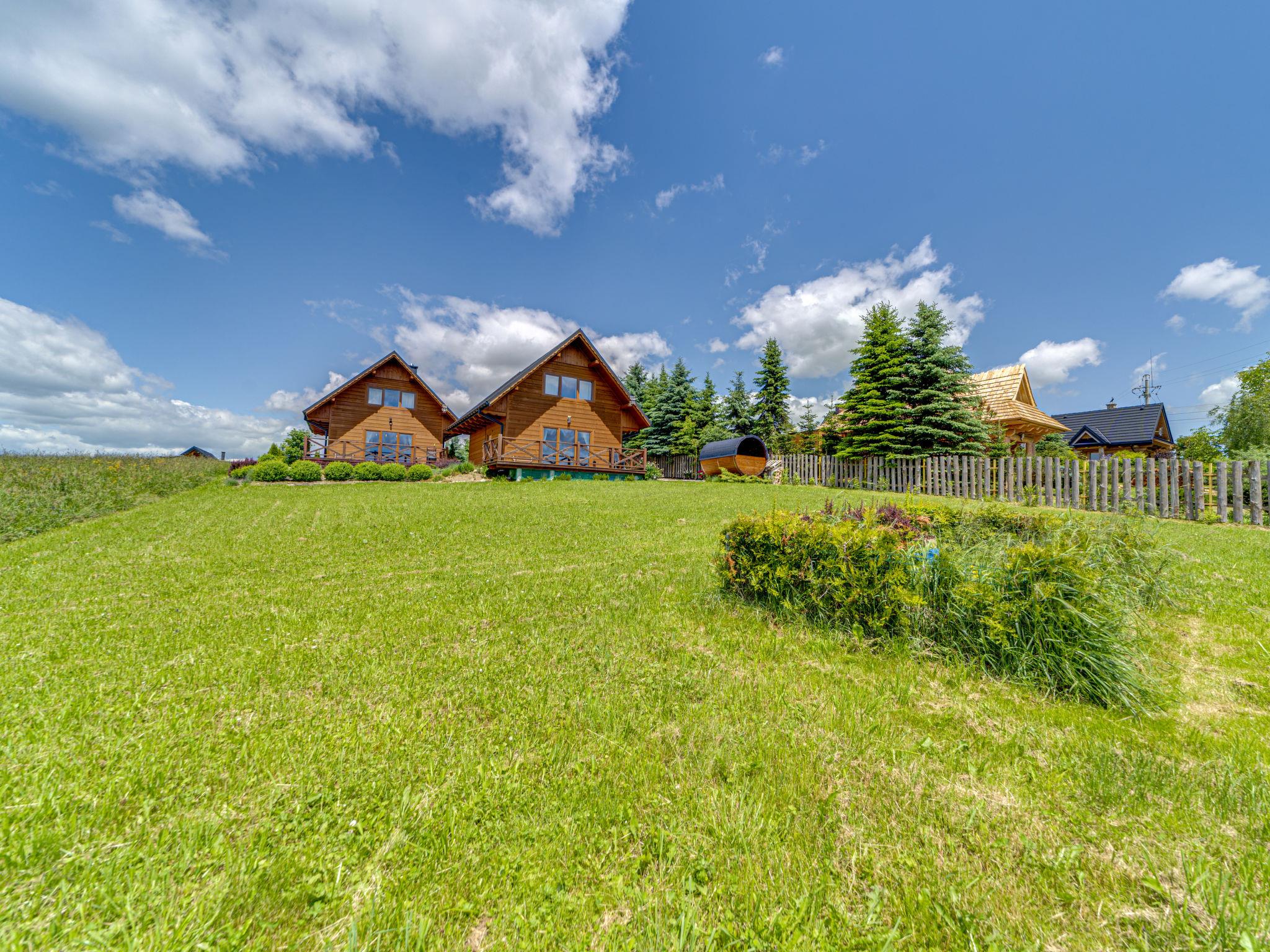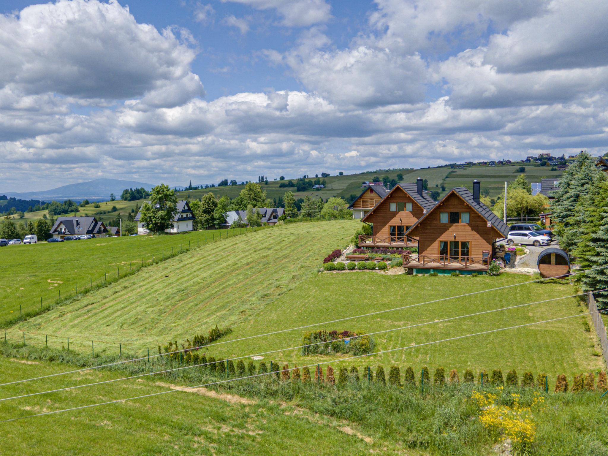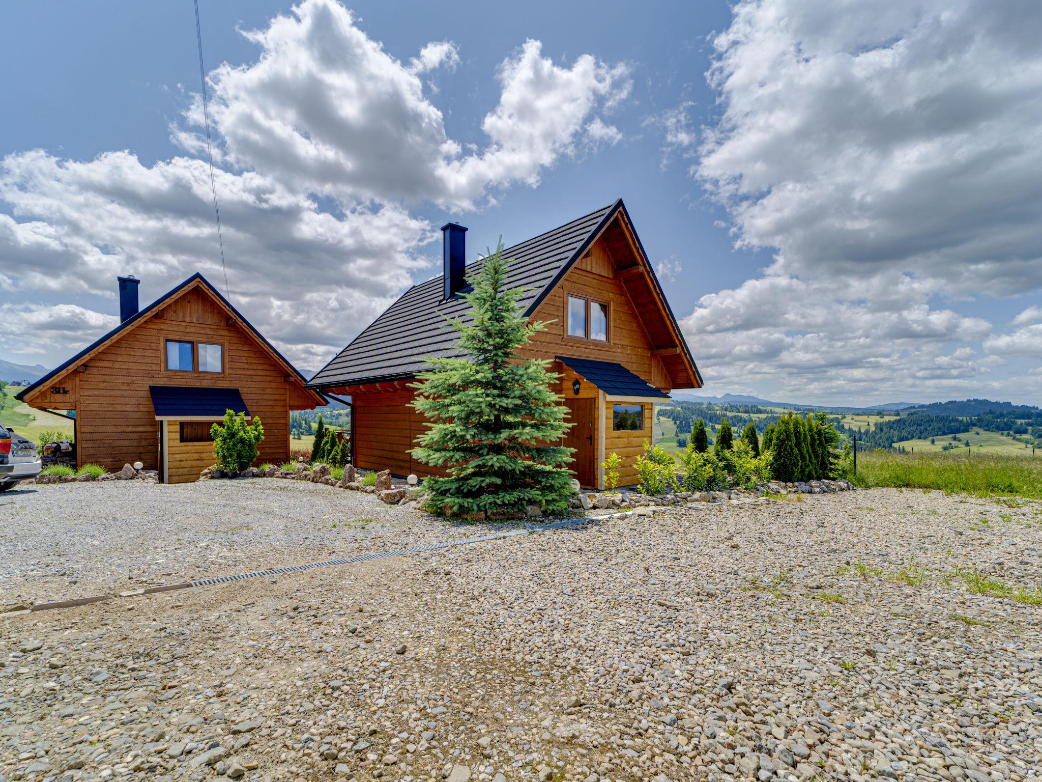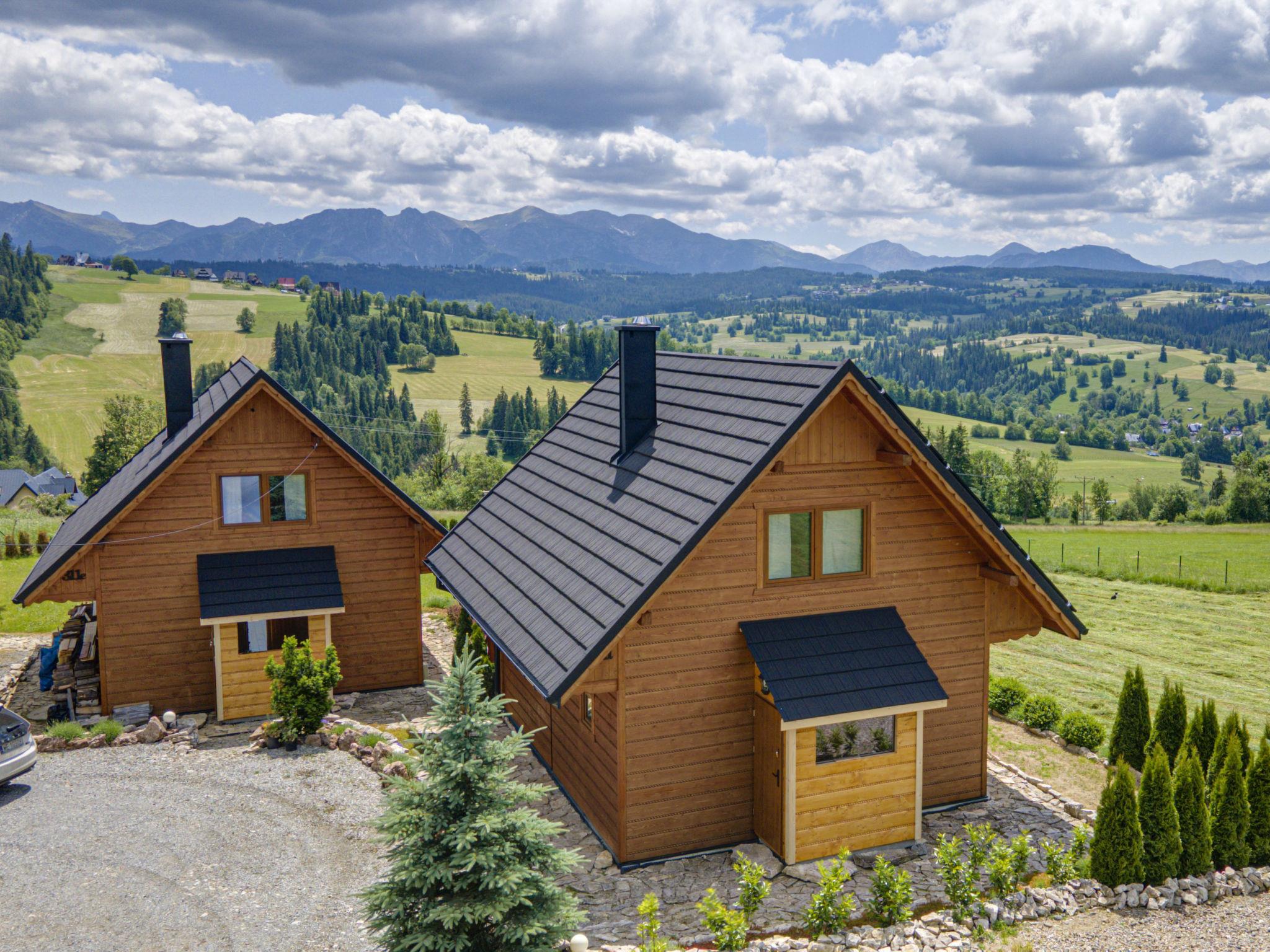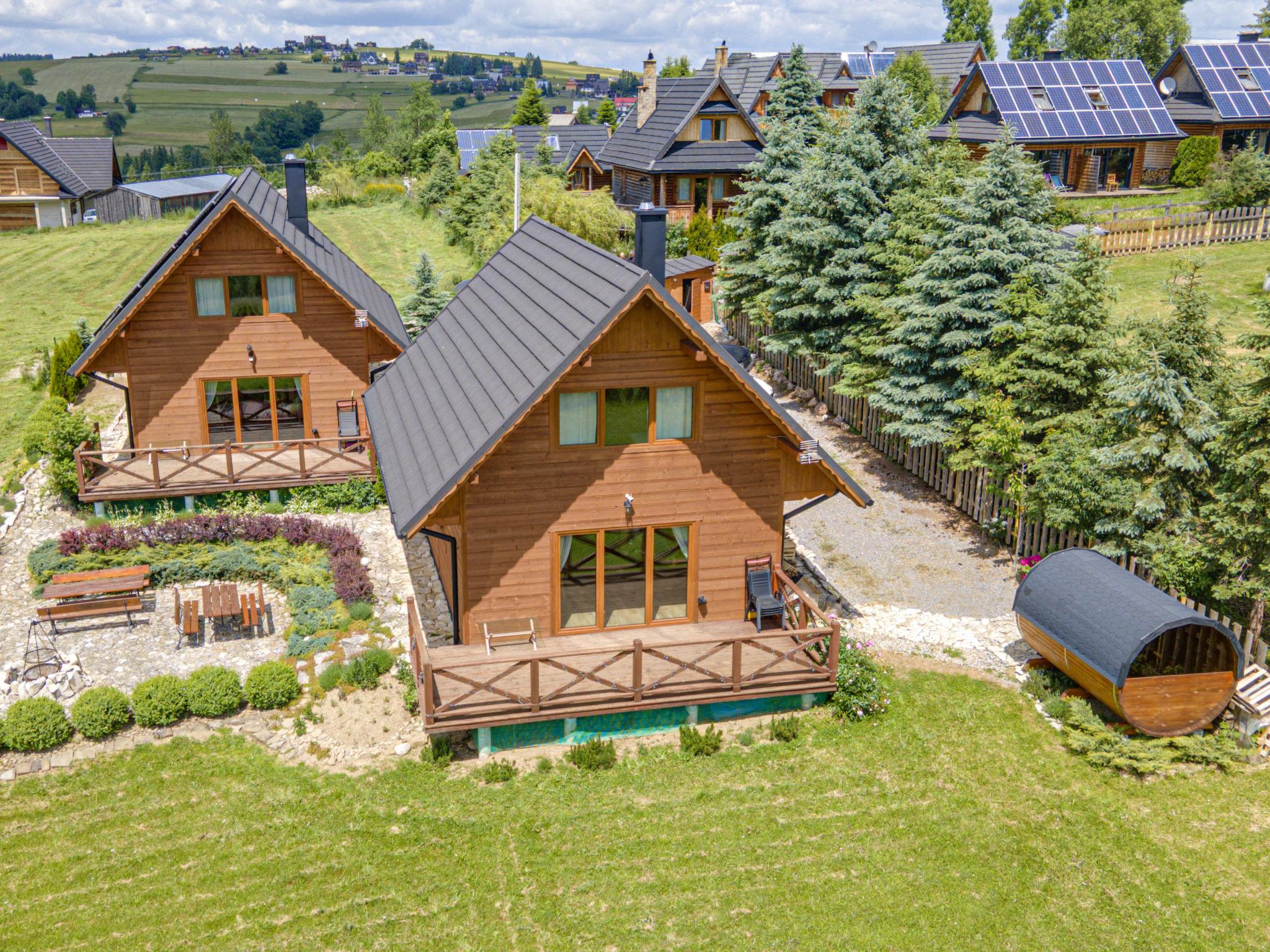 Cosy, comfortable chalet, built in 2020. 2 houses in the resort. On the outskirts, in a sunny, elevated position, in the countryside. For shared use: property, meadow. Barbecue. In the house: WiFi, sauna, washing machine, tumble dryer. Parking at the house. Grocery 300 m, supermarket 2.5 km, restaurant 1 km, bus stop 300 m, railway station 5 km, indoor swimming pool 1.5 km, public bathing area 8 km. Riding stable 3 km. Nearby attractions: Szlak Rowerowy Wokól Tatr, Suche 6 km, Zakopane 12 km. Well-known ski regions can easily be reached: Czerwienne SKI 2.5 km, Zab 3 km, Harenda 5.5 km. Please note: the complex has another 2 houses for rent.