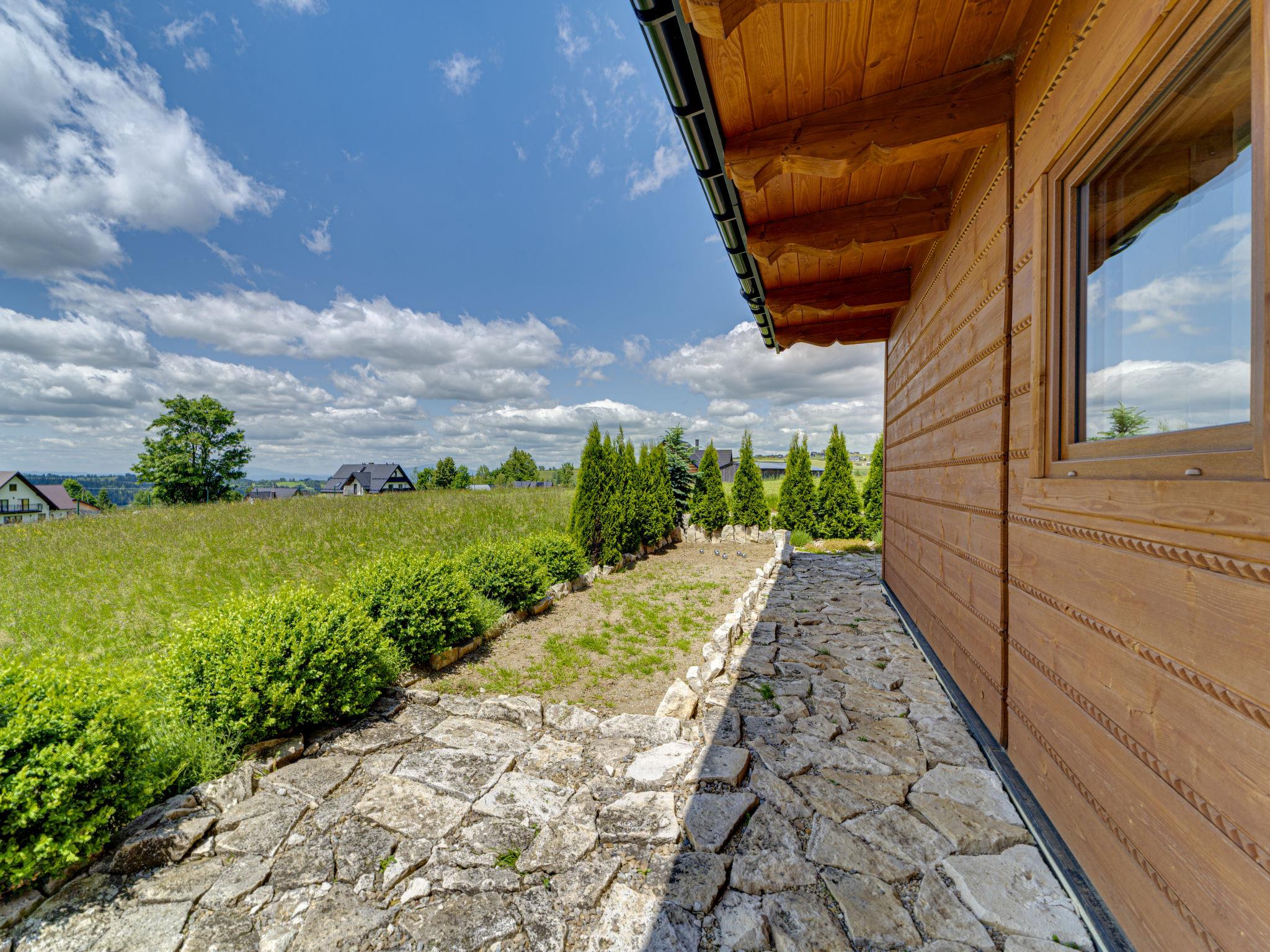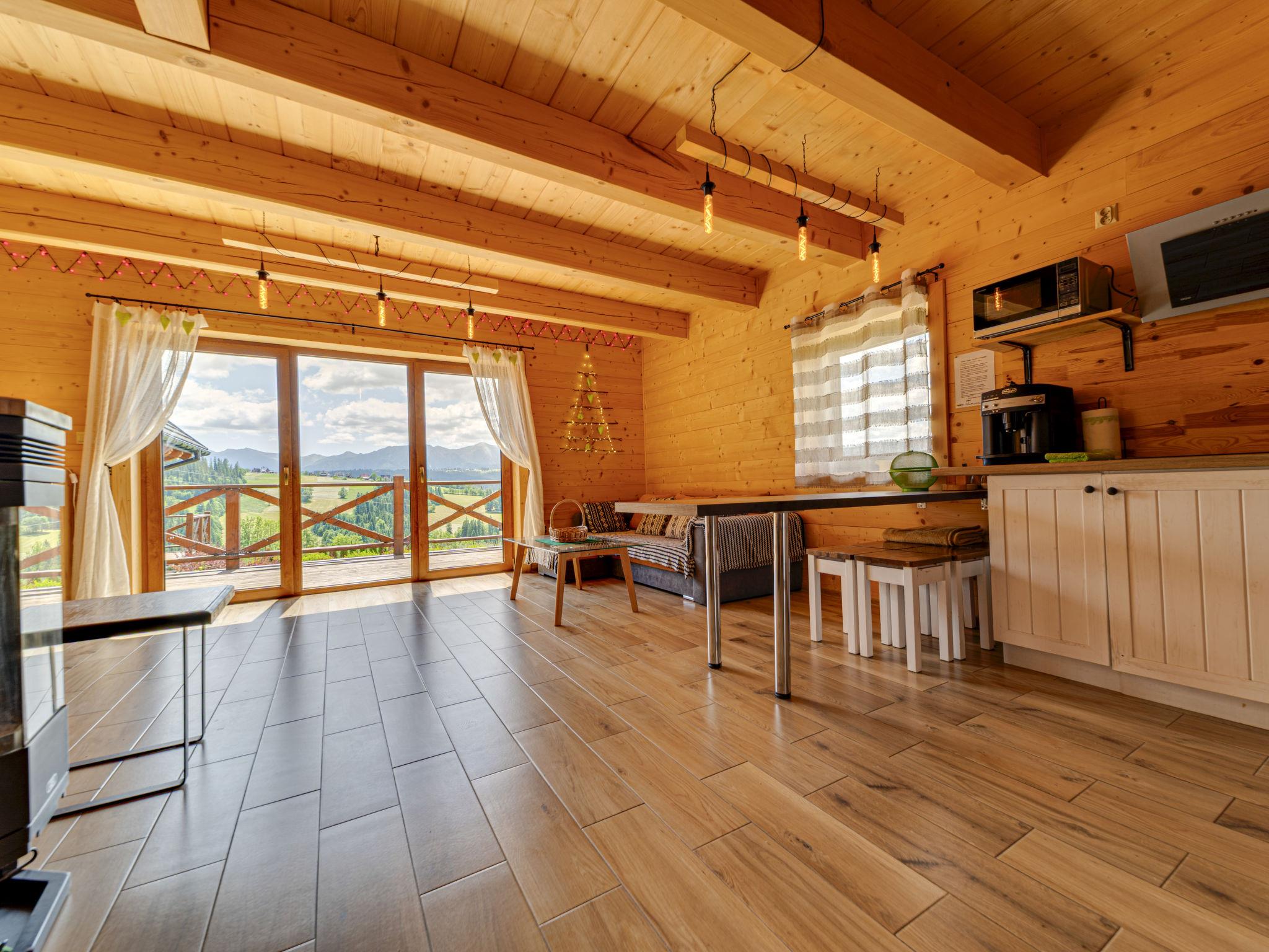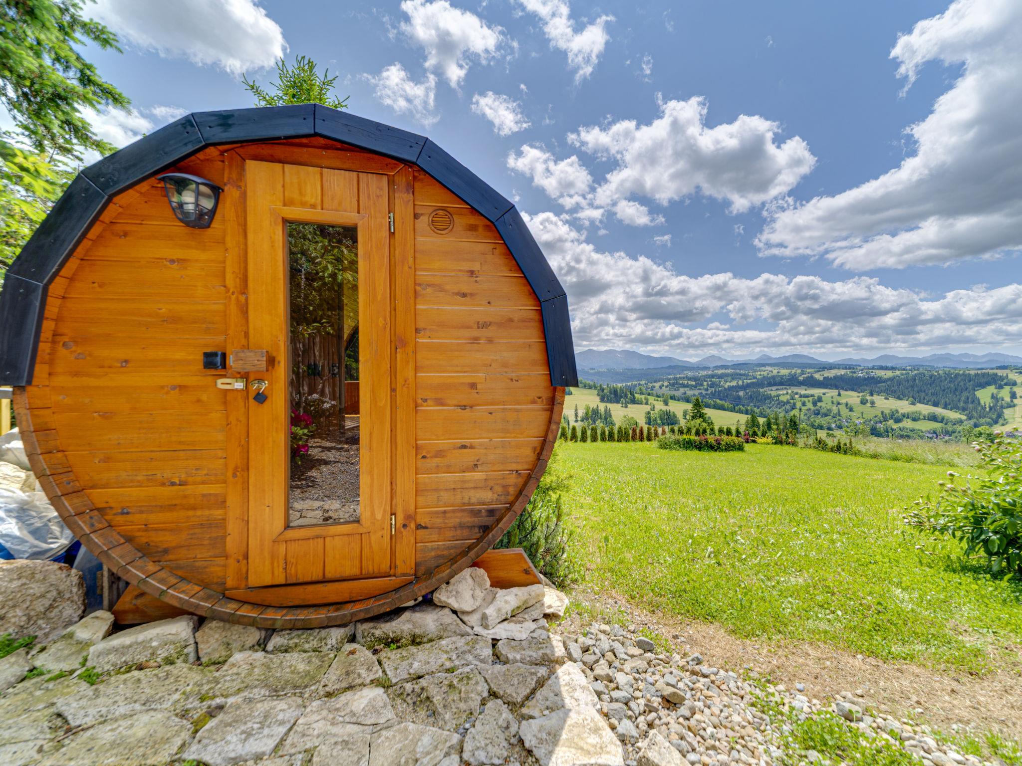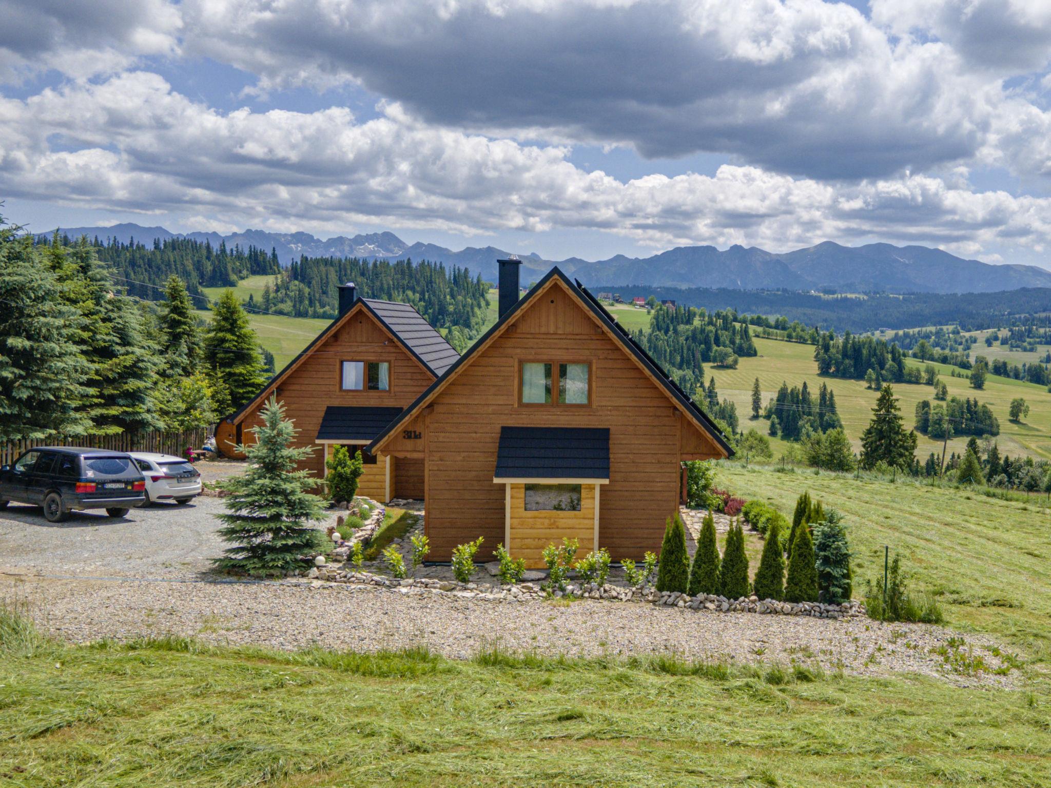 Cosy, comfortable chalet, built in 2020. 2 houses in the resort. On the outskirts, in a sunny, elevated position, in the countryside. For shared use: property, meadow. Barbecue. In the house: WiFi, sauna, washing machine, tumble dryer. Parking at the house. Grocery 300 m, supermarket 2.5 km, restaurant 1 km, bus stop 300 m, railway station 5 km, indoor swimming pool 1.5 km, public bathing area 8 km. Riding stable 3 km. Nearby attractions: Szlak Rowerowy Wokól Tatr, Suche 6 km, Zakopane 12 km. Well-known ski regions can easily be reached: Czerwienne SKI 2.5 km, Zab 3 km, Harenda 5.5 km. Please note: the complex has another 2 houses for rent.