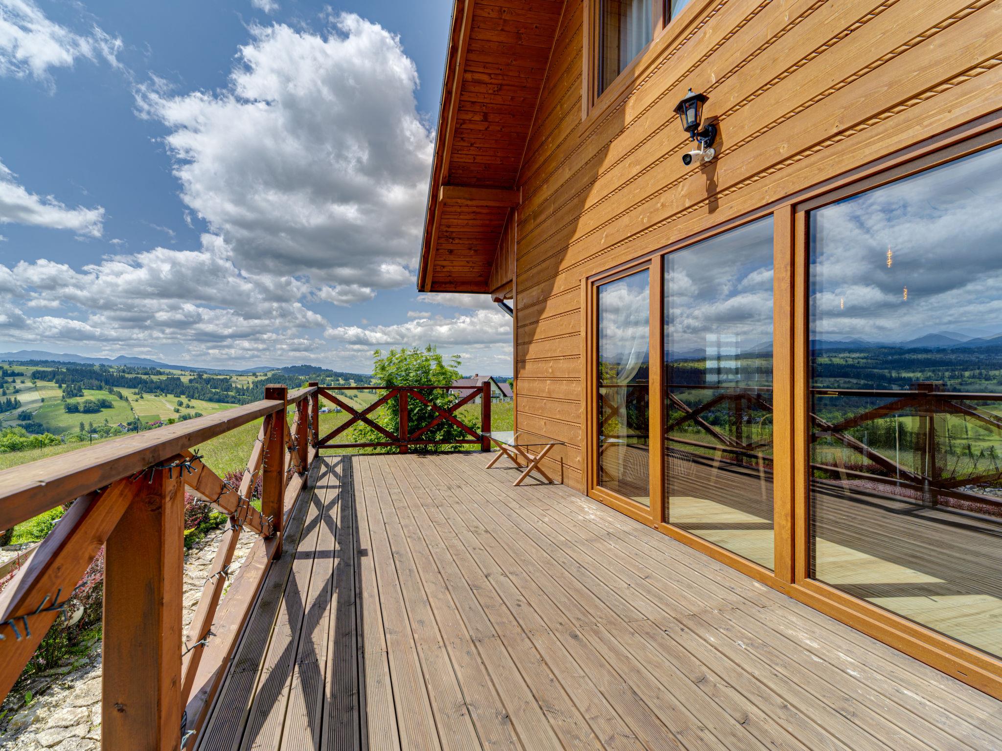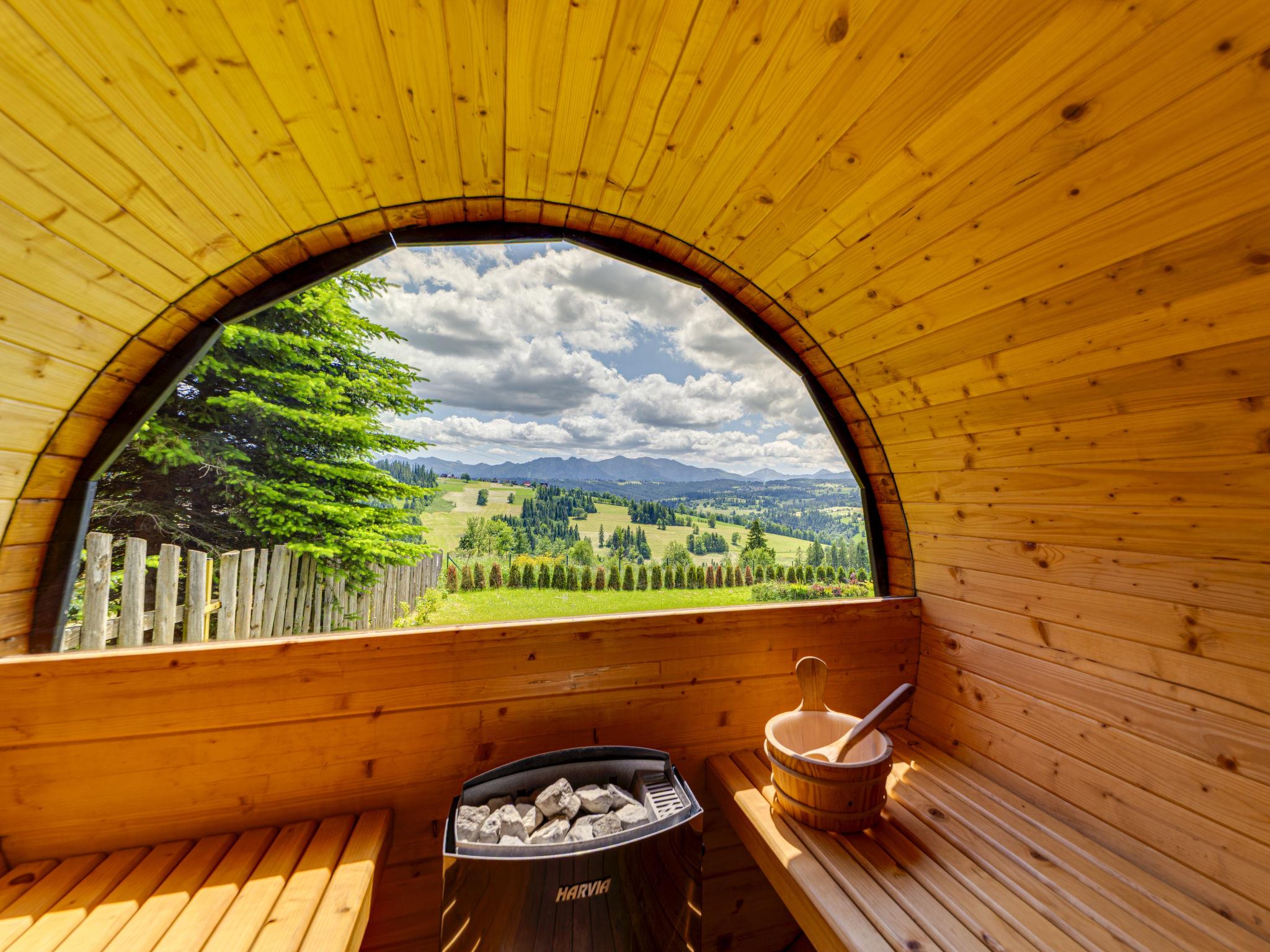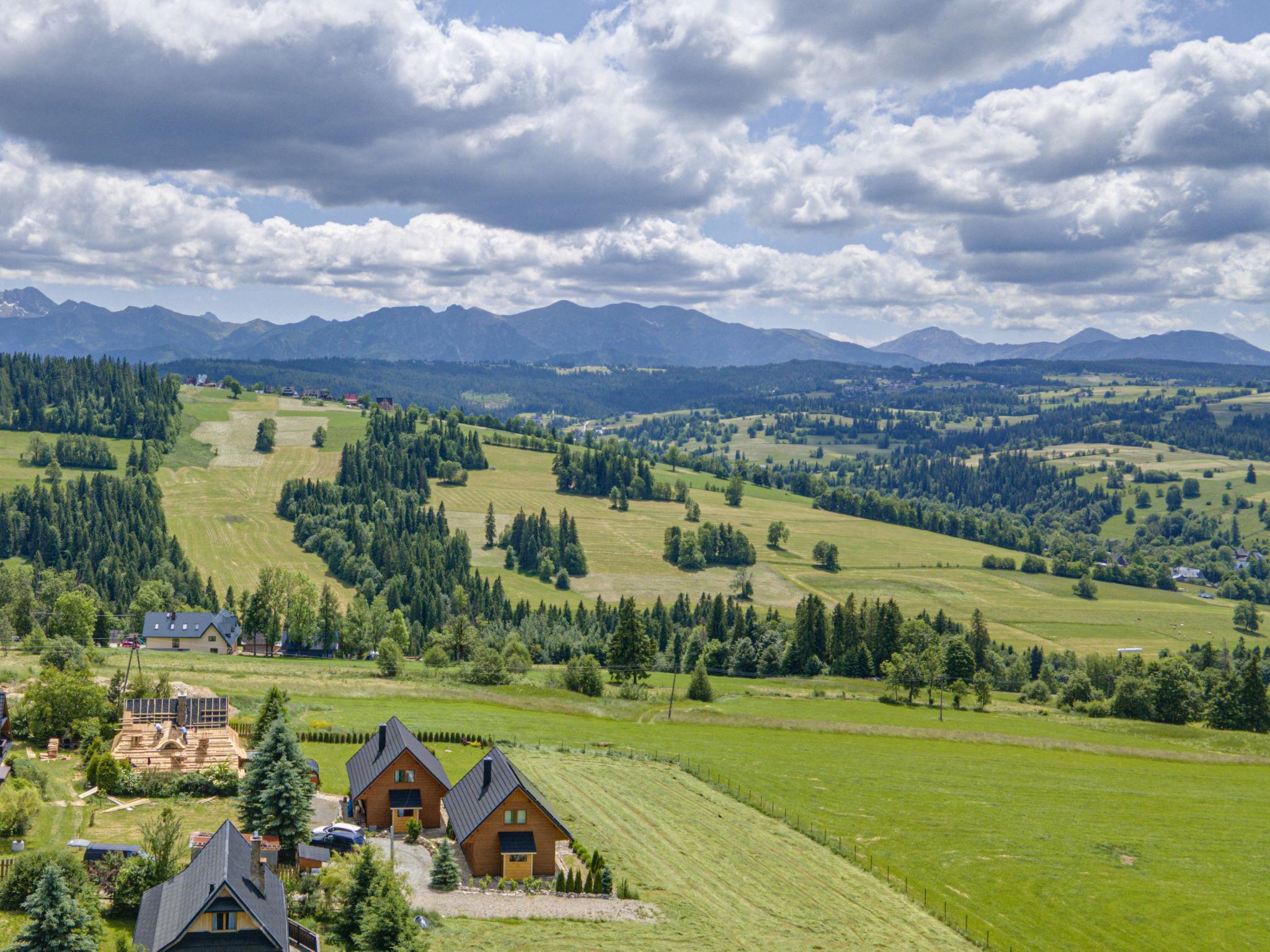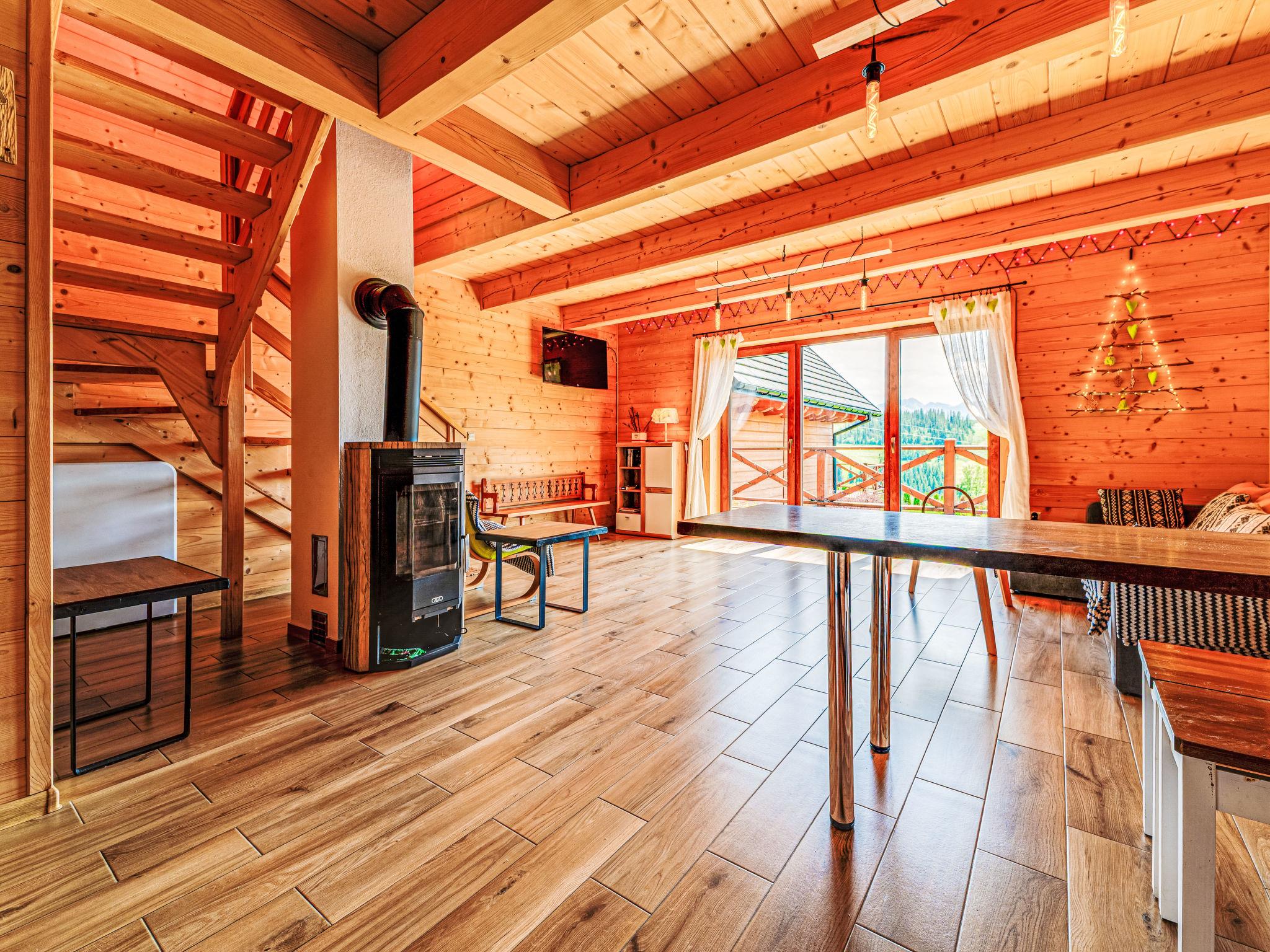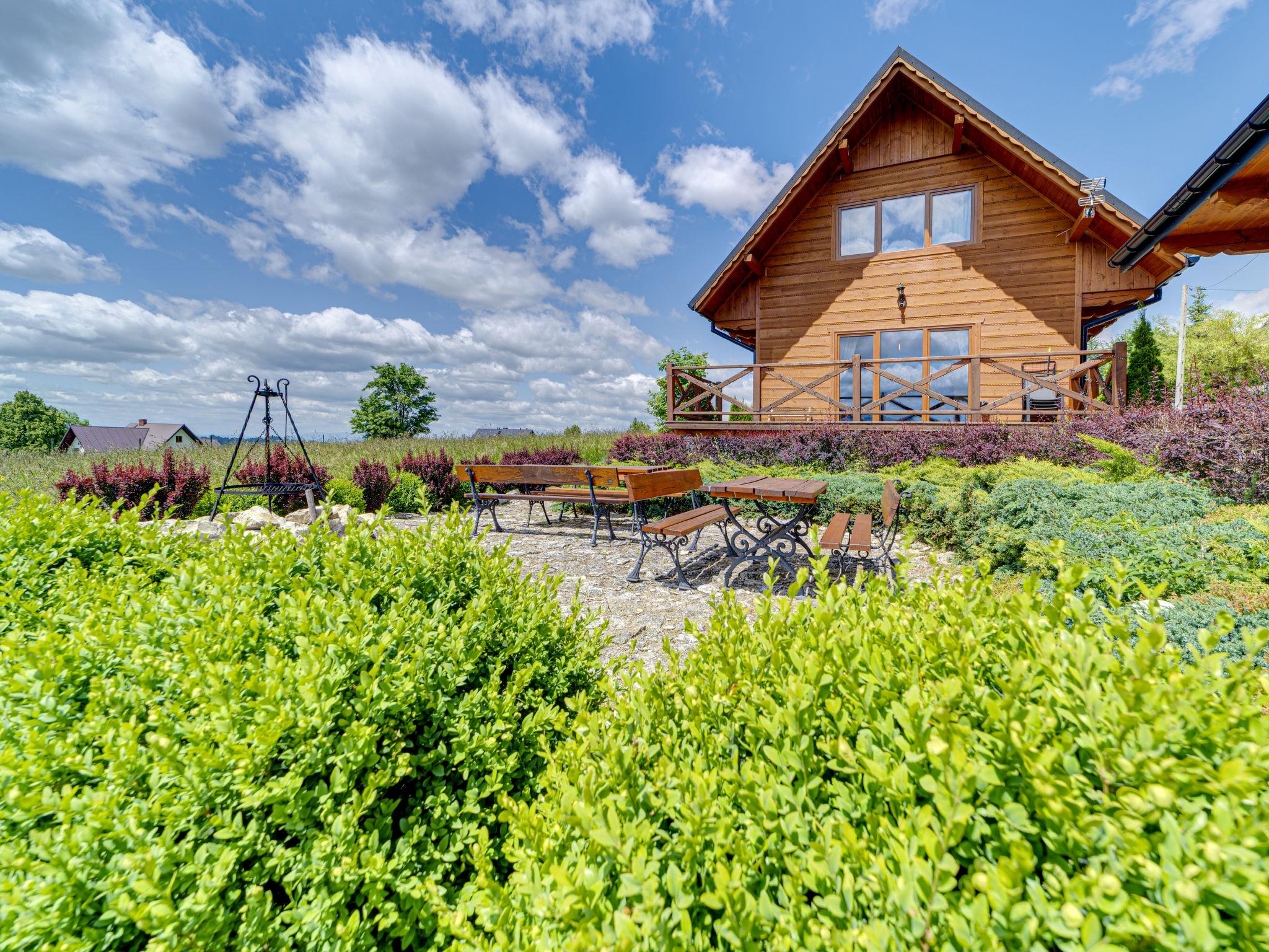 Cosy, comfortable chalet, built in 2020. 2 houses in the resort. On the outskirts, in a sunny, elevated position, in the countryside. For shared use: property, meadow. Barbecue. In the house: WiFi, sauna, washing machine, tumble dryer. Parking at the house. Grocery 300 m, supermarket 2.5 km, restaurant 1 km, bus stop 300 m, railway station 5 km, indoor swimming pool 1.5 km, public bathing area 8 km. Riding stable 3 km. Nearby attractions: Szlak Rowerowy Wokól Tatr, Suche 6 km, Zakopane 12 km. Well-known ski regions can easily be reached: Czerwienne SKI 2.5 km, Zab 3 km, Harenda 5.5 km. Please note: the complex has another 2 houses for rent.