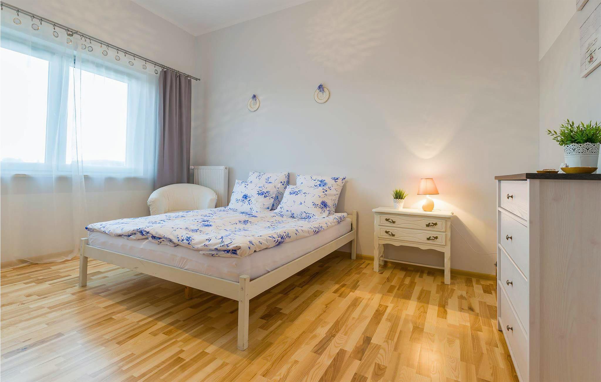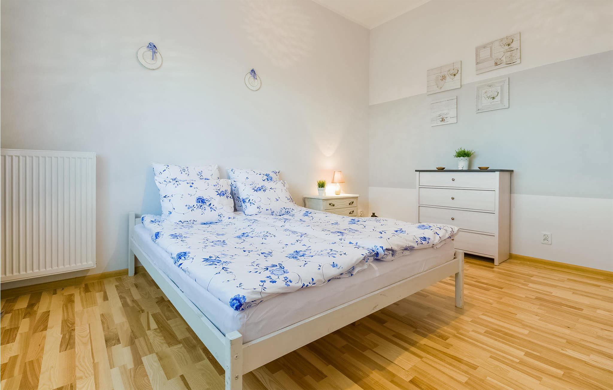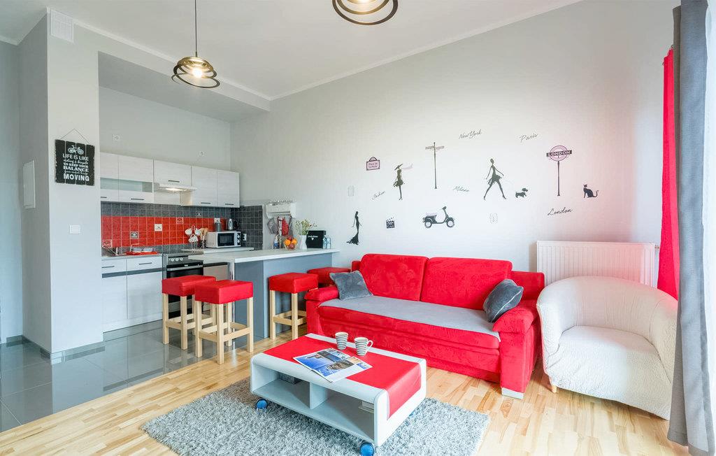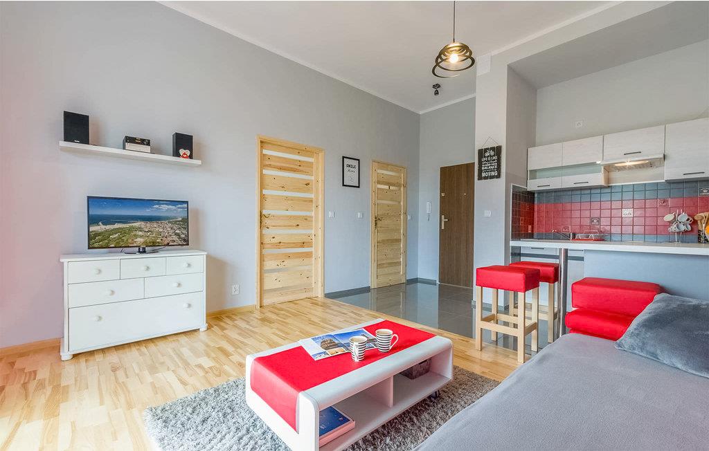 Nyd en afslappende ferie i denne moderne møblerede lejlighed nær kysten. Træd ind i den indbydende opholdsstue og sæt jer til rette i den komfortable sofa, perfekt til at læse eller blot slappe af. Tilbered måltider i det kompakte køkken, saml jer omkring det hævede køkkenbord med dets komfortable barstole, og nyd at tilbringe tid sammen i det åbne køkken. Træd ud på terrassen og indånd den friske havluft. De omkringliggende bygninger smelter harmonisk sammen med kystnære omgivelser og tilbyder nem adgang til store grønne områder. Udforsk den brede sandstrand i Darlówko, kun en kort gåtur væk. Besøg havnen med dens unikke vindebro, eller slentr til fyrtårnet, som tilbyder en fantastisk udsigt over kystlinjen. Tag en tur med havnetoget til Darlowo og besøg den pommerske hertugs slot. Cykl langs kyststierne mod Jaroslawiec, eller prøv frisk fisk på de charmerende restauranter ved vandet.