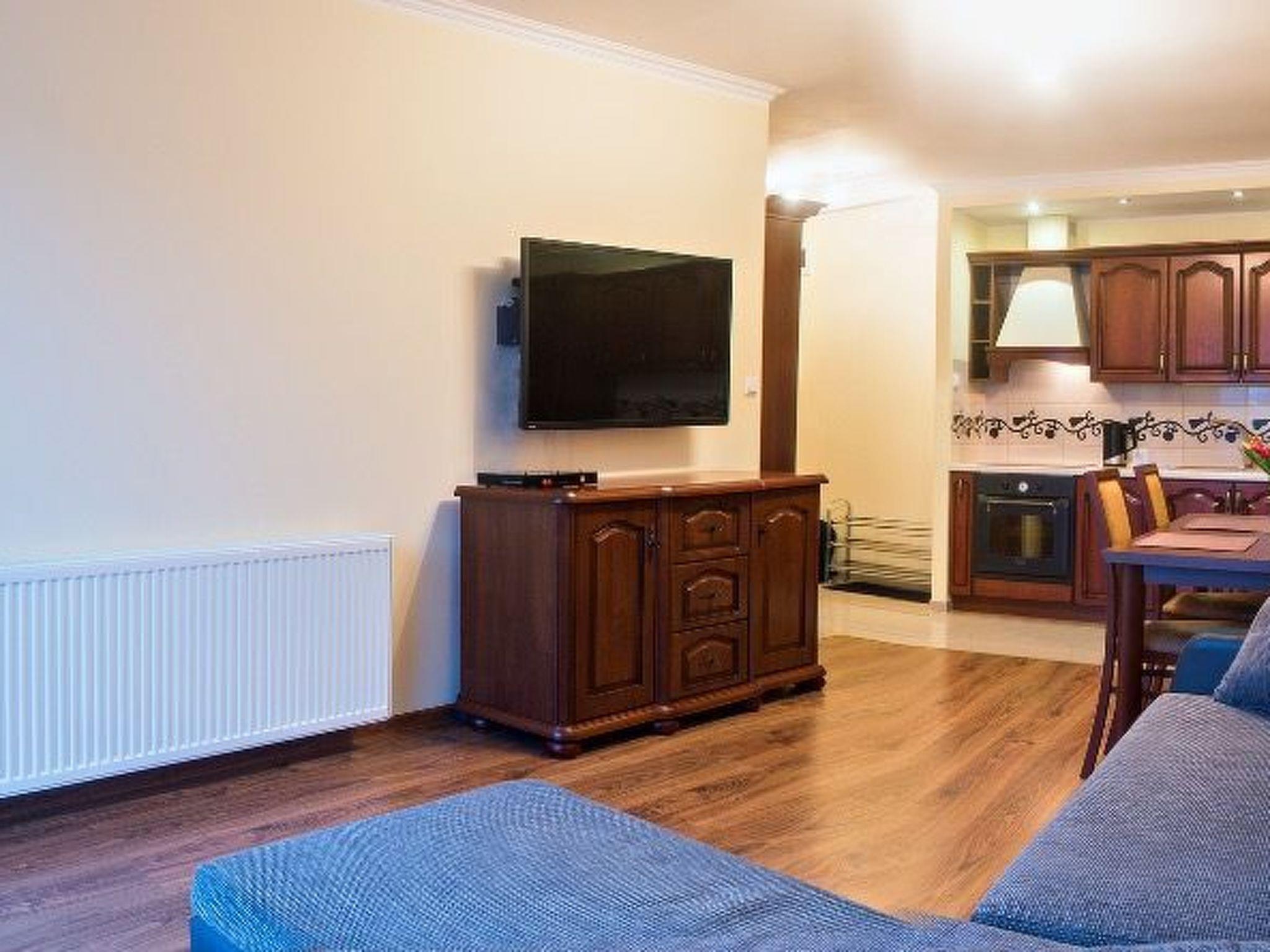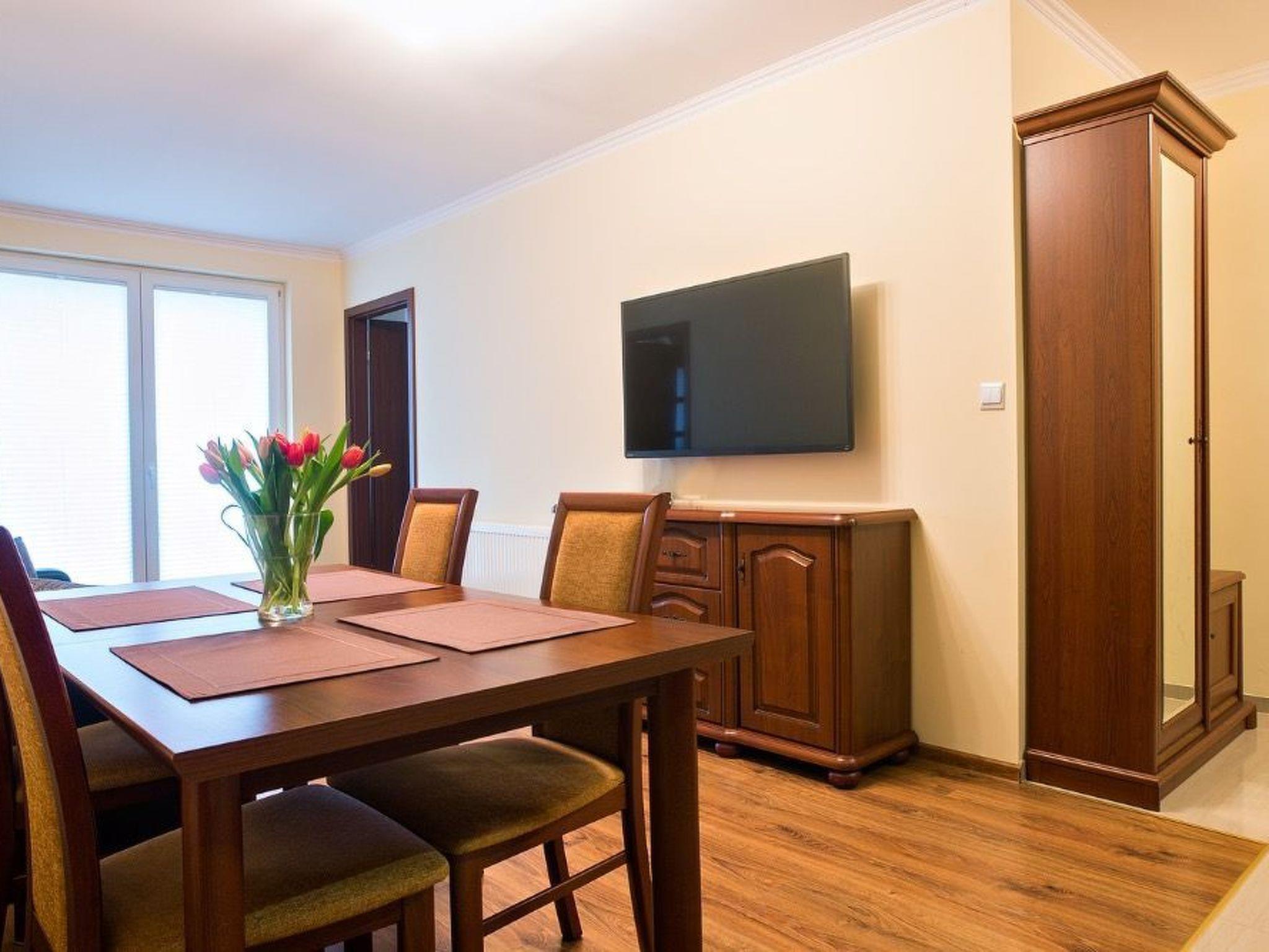 The flat consists of: 1. Comfortable, furnished living room with kitchenette: The kitchenette is fully equipped (induction hob, oven, large fridge with freezer, electric kettle, sink, complete tableware for 6 people, set of pots and pans), - Large dining table with chairs, - Comfortable corner sofa with sleeping function (for 2 people), - Large 50 inch TV with connection to many channels; 2. Bedroom with comfortable double bed 160x200, bedside table and cabinet 3. Second bedroom with two single beds 90x200, TV and chest of drawers 4. Bathroom with WC (washbasin, toilet, shower cubicle, washing machine) 5. Large sunny balcony (summer furniture set)