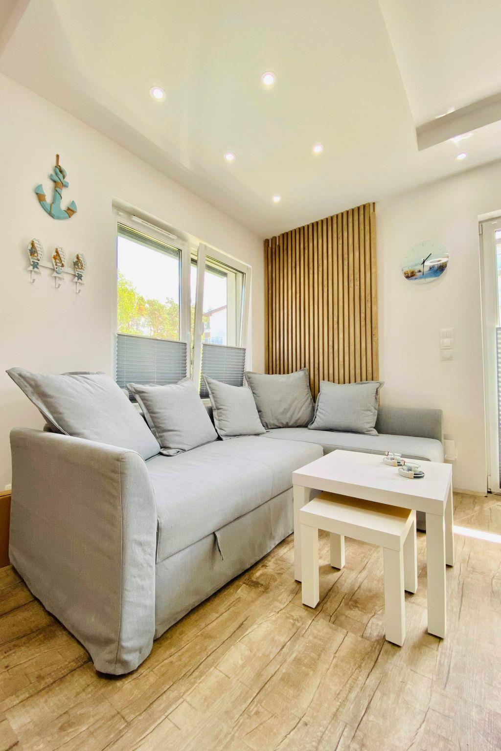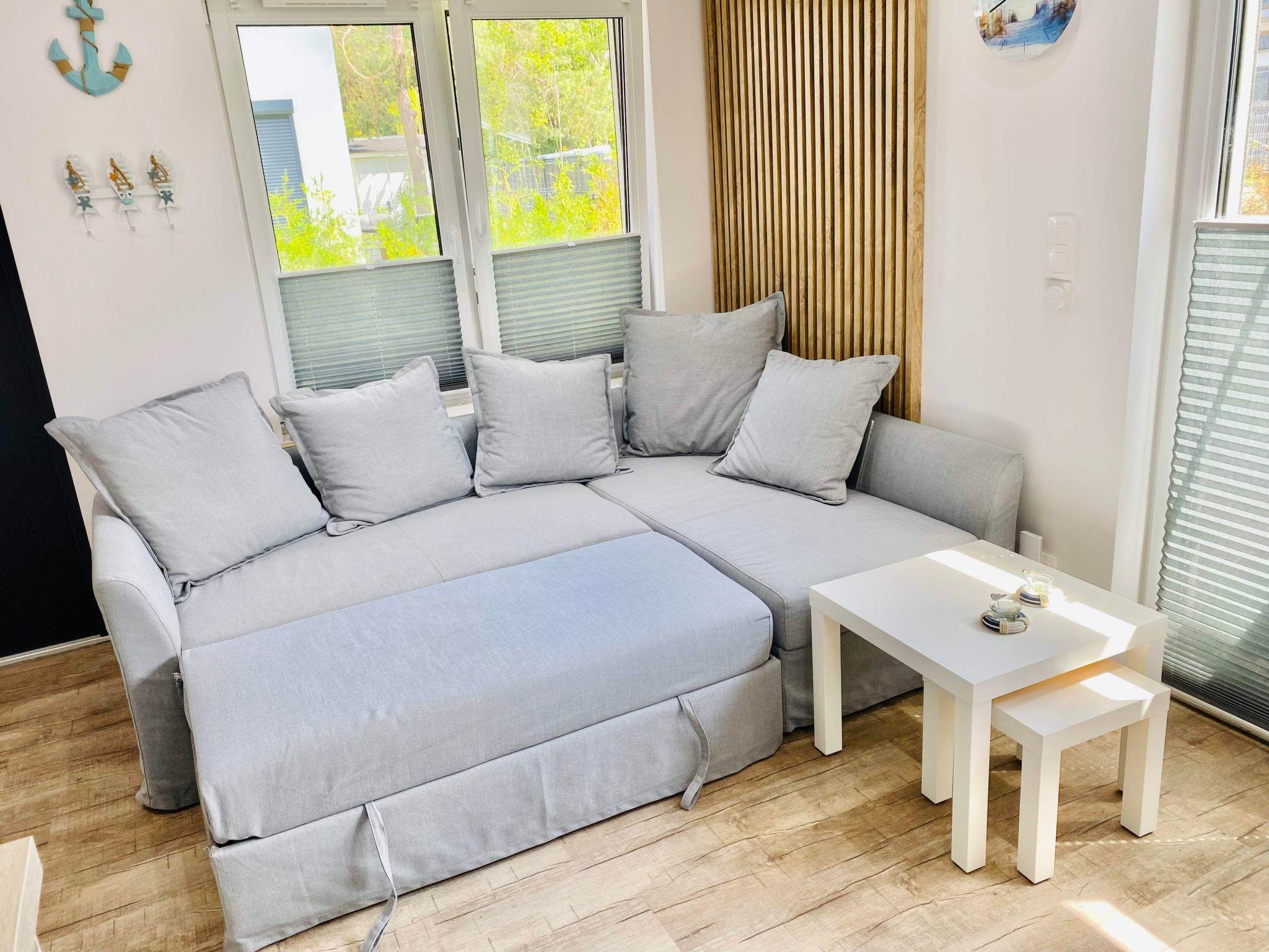 The 46 square metre flat house offers space for up to 6 people on 2 floors. On the brightly furnished ground floor you will find the living area, kitchen, dining area and bathroom. From here you can access the large private garden via the patio door, which invites you to sit and relax on the terrace with cosy lounge furniture and a large barbecue. As the garden is fully fenced, it is ideal for families with children and dog owners.