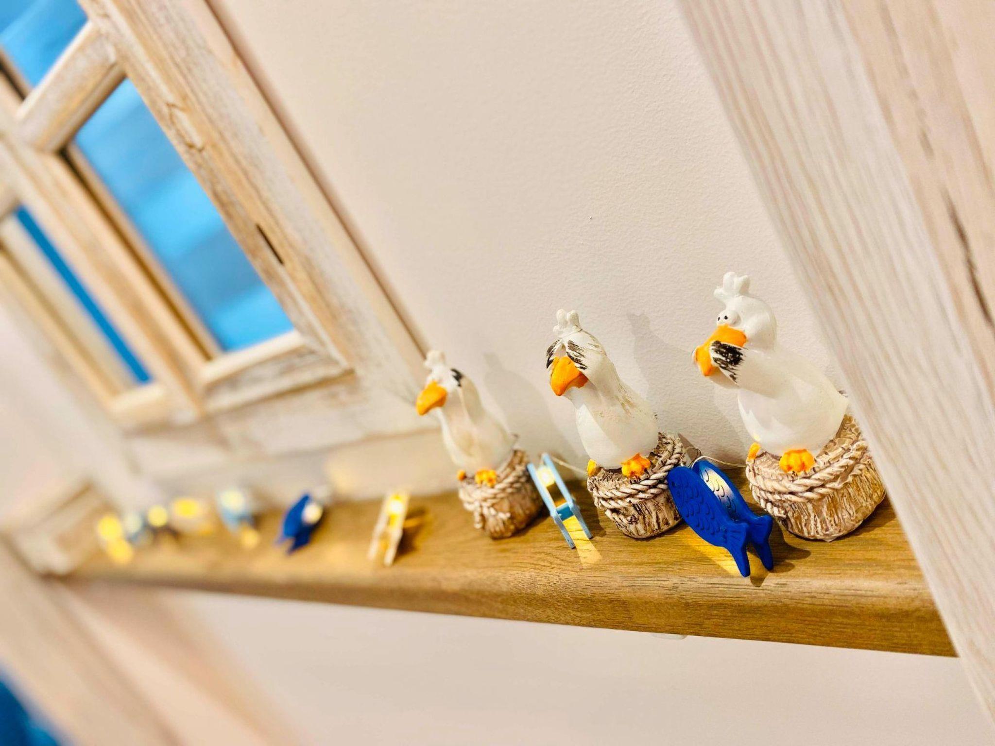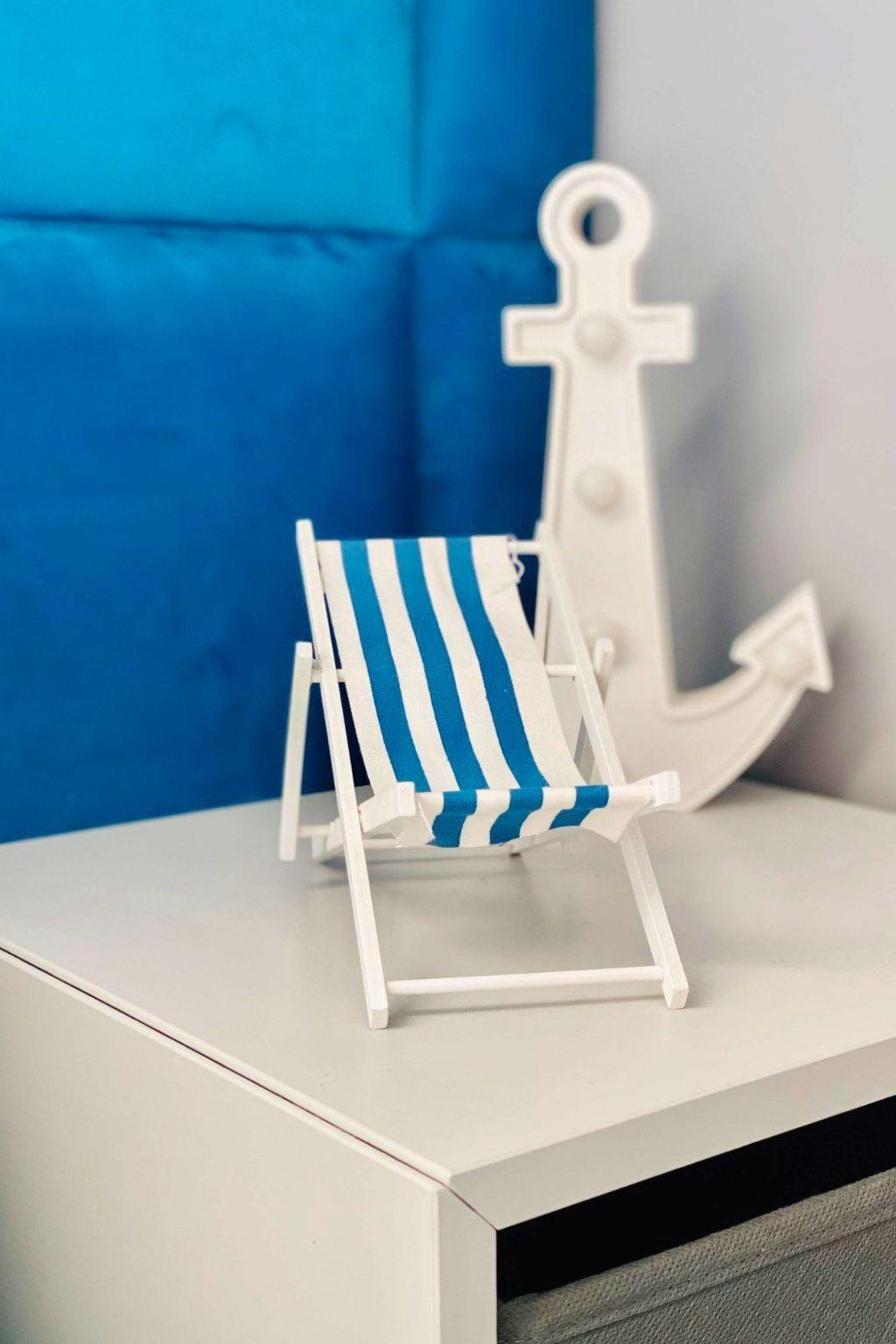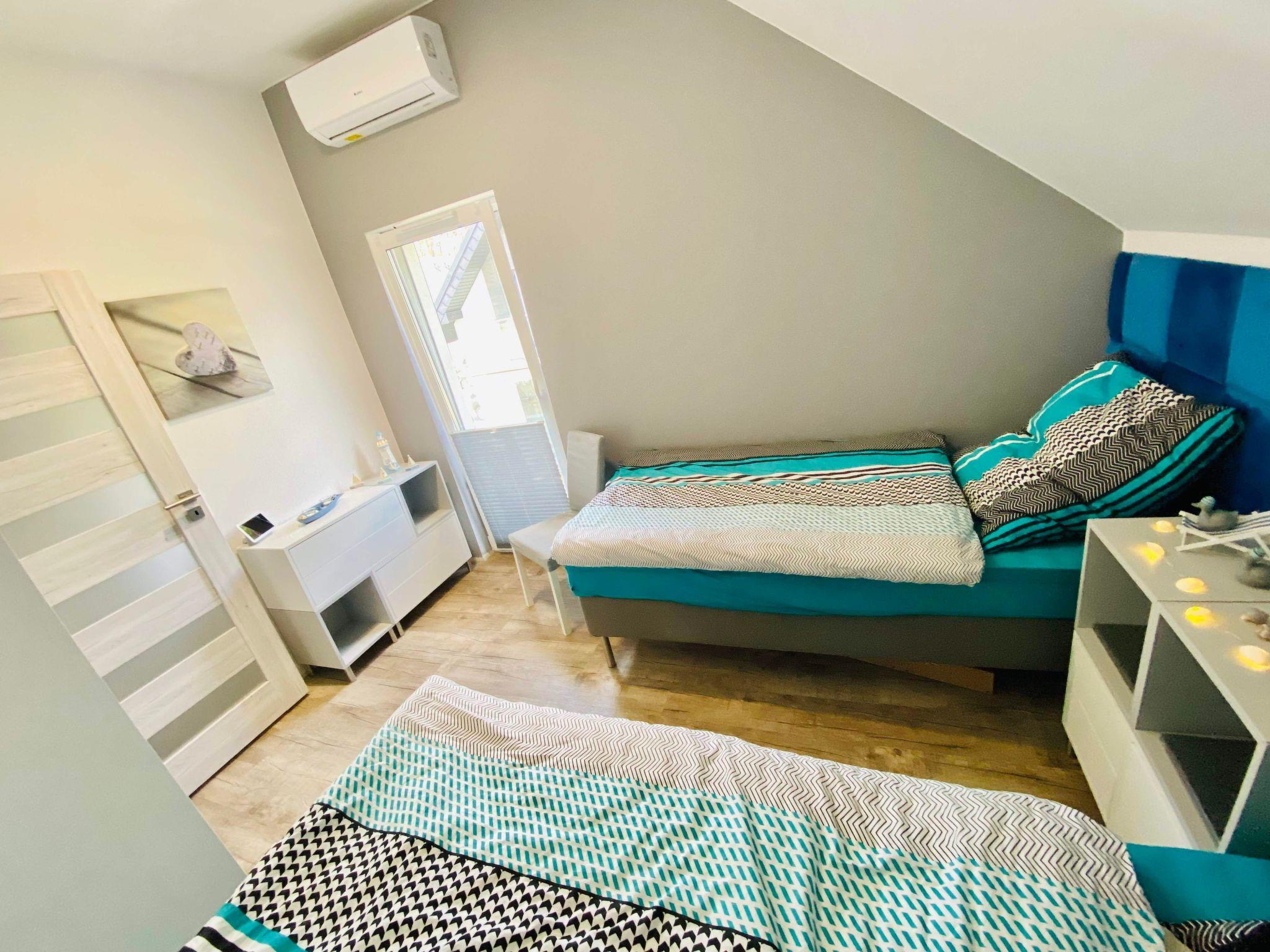 A staircase takes you to the 1st floor, where 2 separate bedrooms in a maritime style await you. The 4 beds can each be set up as a single or double bed and a large wardrobe guarantees space for all your belongings.