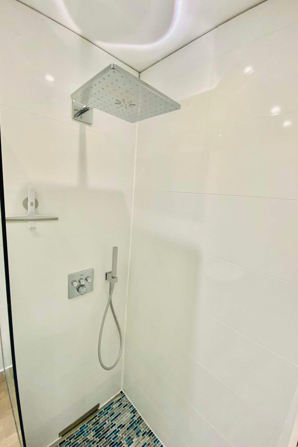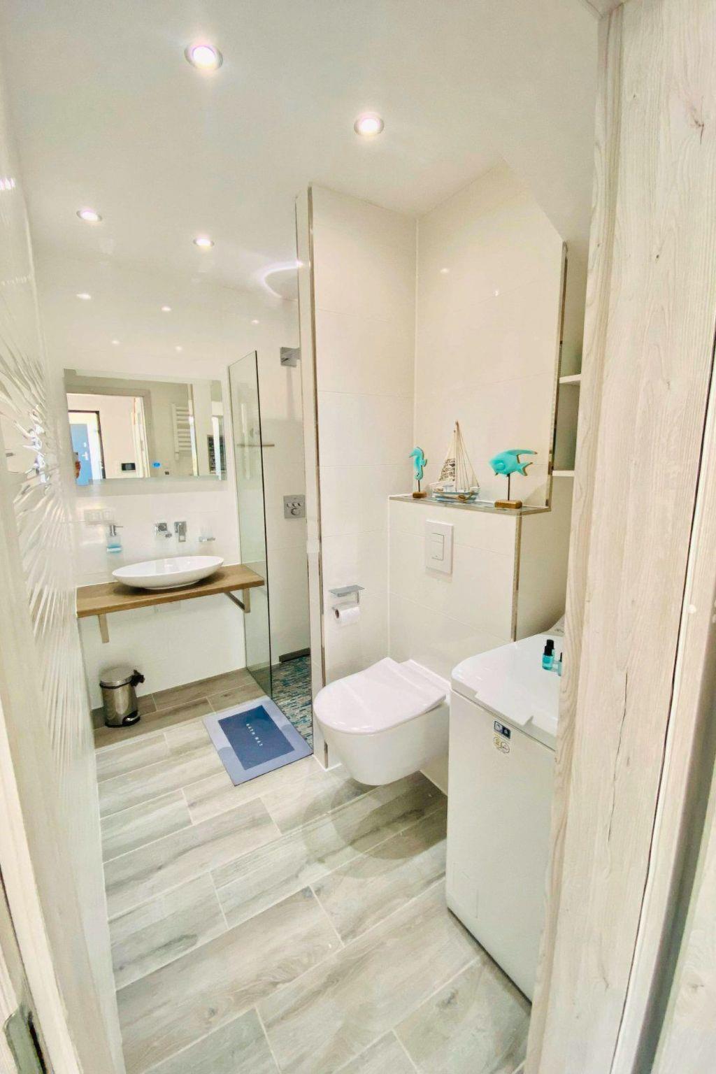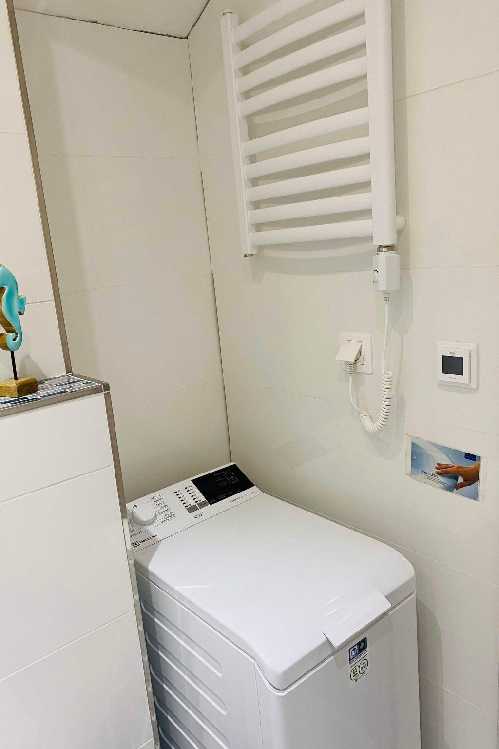 Washbasin, heated mirror with light, WC, experience shower with modern control panel, hairdryer, washing machine, underfloor heating, smart light control, towels