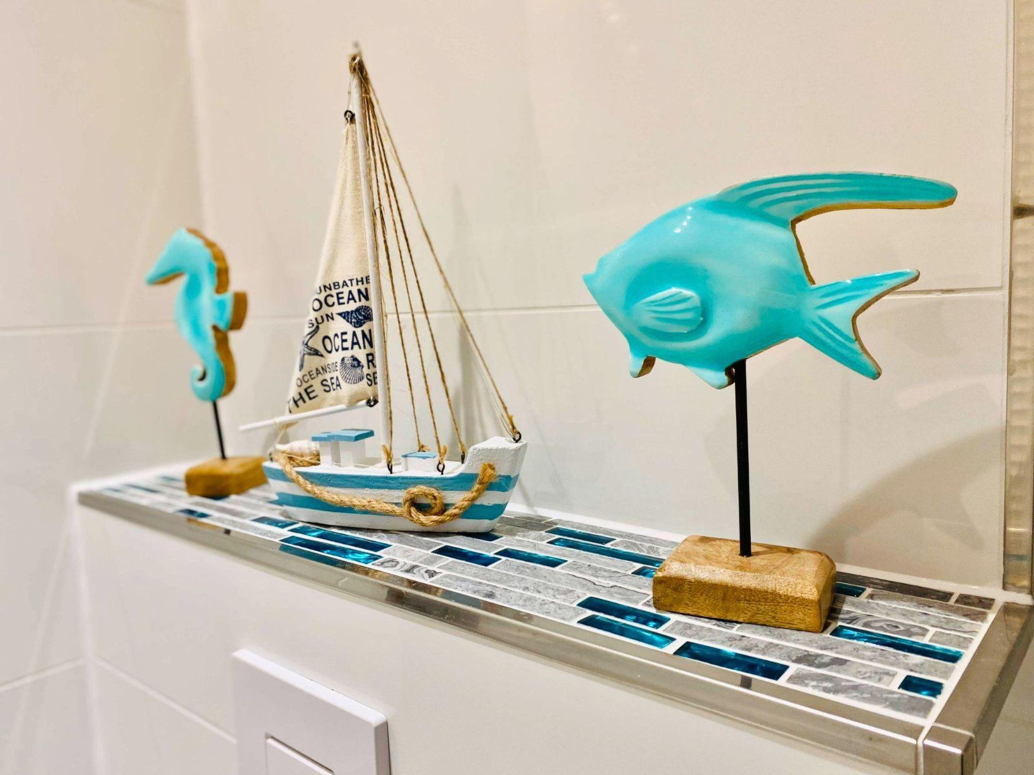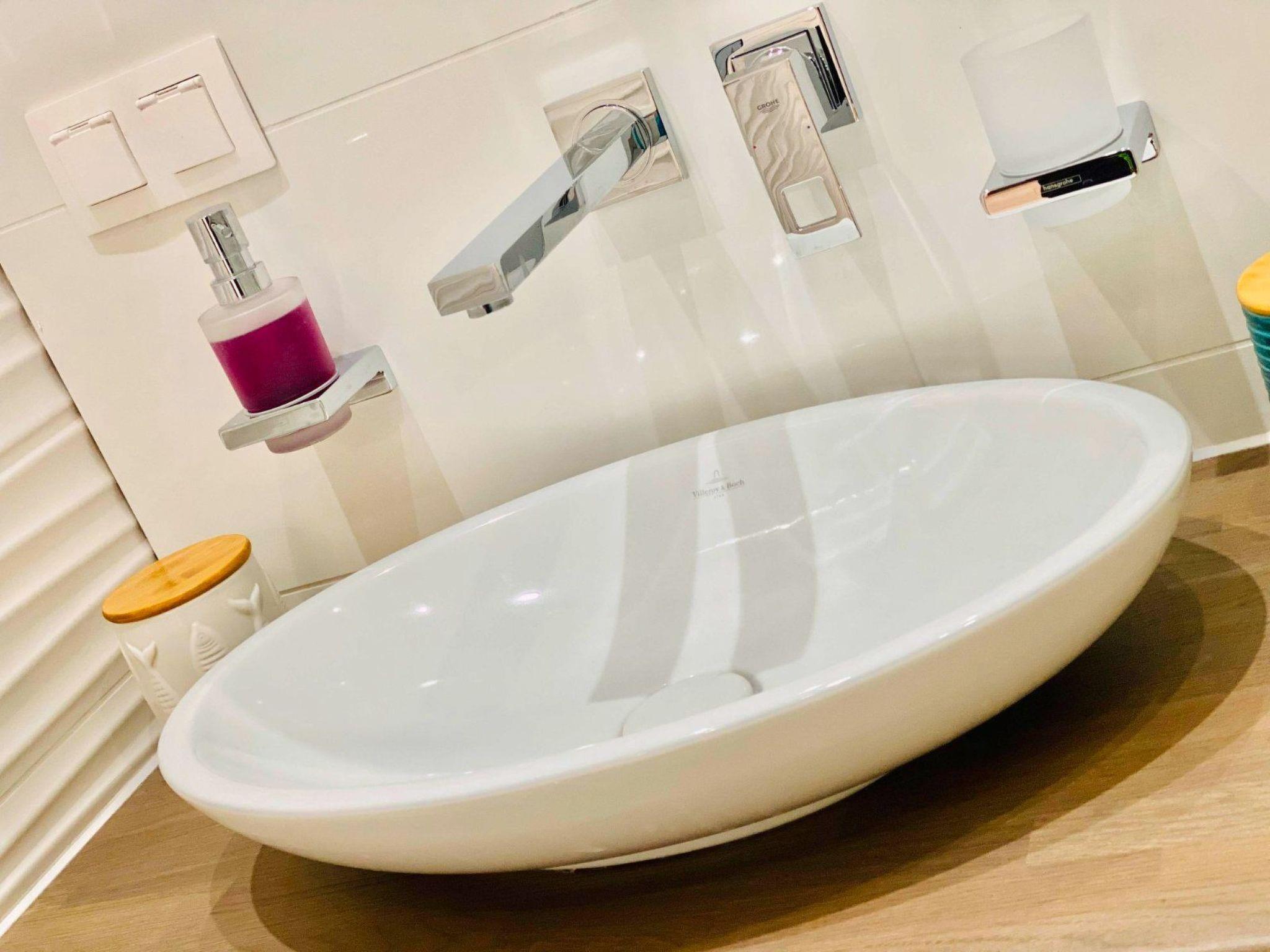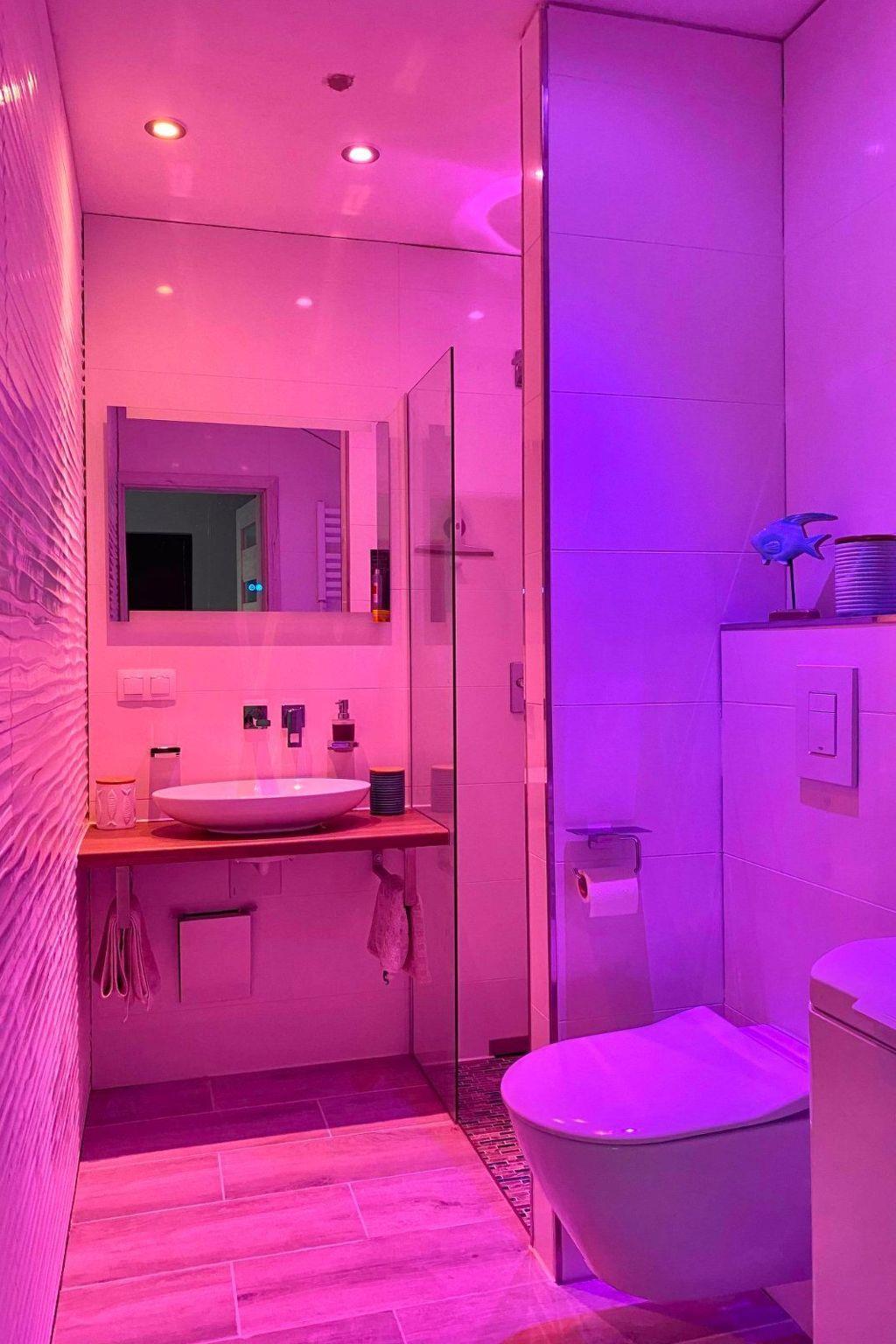 Washbasin, heated mirror with light, WC, experience shower with modern control panel, hairdryer, washing machine, underfloor heating, smart light control, towels
