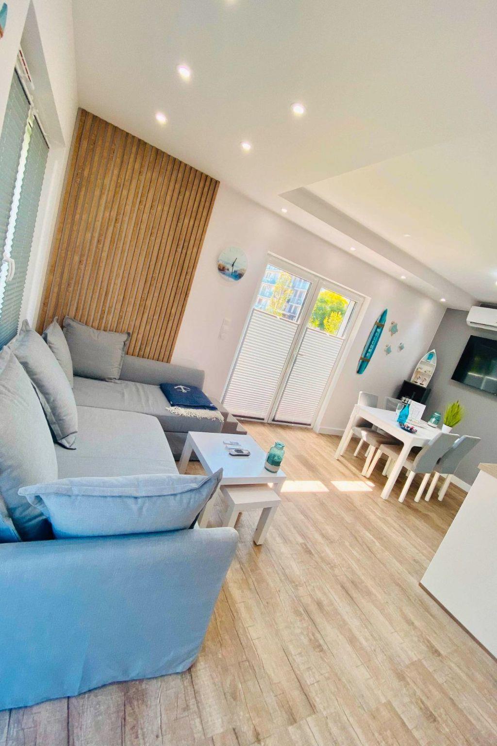 Large sofa (with sleeping function), 2 coffee tables, TV (HDTV - Apple TV with Netflix and Disney Plus), exit via the terrace to the garden, air conditioning, smart lighting control, free WiFi