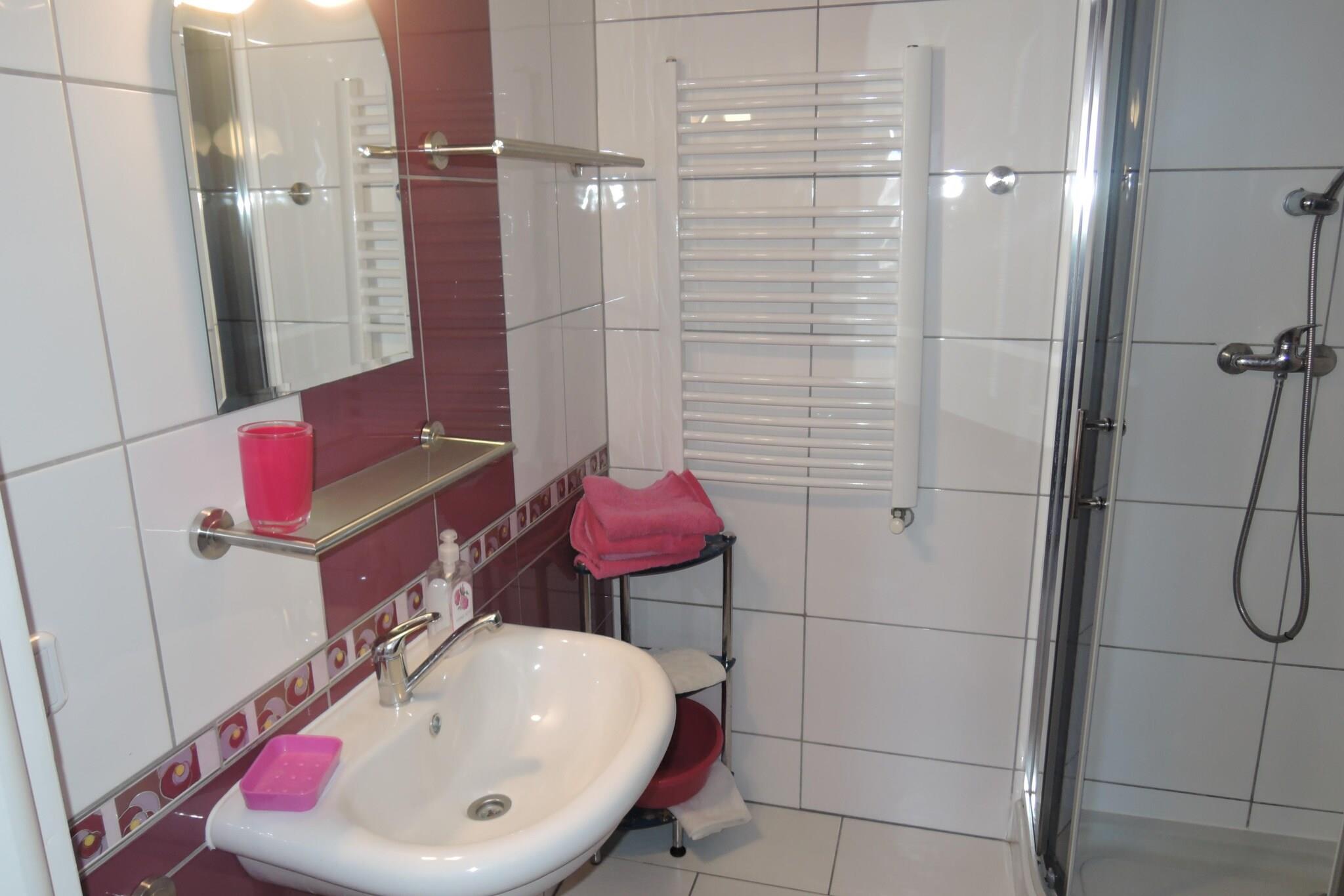 På 2. etage: (åbent køkken(elkedel, cooker, brødrister, espressomaskine, mikrobølgeovn, køleskab), Stue/soveværelse(dobbeltsovesofa, spisebord), soveværelse(enkeltseng, enkeltseng, Fjernsyn(Tyske TV-kanaler)), badeværelse(bruser, håndvask, toilet)) Internetadgang, terrasse(deles med andre gæster, 25 m2), parkering