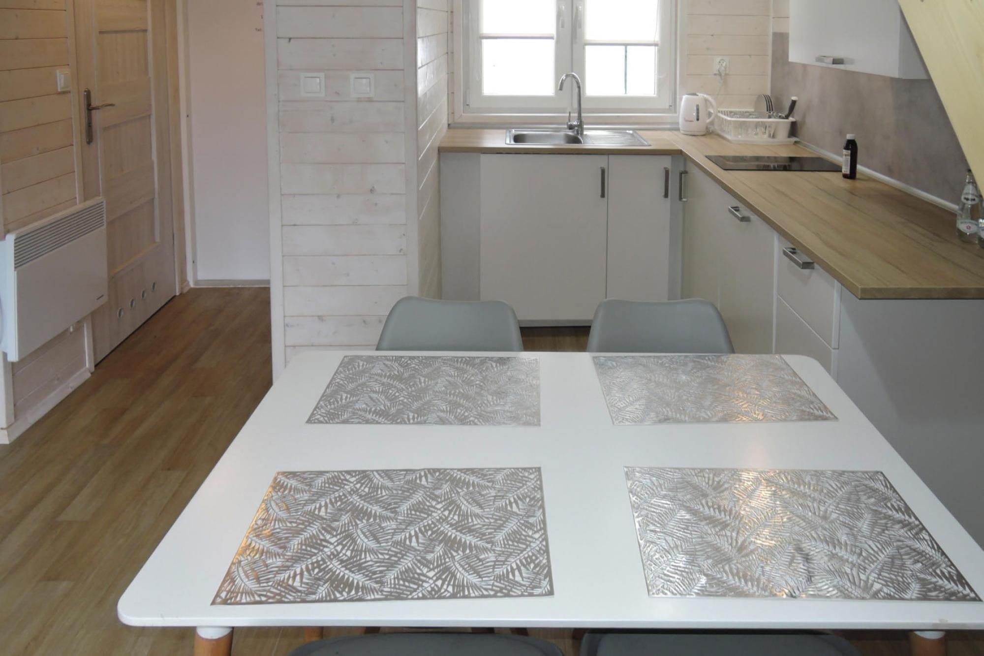 Stueetage: (åbent køkken(spisebord, kogeplade(Komfur med to kogeplader, elektrisk), elkedel, kaffemaskine, køleskab), Stue/soveværelse(dobbeltsovesofa, Fjernsyn(parabol, Tyske TV-kanaler)), badeværelse(bruser, håndvask, toilet)) På 1. etage: (soveværelse(dobbeltseng), soveværelse(2x enkeltseng)) grill, varme(elektrisk), terrasse, havemøbler, sandkasse, legeredskaber, barnestol, Gyngestativ, baby crib(free)