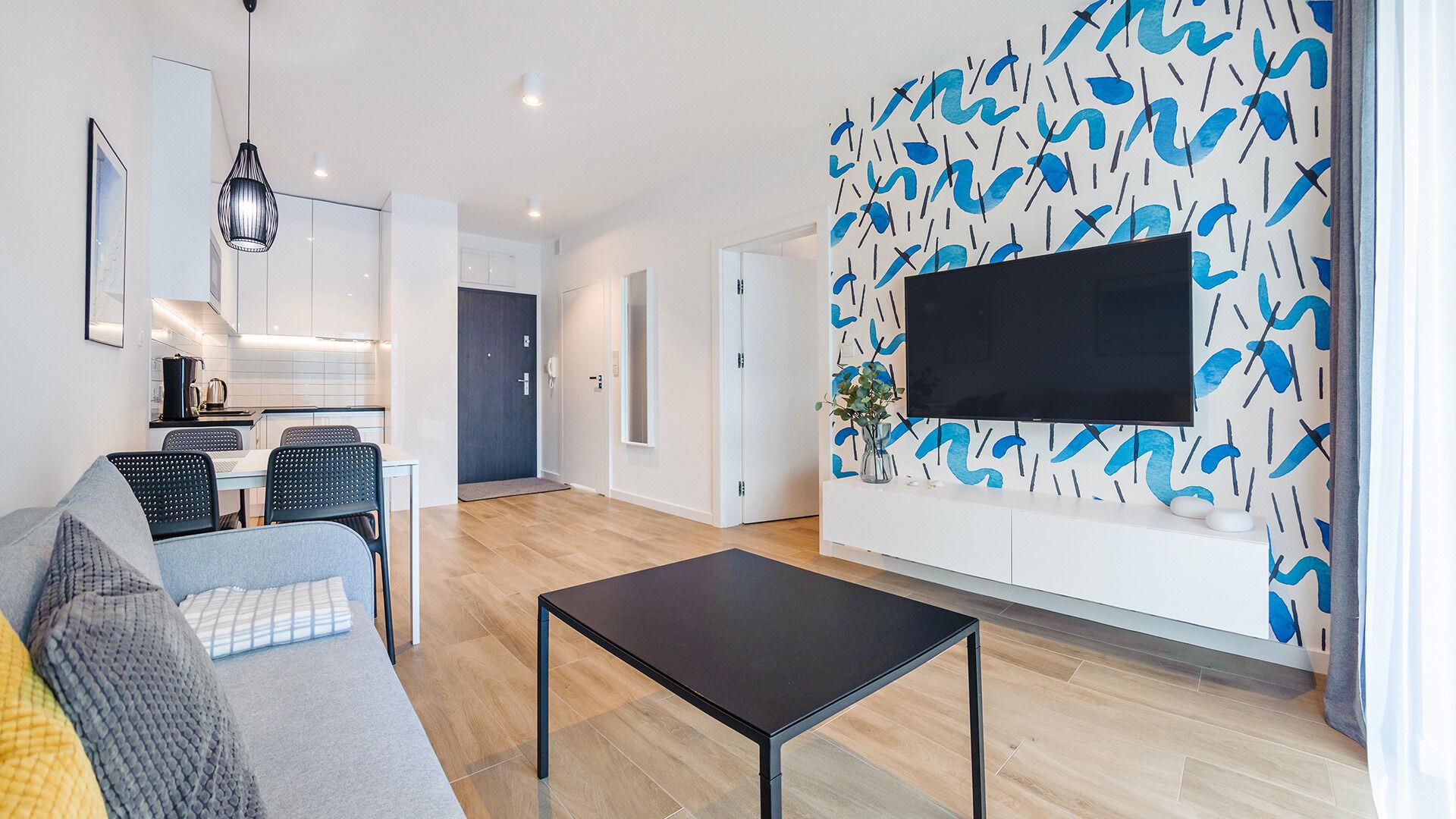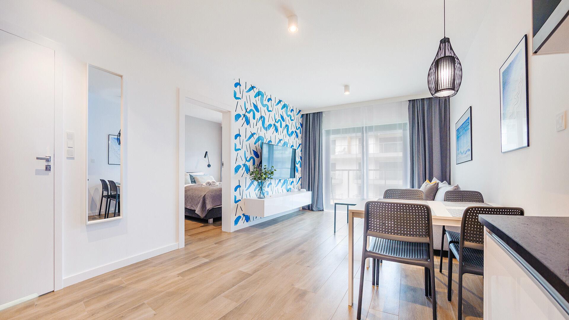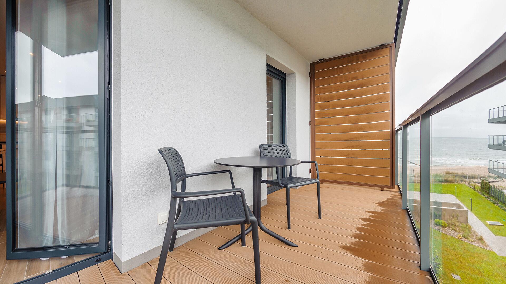 Nur 100 Meter trennen die Apartments vom breiten, sandigen Strand – ideal für Sonnenanbeter ebenso wie für ausgedehnte Spaziergänge entlang der Küste. Das Rauschen der Wellen und die frische Meeresbrise schaffen eine unvergleichliche Atmosphäre, die zur vollkommenen Entspannung einlädt.