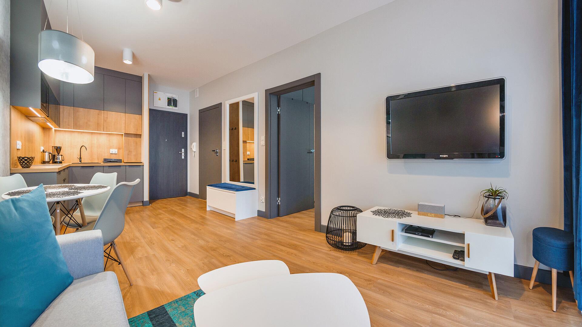 • Haustiere sind in der ausgewählten Wohnung erlaubt. Die Kosten für den Aufenthalt mit einem Haustier betragen 40 PLN pro Tag.