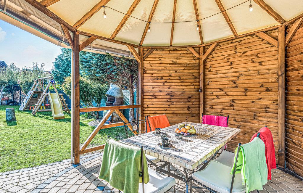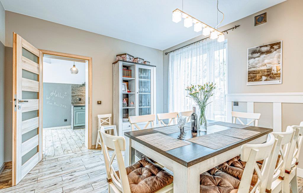 Dette indbydende indrettede dobbelthus ligger i Grzybowo, nabo til badebyen Kolobrzeg. Huset er fordelt på tre etager, i stueplan med kombineret spise- og opholdsstue, et åbent køkken og badeværelse. På første sal er der tre soveværelser og husets badeværelse no to. Det fjerde soveværelse ligger på øverste etage, med adgang ad en stejl trappe. I haven er der to parkeringspladser, den ene under åben himmel, den anden i en garage. Verandaen deles med naboen. Huset ligger i et roligt område og ikke langt fra havet. Det er muligt at arrangere rideundervisning i området.