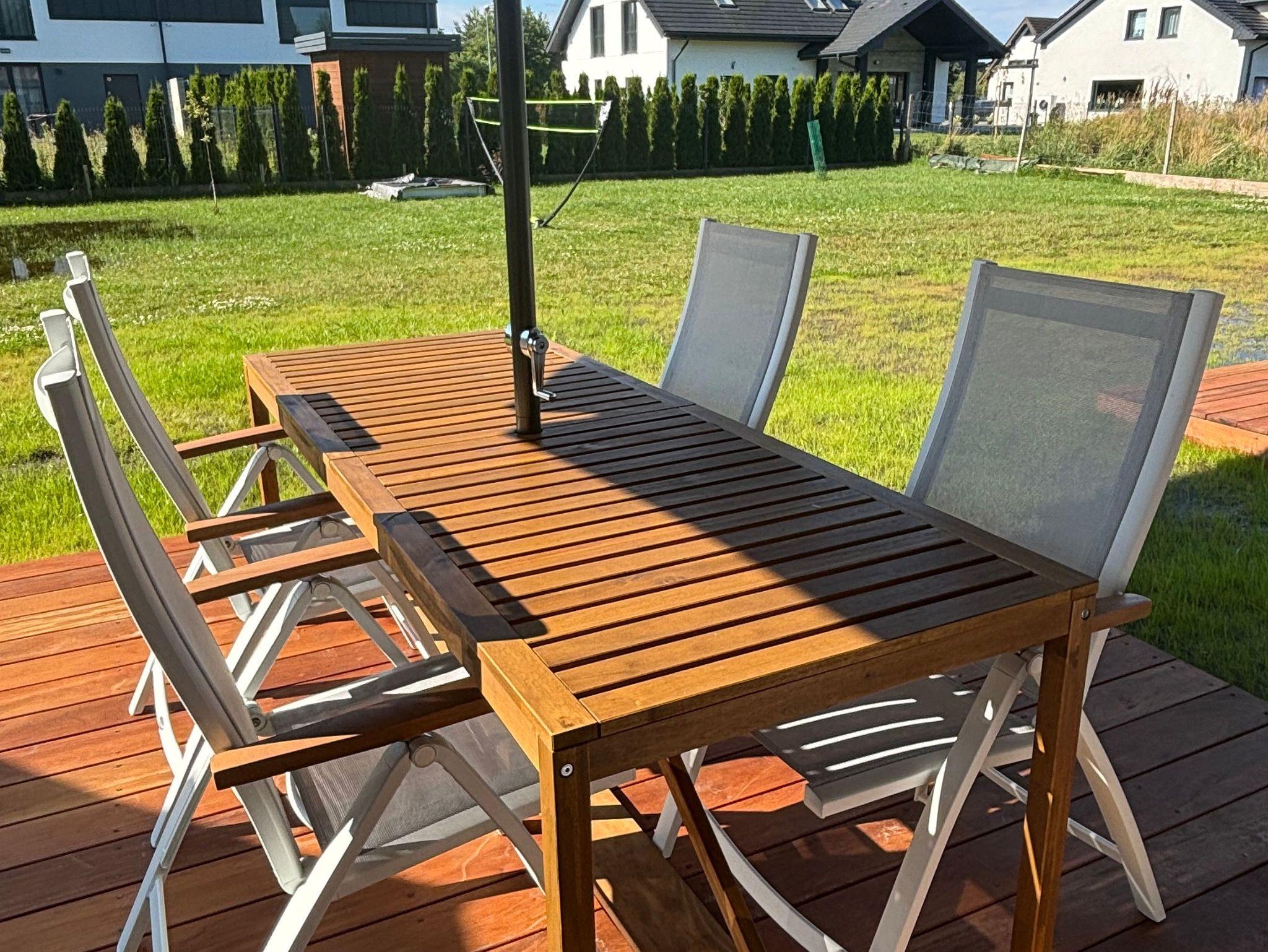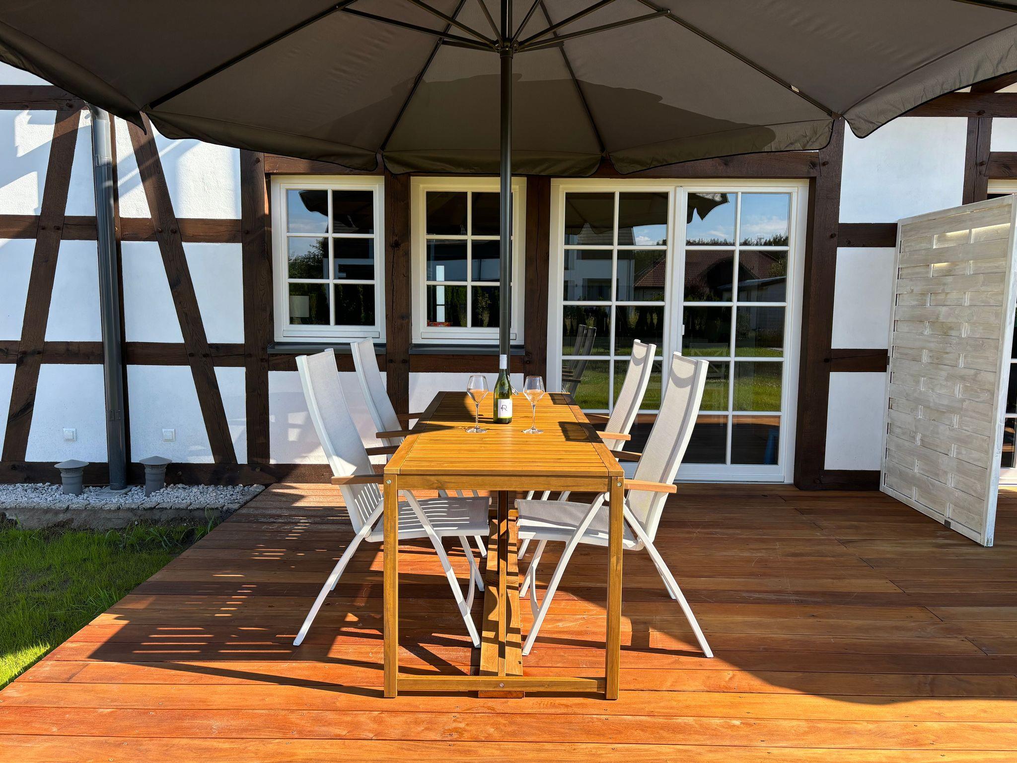 • Holzterrasse mit Ausgang vom Wohnzimmer, ausgestattet mit Tisch und Stühlen, perfekt für den Morgenkaffee oder die abendliche Entspannung