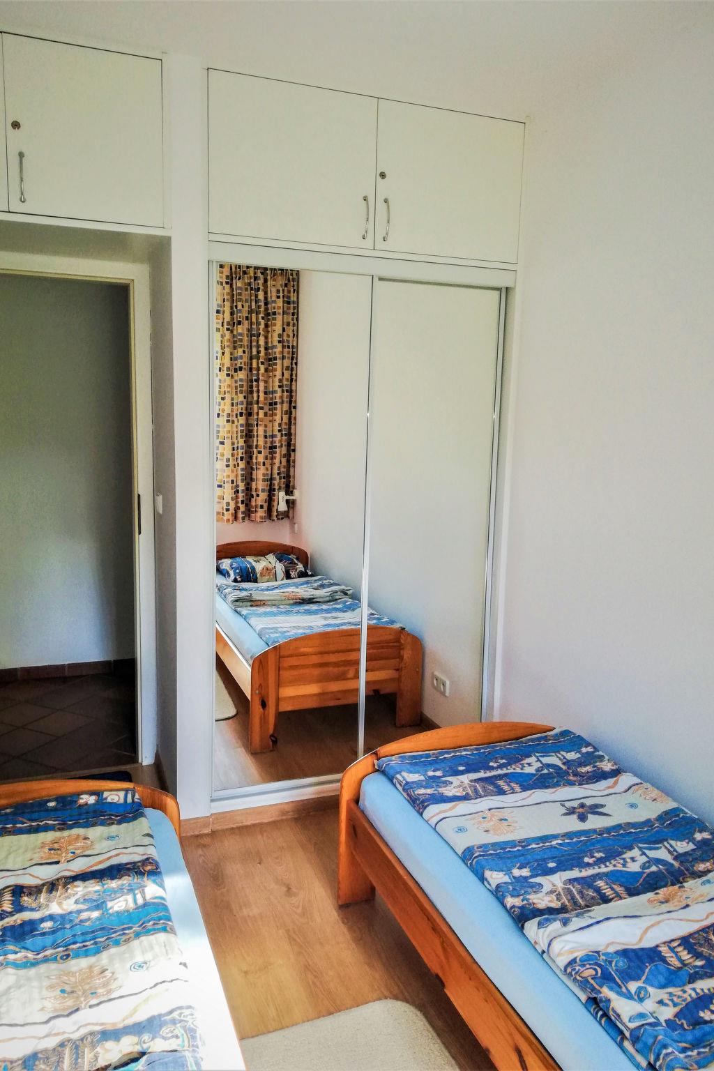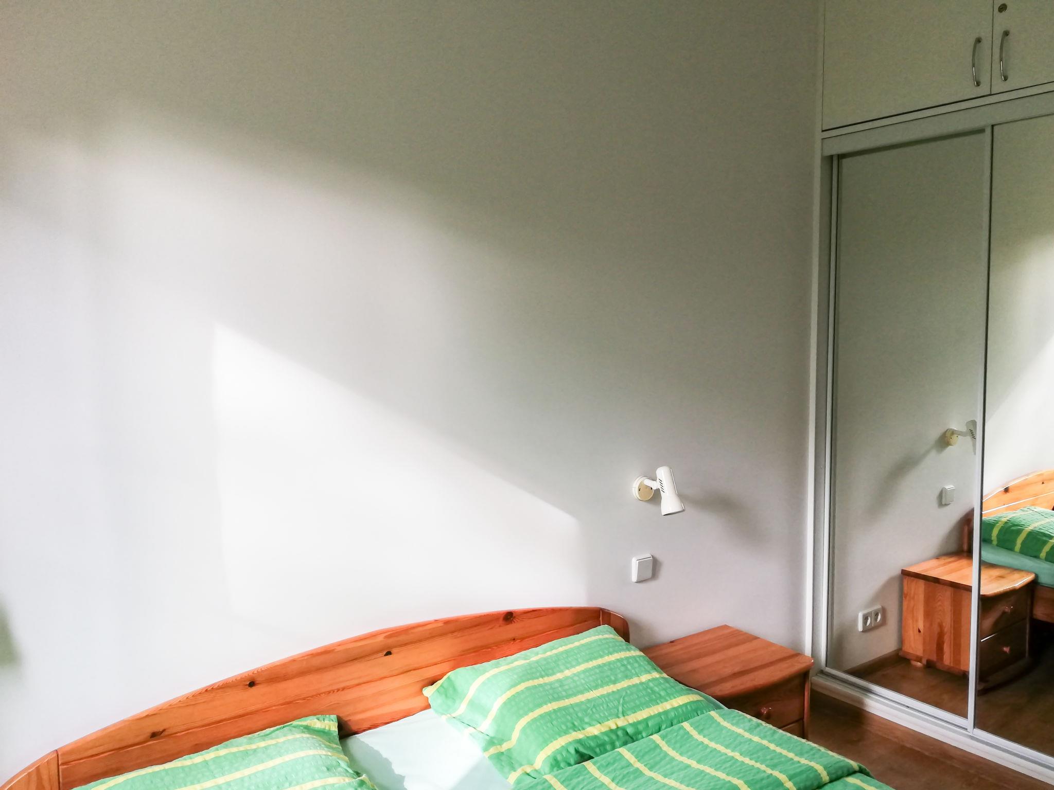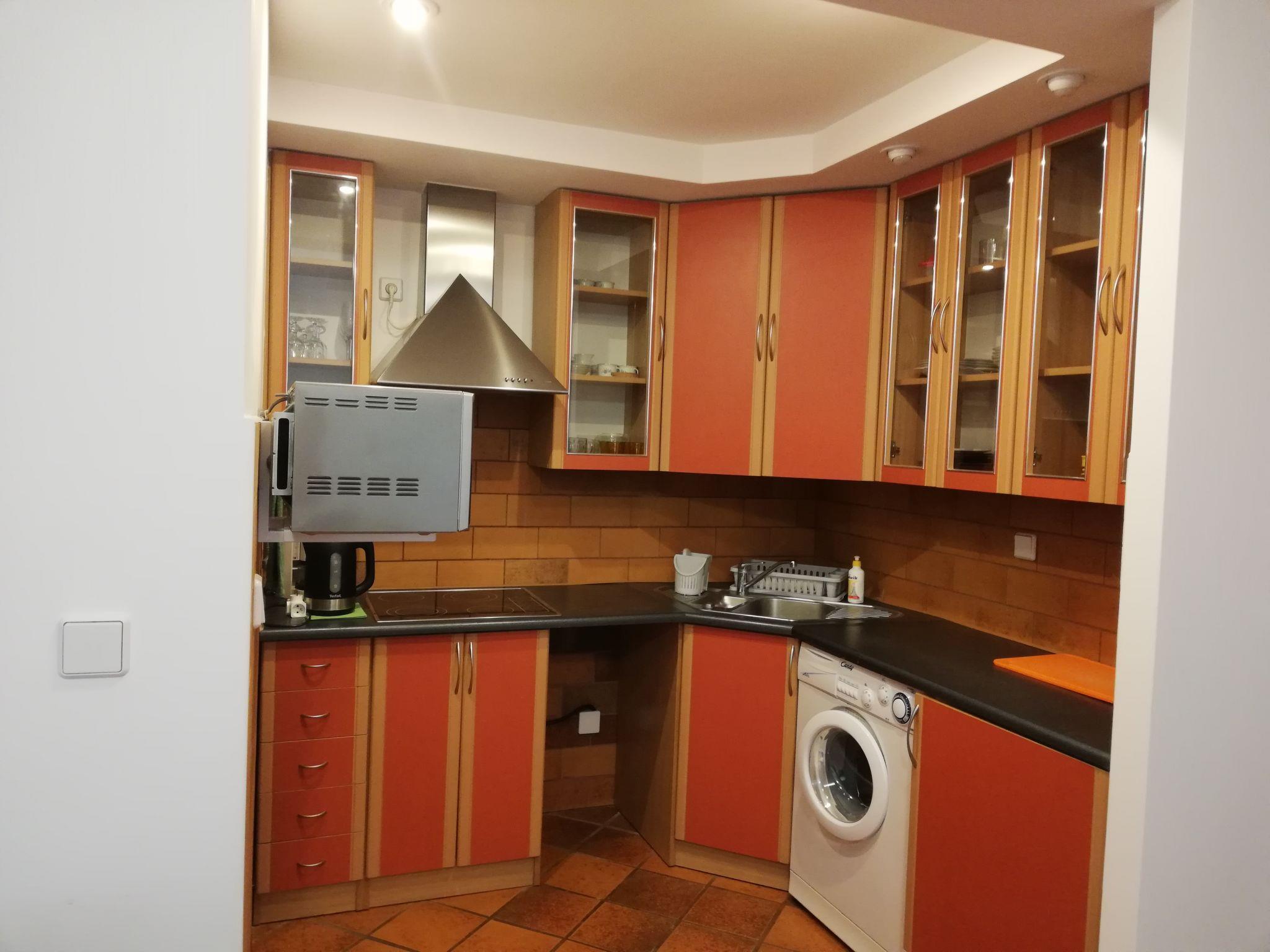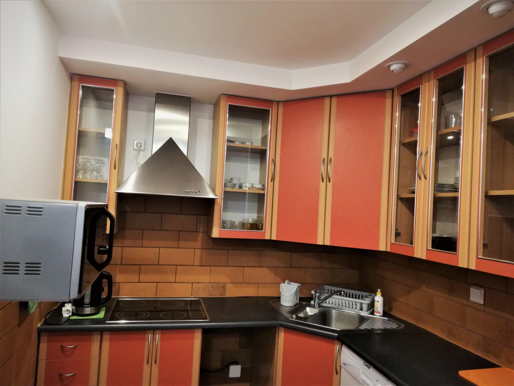 3-room apartment 55 m2, on the upper ground floor. Bright: entrance hall 6 m2. Living/dining room 19 m2 with 1 double sofabed and TV (flat screen), radio and CD-player. Exit to the terrace, south facing position. 1 room with 2 beds (90 cm, length 200 cm). 1 room with 1 french bed (160 cm, length 200 cm). Open kitchen 4 m2 (4 ceramic glass hob hotplates, microwave, electric coffee machine). Shower/bidet/WC. Electric heating. Terrace furniture. Facilities: washing machine, dryer, iron, mosquito net. Internet (WiFi). Garage. IMPORTANT: Deposit 1000 PLN. Available also: ironing board.